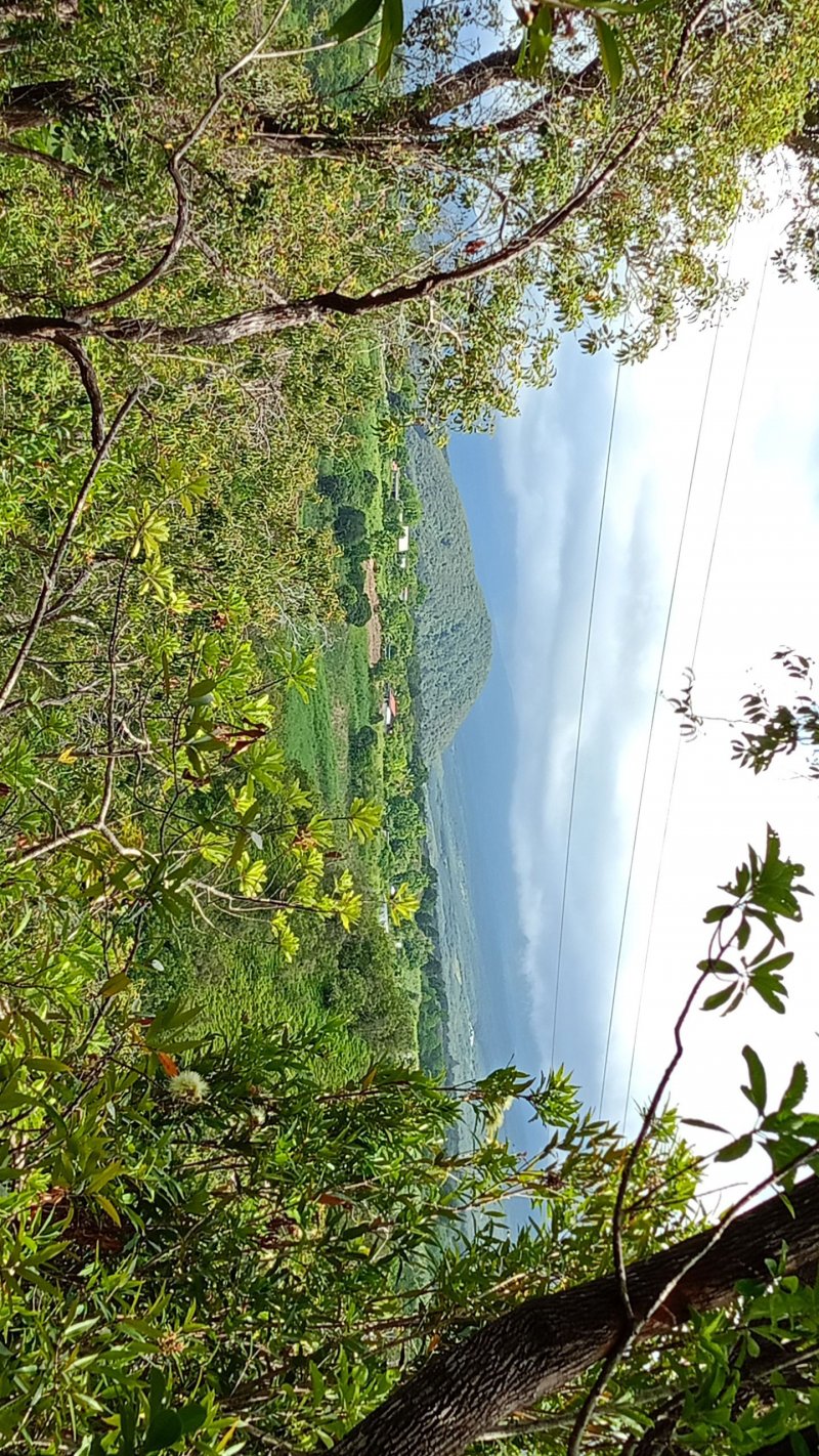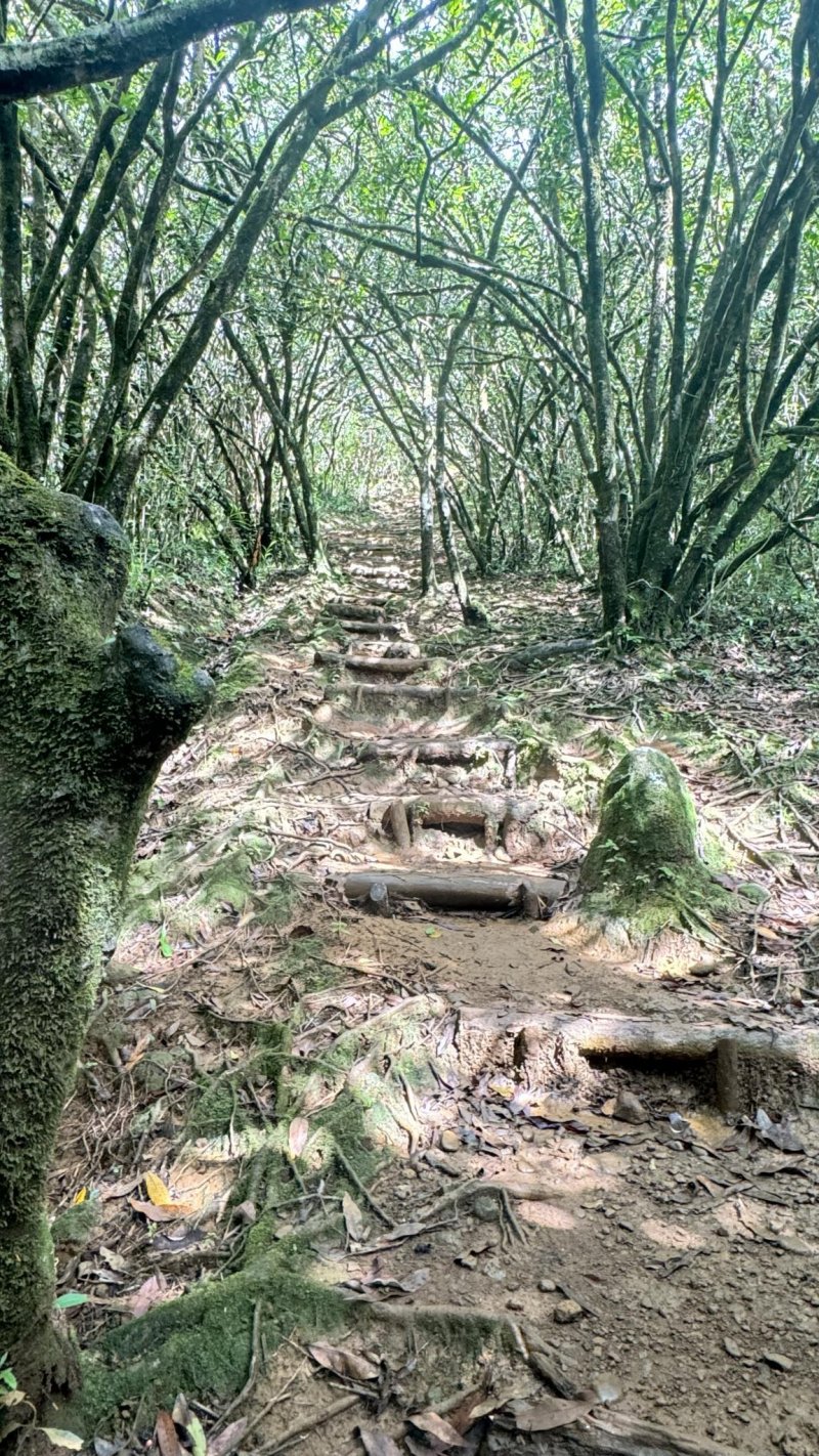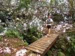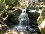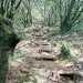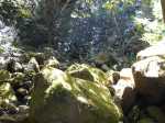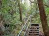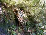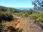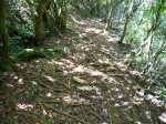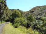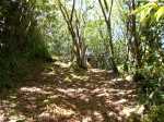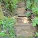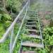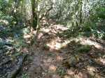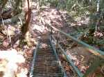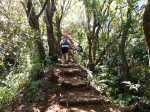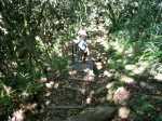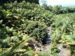 Les mathématiques permettent même d'autres combinaisons. L'aire de pique nique est très bien entretenue et les kiosques ou tables entourés d'herbe rase (Photo 1). Pas de problème pour utiliser la route car elle est étroite et sans beaucoup de circulation. La piste qui remonte en lacets à partir du point 175 est large et le plus souvent bordée de jamrosats penchés créant un tunnel souvent sombre (Photo 2). La terre peut y être glissante s'il a plu. Le long escalier qui remonte au milieu de la boucle est également en très bon état (Photo 6). Il comporte d'innombrables marches en bois, rarement hautes mais toujours construites sur une forte pente entre les arbres et des touffes de ravenales en éventail qu'on trouve plutôt dans nos jardins ou parcs. Une fois au plus haut, quelques trouées dans la végétation permettent de beaux points de vue sur la campagne avoisinante, montagneuse et boisée d'un côté (Photo 5) ; cultivée presque jusqu'à la mer de l'autre. Le chemin large qui passe en haut du circuit est très agréable et comporte peu de difficultés. On y retrouve les tunnels végétaux et on marche souvent sur un tapis de racines (Photo 13) avant de traverser le Bras Baptiste (Photo 10) et une première fois le Bras Batardeau. Commence alors une très longue descente sur de nouvelles marches ou sur des roches. La ravine est toujours proche et le bruit de petites chutes attire l'attention puis le regard (Photo 22). En prenant garde de ne pas glisser sur les rochers du fond de la ravine, on peut toutes les approcher. Les passages les plus techniques sont remplacés par des escaliers métalliques pourvus de rambardes rendant cette descente presque ludique (Photo 16).