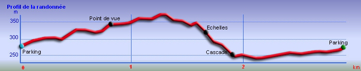 Parcours B, plus difficile : Monter les escaliers dès le parking et redescendre à gauche par la piste ombragée vers la route puis revenir au parking pour reprendre la montée par les marches et terminer par la droite la boucle avec la descente du Bras Batardeau.