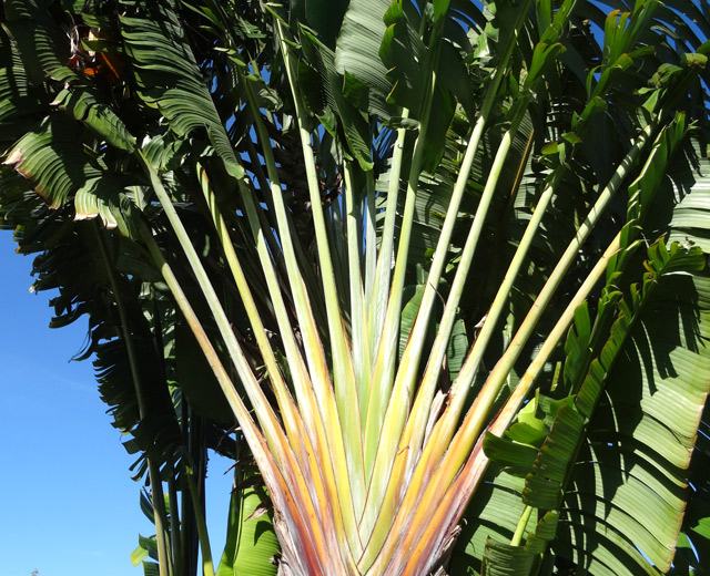 L'arbre doit son nom, ainsi que son nom anglais "traveller's tree" au fait que la base naviculaire des feuilles disposées de façon dense renferme environ 1,5 litres de liquide que l'on peut recueillir en cas de besoin en perçant la base des feuilles.
