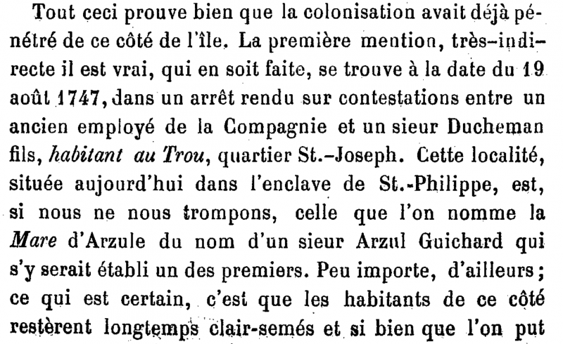 dans Simples Renseignements sur l'île Bourbon d'Elie Pajot 1878, l'origine du toponyme mare d'Arzule est donnée page 96.
