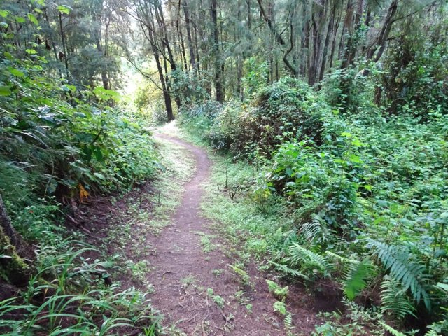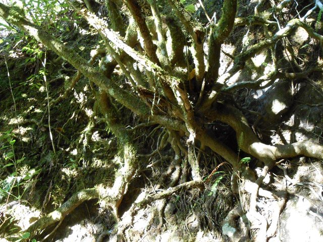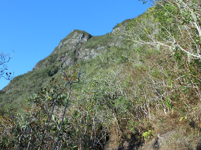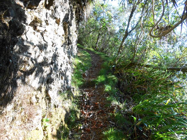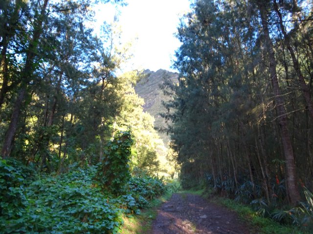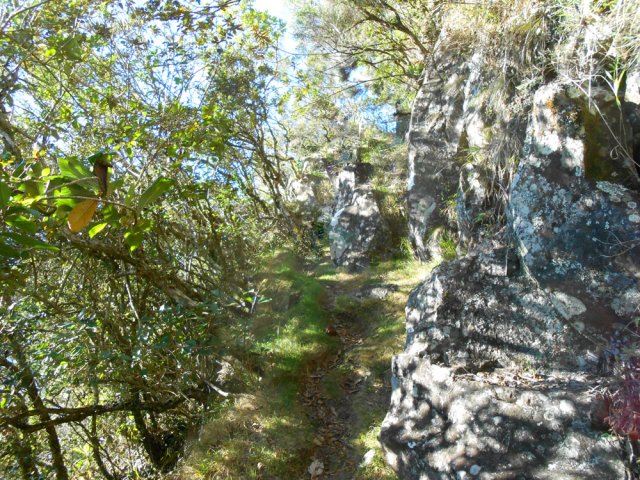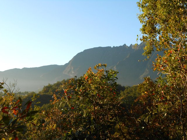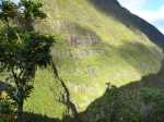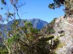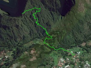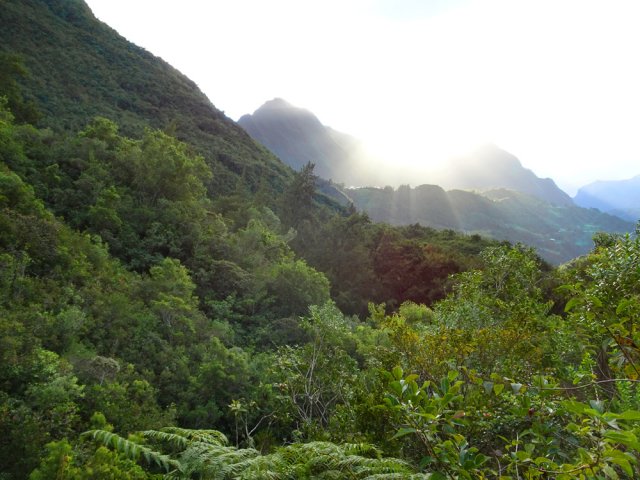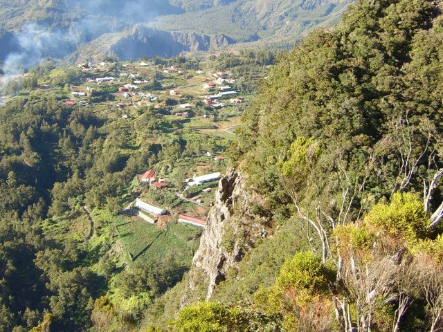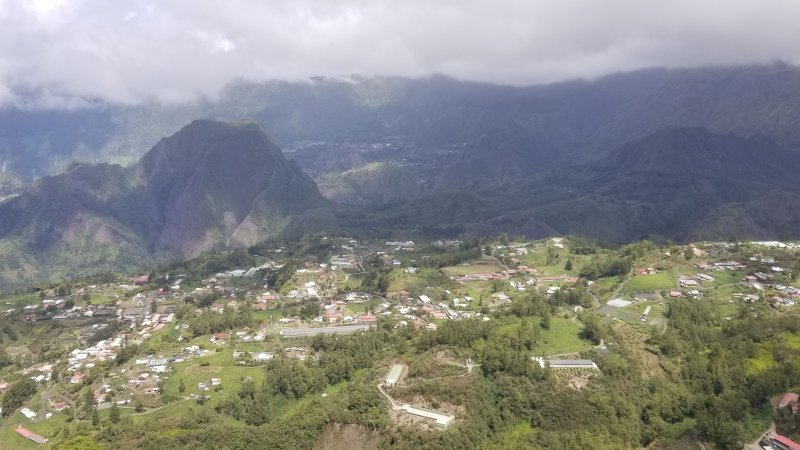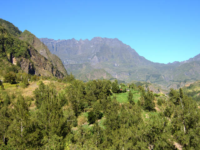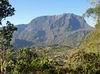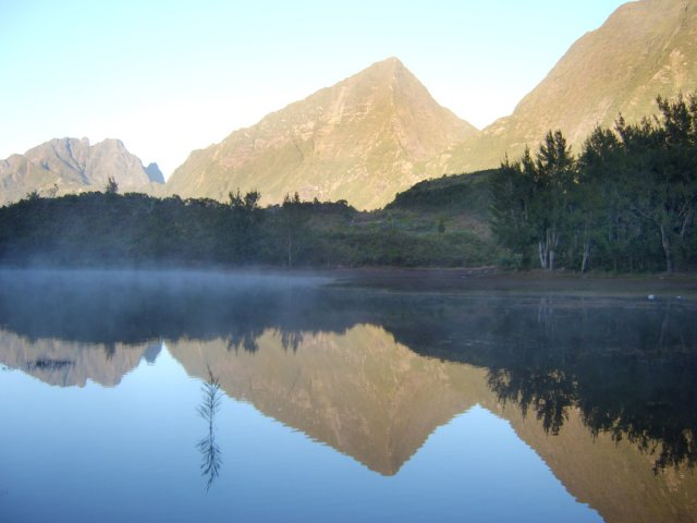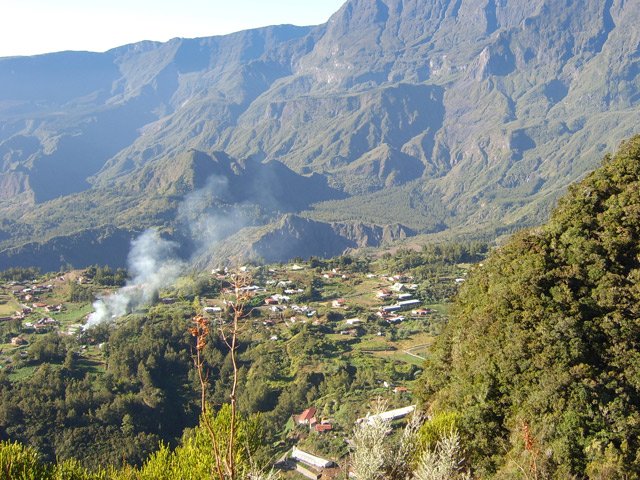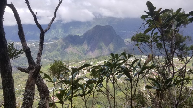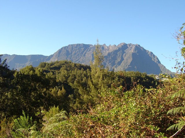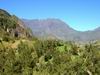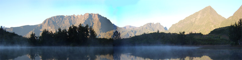 La randonnée débute une centaine de mètres avant la Ravine Roche à Jacquot, sur la route de la Mare à Martin. Avant le départ, au petit matin, ne pas hésiter à rouler un peu vers la Mare à Martin et stationner près de la mare. Elle est insignifiante mais permet de beaux clichés quand la brume s'envole au petit matin et que les pitons s'y reflètent (Photo 1). La piste est facile à repérer. Elle passe devant quelques cases et traverse des bois de filaos (Photo 3) ou des zones couvertes de chouchous qui ont tendance parfois à encombrer le passage. Les vignes marronnes et les longoses ne sont pas en reste pour tenter d'envahir la piste. Puis ce sont les jouvences, humides au petit matin, qui mouillent les chaussures. Les petits panneaux assez nombreux qui indiquaient la fenêtre ont en partie disparu mais il est difficile de s'égarer sur cette agréable piste en pente douce. Un regard vers le haut du rempart permet de repérer la Fenêtre au pied du Cimendef (Photo 3). De la piste, on a l'impression d'une muraille mais le sentier en lacets facilitera cette montée. On rejoint la Ravine Roche à Jacquot formée depuis moins de 50 mètres par la réunion de la Ravine Sèche et de la Ravine Casabois. Plus loin, une passerelle enjambe un affluent de la Ravine Casabois avant de pénétrer sous les grands filaos qui occupent une surface importante aux limites du Parc National (Photo 5). Très vite la muraille du rempart arrive et la montée débute sur le sentier en lacets courts et serrés aux marches consolidées par des rondins de bois (Photo 6). On retrouve bien évidemment les goyaviers qui envahissent lentement mais très sûrement la Réunion (Photo 7). L'inconvénient a ses avantages en juillet lorsque les fruits sont mûrs. Le sentier ne comporte pas trop de fortes pentes puisque les lacets sont parfois assez longs (Photo 8). Les premiers panoramas sur la Mare à Vieille Place, Grand Îlet et le Piton Plaine des Fougères apparaissent avec le soleil à l'horizon si on est parti tôt (Photo 9). Le Gros Morne se dévoile également mais on le verra dans sa totalité au sommet (Photo 10). Hormis les goyaviers, on retrouve ici la végétation classique du cirque: fougères, branles verts, lantanas, bois de couleurs ou bois de chandelle qui ne masquent pas totalement le paysage vers le Piton d'Anchain (Photo 11). La montée est surtout constituée de lacets faciles à négocier (Photo 13). Quelques parties plates, très courtes, permettent de reprendre son souffle (Photo 16). Des portions rocheuses nécessitent de très courtes escalades parfois glissantes. Des marches aident également à franchir les parties les plus pentues (Photo 17). Le sentier effectue un long détour vers la droite avant de revenir plein sud en direction de la Fenêtre. Les vues sur le Gros Morne s'élargissent (Photo 18). Le Piton d'Anchain ne cache plus le gîte de Bélouve qu'on devine à l'horizon au pied du Mazerin (Photo 19). La pente s'accentue, emprunte des zones bordées d'arêtes rocheuses verticales (Photo 20). Le sentier, très étroit par moments, est alors bordé de ces falaises de plus en plus présentes (Photo 21). Des marches taillées à même la roche permettent de grimper plus facilement même si la pente est encore forte. Les bois de couleurs et les branles l'emportent sur le reste des végétaux et les points de vue sont plus rares. On profite cependant des principaux pitons dans les trouées végétales, dont l'imposant Gros Morne. Puis la pente cesse en arrivant à la Fenêtre (Photo 23). De l'autre côté, au cœur du cirque, le Piton d'Anchaing dépasse au-dessus des nombreux villages. Celui de Grand Îlet, vu d'ici, semble très vaste (Photo 24). Les falaises rocheuses qui dominent le village font comprendre pourquoi il a fallu tout ce long détour pour arriver ici (Photo 25). La barrière en bois qui marquait le belvédère, vermoulue, a totalement disparu. Attention donc en grimpant sur les rochers pour la classique photo avec le panorama à l'arrière. Un oratoire vieillissant occupe une cavité à l'arrière. Un étroit sentier part à l'assaut de la falaise en direction de la Roche Ecrite mais cesse très vite dans la végétation. Sur la droite, l'impressionnante vallée du Bras de Ste-Suzanne tarde à voir arriver le soleil (Photo 26). Repérer un sentier qui débute près du vide en direction du Cimendef dont on devine le col à nos pieds (Photo 27). Si on décide d'effectuer un jour cette difficile ascension, ne pas hésiter à descendre jusqu'au col pour en repérer le départ. La descente est courte mais déjà beaucoup plus difficile que ce qui vient d'être pratiqué. Du belvédère, on remarque que l'ascension n'est pas à la portée de tous et il vaut mieux faire appel à un guide pour la rajouter à son palmarès (Photo 28). Plus difficile, un sentier beaucoup plus discret, très peu pratiqué, part sur la droite, au col, en direction du Bras de Sainte Suzanne et de Deux Bras. Le retour beaucoup plus facile car tout en descente emprunte le même itinéraire pour rejoindre Grand Îlet.