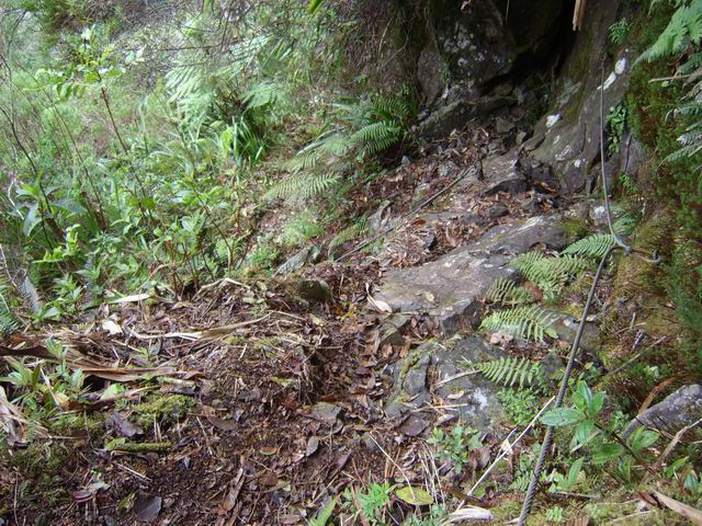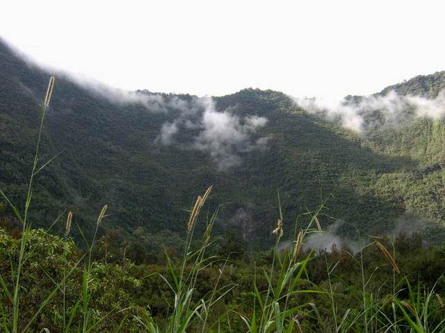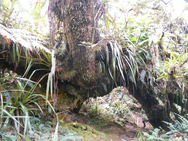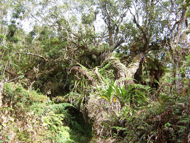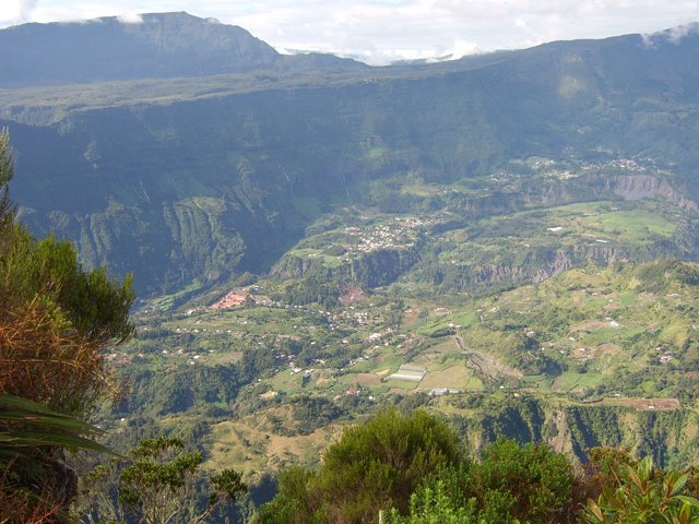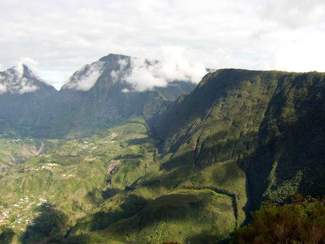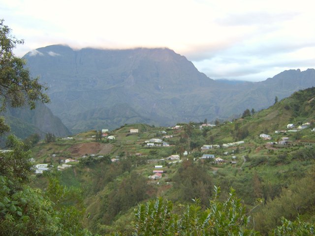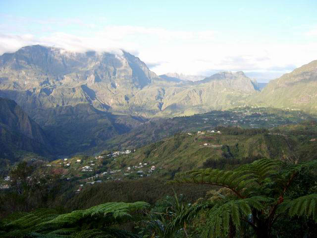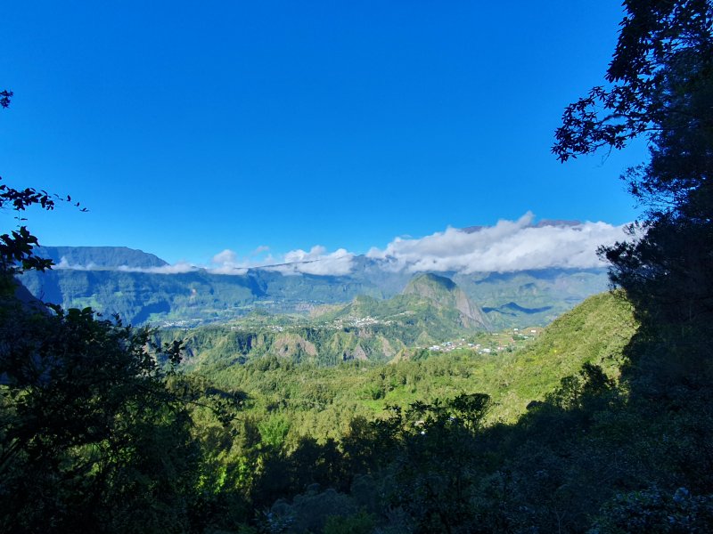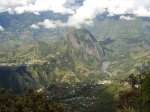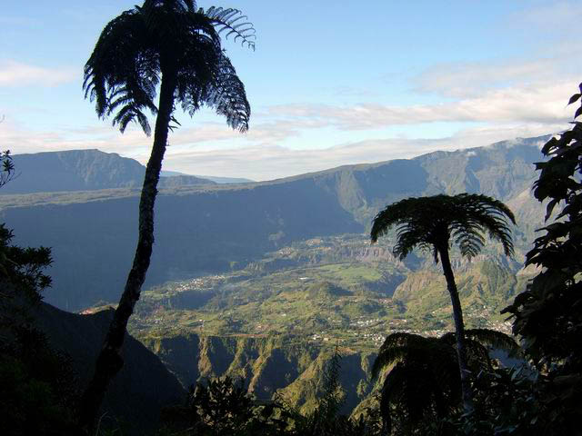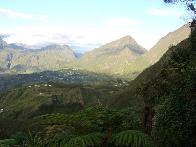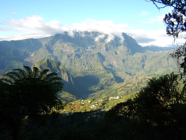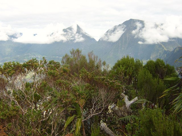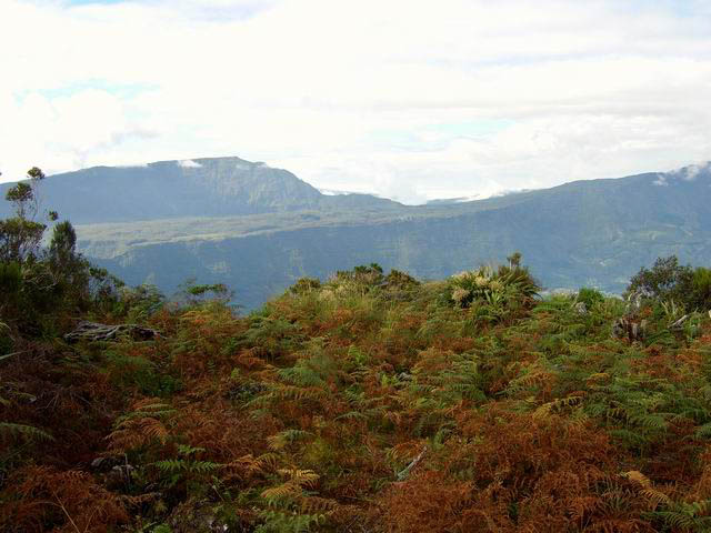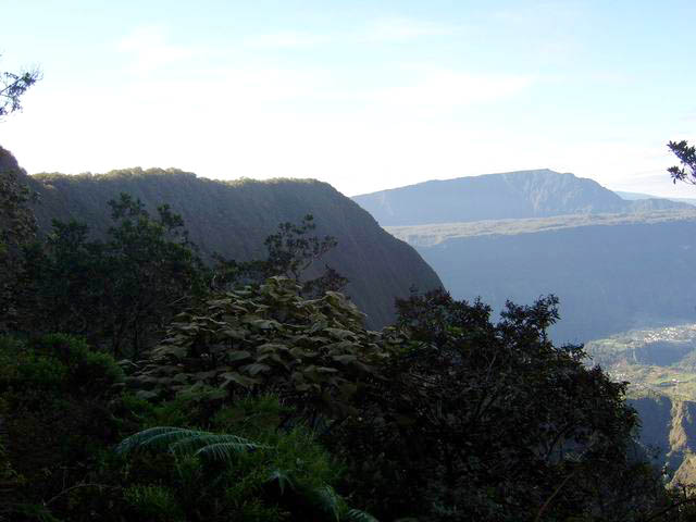 On randonne beaucoup vers Grand Îlet pour entrer dans Mafate ou monter à la Roche Ecrite. Le long rempart qui sépare la Roche Ecrite de Grand Plate comporte également un sentier qui permet de rejoindre le bord à 1550 m d'altitude. Il est moins connu que le précédent et présente exactement les mêmes difficultés, amplifiées par le manque de fréquentation qui laisse tout le loisir à la végétation de prendre possession de l'étroite montée. Comme on arrive dans une magnifique forêt, il est possible de la visiter vers la gauche en montant au Piton Plaine des Fougères ou vers la droite vers le Piton Bé Massoune. On peut même filer tout droit vers Sainte Marie en passant par l'Espérance comme ce circuit présenté dans l'autre sens. Comme souvent dans les fortes montées, le plaisir de regarder les magnifiques panoramas sur le Cirque de Salazie sont des occasions de souffler un peu. Il existait il y a quelques années une piste d'envol des parapentes près du Bé Massoune. Il fallait un très bon entraînement pour oser aller se lancer dans le vide après une telle montée. Les fougères ont désormais pris possession de l'aire.