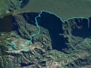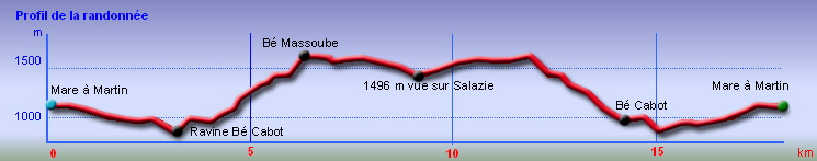 La randonnée peut débuter n'importe où entre Grand Îlet et Bé Cabot en fonction du mode de locomotion et surtout du temps dont on dispose pour effectuer la montée puis la descente. Avant d'arriver au village de la Mare à Martin, garer le véhicule au terrain de football qui jouxte la Mare et profiter, s'il fait beau, du reflet du Piton des Neiges ou du Cimendef dans les eaux du petit lac (Photo 1). C'est un classique de la photo de nature mais il faut reconnaître que c'est beau surtout si la légère brume qui flotte au-dessus de l'eau le matin n'est pas encore dissipée. Rejoindre Bé Cabot par la route en visitant cette région parmi les plus reculées du département, un peu comme à l'Îlet à Cordes à Cilaos. C'est certes de la route, il y a des habitations, mais il est également intéressant de visiter un peu avant de randonner. Les marcheurs qui ne supportent pas les cases, les chiens ou les poules peuvent se rapprocher au maximum du départ du sentier. On bénéficie, depuis la route, de beaux points de vue sur le Piton d'Anchain. Cette route effectuera un long trajet avec virages puis lacets plus courts pour se rapprocher de la Ravine Bécabot. Le sentier est facile à trouver sur la gauche dans la descente. On traverse très vite la ravine pour remonter légèrement afin de contourner le rein sur la gauche puis pénétrer dans une étroite vallée d'une ravine, affluent de la Ravine Bécabot. Quelques lacets pour franchir le rempart amènent sur un plateau herbeux où d'anciennes friches sont désormais incultivables (Photo 2). On emprunte ensuite un chemin en bon état jusqu'au croisement qui mène d'un côté à Bé Cabot et de l'autre vers la montée au rempart. On domine un peu les rares cases de Bé Cabot les Hauts où subsistent encore quelques cultures (Photo 3). On poursuit dans les goyaviers jusqu'à la Ravine Sèche avant de retrouver des filaos ou eucalyptus. Des murettes indiquent que la région était habitée même dans ces hauteurs. Les goyaviers, filaos et toutes sortes d'envahissantes ont eu vite fait de tout rayer de la carte. On se retrouve au pied du rempart et un coup d'œil sur la droite montre le rempart en direction du Bé Massoune (Photo 4). Paradoxalement, le sentier semble grimper une pente plus importante que d'autres qu'on devine en étudiant le rempart. Il se met à grimper d'un seul coup en empruntant des lacets, des passages en corniche protégés ou non par des câbles, des portions boueuses, caillouteuses avec très hautes marches qui peuvent être glissantes. Cette montée ressemble beaucoup au kilomètre vertical rejoignant la Roche Ecrite d'ailleurs toute proche. On y trouve les mêmes difficultés, la même végétation et on se régale des mêmes paysages à peine décalés vers l'Est et un peu plus cachés par l'imposant flanc du Bé Massoune qu'on aperçoit parfois au-dessus des arbres (Photo 5). Les fenêtres dans les bois de couleurs, branles verts et les grands fanjans permettent de beaux clichés sur le Cirque où l'on reconnaît sans peine le Cimendef ou le Gros Morne (Photo 6). On frôle certaines barres rocheuses mais dans danger (Photo 7). D'autres passages, plus délicats, sont sécurisés et, par temps humide, les câbles sont rassurants si les pierres glissent (Photo 10). Plus on monte et plus les paysages sont grandioses vers le piton d'anchain ou le gros morne (Photo 9). Il y a longtemps qu'on ne compte plus les lacets quand arrive une portion plus agréable qui part sur la droite. Mais c'est de courte durée car une seconde série de lacets rapproche doucement du sommet. On est presque au bord du rempart et quel plaisir de s'arrêter pour admirer les paysages qu'on domine vraiment tels les parapentistes qui ne viennent plus s'élancer du piton. (Photo 12 et 13). On rencontre quelques touffes de calumets avant d'arriver au sommet (Photo 14). La différence de paysages entre le bas et le haut du rempart est importante. On arrive, en quelques marches en pleine forêt humide où l'on chemine au milieu des bambous calumets, d'énormes tamarins des hauts recouverts de mousse et des dizaines d'espèces de fougères. Comme le montre le poteau de l'ONF, plusieurs destinations sont possibles (Photo 16). Cette partie de la forêt compte parmi les plus beaux spécimens de tamarins de l'île et les ponts naturels formés par leurs racines ou leurs troncs couchés ne se comptent plus tant ils sont nombreux (Photo 17). C'est près du minuscule oratoire dédié à la Vierge qu'il faut savoir dans quelle direction poursuivre (Photo 18). On attaque à droite sur un sentier très bien marqué dans les calumets (Photo 19). Il suit les vallonnements du terrain dans une végétation exubérante en longeant de plus ou moins près le rempart (Photo 21). Cet endroit est beaucoup plus inaccessible que la Forêt de Bélouve mais elle n'a rien à lui envier d'autant que les pestes végétales ne sont pas encore toutes montées à l'assaut du sud de la Plaine des Fougères. Les vues sur le cirque sont moins nombreuses que durant la montée à cause de cette végétation mais on se rattrape un peu au sommet à peine marqué du Bé Massoune où l'on découvre de grandes surfaces de fougères (Photo 22). Les meilleurs points de vue sont situés un peu en aval sur le sentier descendant au Dioré (Photo 24) ; c'est pourquoi l'itinéraire ci-dessous s'arrête plus bas que le Piton pour profiter des vues plus à l'Est. Si aucun projet n'est fixé, le retour s'effectue par le même itinéraire en profitant au maximum de cette magnifique forêt (Photo 27 et 28). D'autres préfèreront marcher jusqu'au Bé Massoune puis grimper très facilement au Piton Plaine Fougères avant d'entreprendre la longue descente vers Bé Cabot qui peut s'avérer plus dangereuse qu'à la montée lors de certains passages délicats. Privilégier une sortie en avril ou mai pour profiter des goyaviers que l'on peut manger de Bé Cabot jusqu'à mi pente.