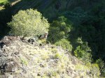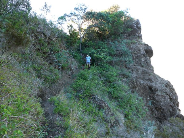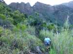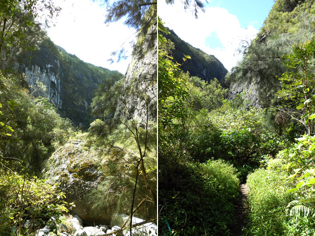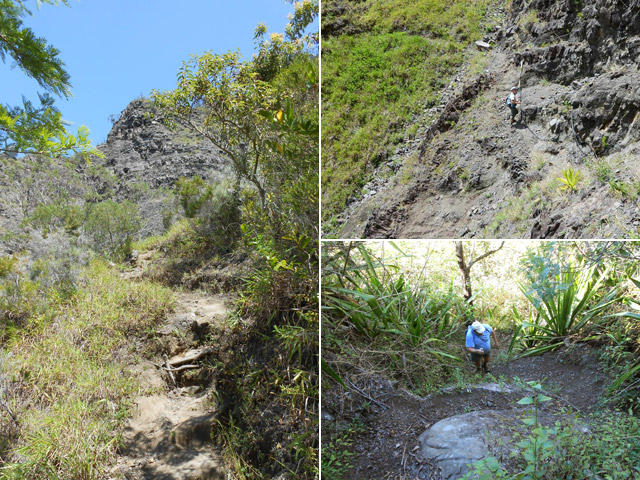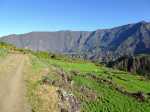 Voici une courte boucle empruntant à nouveau un tronçon du sentier du Piton Morel qui domine le village de Palmiste Rouge, déjà utilisé pour visiter ce village encaissé coincé entre la route de Cilaos et la Ravine des Calumets. On retrouve également cette ravine beaucoup plus en amont avec moins d'eau mais des gorges spectaculaires. L'ascension du Piton Morel est la seule difficulté (en montée) de la journée qui ne dépasse guère une heure. Le sentier un peu raide qui chemine dans une végétation manquant d'eau pour se développer, ne permet pas d'imaginer les beautés qu'on trouvera plus loin après un court mais très fort raidillon en fin de montée. Depuis le petit col qui franchit l'arête et rejoint Gueule Rouge, on est ébloui par le panorama qui s'offre à nos yeux, partant de la Fenêtre des Makes pour se terminer par les pentes du Coteau Kerveguen (Voir § ci-dessous). Perché sur le rocher qui jouxte le col, on a envie de s'installer longuement ici pour profiter du merveilleux spectacle. Seul le Grand Piton bouche la vue de quelques degrés pour obtenir une vision à 360°. La fin de la boucle ne manque pas de charme lors de la traversée du Plateau de Gueule Rouge recouvert de champs de lentilles même si le passage par la route est inévitable. Le difficile Sentier de Gueule Rouge s'effectue en descente et les efforts à fournir sont moindres qu'en sens inverse. Enfin, la dernière partie comporte toujours cet étroit et impressionnant canyon vertical de Cap Blanc où le bruit de l'eau courante est démultiplié, laissant croire au passage d'une importante rivière.