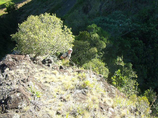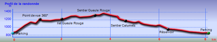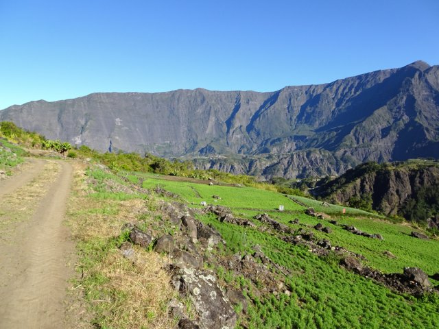 La randonnée débute au pont qui enjambe le Bras Morel à l'entrée de Palmiste Rouge pour une courte mais sérieuse ascension du Piton du même nom. Les cartes IGN mentionnent le Bras Morel mais les habitants le nomment différemment. Une association a même rajouté une petite pancarte qui peut dérouter. Le sentier souvent sableux est étroit mais visible dans les hautes herbes et les lantanas (galaberts) de plus en plus ancrés sur les pentes (Photo 1). Palmiste Rouge apparaît depuis les premières pentes et on distingue même l'Îlet à Calebasse si le soleil est assez haut (Photo 2). Une partie du bois a été défrichée et les lentilles remplacent désormais les galaberts (Photo 3). Un épouvantail à la jolie frimousse tente de dissuader les moineaux et autres oiseaux de dévorer les graines de lentilles (Photo 4). Après quelques minutes de montée, on peut s'arrêter à un belvédère rudimentaire pour de belles vues vers le Gros Morne de Gueule Rouge. On franchit la distance en trois paliers : pente forte en lacets durant 30 minutes, parties plates au milieu avec passage d'anciens éboulis glissants et enfin une nouvelle pente très abrupte, rectiligne, aux marches très hautes et étroites qui nécessitent des efforts soutenus ou des haltes fréquentes afin de calmer le "palpitant" (Photo 5). Après l'ancien éboulis, prendre à gauche au croisement des sentiers ; Celui de droite revient à Palmiste Rouge. Cette dernière pente, fort heureusement assez courte et en très forte pente se termine au col. En seulement 2 secondes, tous ces efforts et ces douleurs musculaires sont oubliés à la vue du panorama qui apparaît. Les rochers dénudés à gauche incitent à effectuer une petite déviation pour mieux voir les alentours, surtout que le petit sentier qui grimpe à gauche est bien marqué (Photo 6). Aucune déception car c'est là que commence ce magnifique tour d'horizon de près de 360°. On a tout d'abord le Piton Morel qui cache une bonne partie du Piton de Gueule Rouge en direction du Sud (Photo 7). Ensuite, les yeux se posent immédiatement dans toutes les autres directions pour admirer depuis un emplacement privilégié ce splendide Cirque de Cilaos dont la ville et l'église sont bien visibles sous l'horizon des Salazes et du Gros Morne (Photo 8). Le rocher est stable, plat et il est difficile de le quitter quand il faut se décider à poursuivre la boucle par la courte descente (Photo 10). On retourne au col pour poursuivre sur le sentier qui épouse la ligne de courbe avant de plonger vers les cultures (Photo 11. La pente sableuse est également très forte et il faut regarder attentivement où poser les pieds sur un sentier bordé de pieds de lentilles. Le plateau est entièrement couvert de cette légumineuse sur plusieurs hectares (Photo 12). Ces cultures sont désormais possibles depuis l'installation de longues canalisations permettant un arrosage régulier. Prendre à droite la piste entre lentilles et quelques autres cultures maraîchères ou de maïs (Photo 13). De la piste jusqu'au départ du Sentier de Gueule Rouge on envie les habitants du plateau qui bénéficient tout au long de l'année de ces magnifiques paysages sur le sud du Cirque (Photo 14 ou vers le nord (Photo 15). La piste rejoint la route dans un virage. Prendre à droite et marcher vers Bras Sec durant 1800 mètres en frôlant quelques îlets composés d'une ou deux cases. Il est impossible de manquer le départ du sentier de Gueule Rouge à droite de la route contre une piste menant à de nouveaux champs. Il est d'abord assez plat dans les jouvences, galaberts et quelques bois de couleurs (Photo 17). Très vite, il plonge de manière vertigineuse vers la Ravine des Calumets, 200 mètres plus bas (Photo 18). On suit une crête bordée d'arbres dont de grands bois de rempart ou de bois maigres. Quelques petites trouées permettent d'admirer le Grand Piton (Photo 19). La pente ne faiblit jamais et il est même agréable d'utiliser les arbres pour se ralentir (Photo 20). Attention à certains endroits qui surplombent la vallée par des murailles verticales ; une glissade serait fatale mais quelles vues sur le Bonnet de Prêtre (Photo 21) ou sur la vallée de la Ravine des Calumets (Photo 22) ! Les difficultés prennent fin en arrivant à la rivière quand on rencontre le Sentier des Calumets qui descend vers le Sud. Le cheminement est agréable sous les innombrables eucalyptus, au plus proche de la ravine le plus souvent à sec. D'un seul coup, l'eau arrive avec son bruit caractéristique et il faut franchir le cours en passant sous d'énormes rochers, près de deux petites chutes d'eau. Des tuyaux noirs en plastique confirment qu'on a pris le bon passage sous ces roches qui forment un court tunnel (Photo 23). Le clou du spectacle se situe quelques centaines de mètres plus bas quand apparait le Cap Blanc : des gorges larges, très hautes, avec des surplombs inquiétants mais qui semblent bien solides (Photo 24). La traversée est aisée et sans difficulté sauf s'il a beaucoup plu et que des gouttes tombent des roches du plafond, rendant glissantes les grosses pierres noires qui encombrent le sentier. Plus bas, on rejoint la forêt habituelle et on longe, au plus près, un tuyau qui a remplacé le vieux en fonte (Photo 25). On termine par quelques petites montées et descentes qui s'alternent pour enfin arriver au village près d'un réservoir alimenté par cette canalisation. On a sous les yeux le Piton Morel qu'on a escaladé 3 h auparavant (Photo 26). Partir à droite puis immédiatement à gauche sur le Chemin du Calumet entre quelques cases. Emprunter le sentier entre les cultures pour éviter de marcher sur la route. La traverser et emprunter en face le Chemin Morel puis à gauche le Chemin des Gaulettes qui permet de voir le Gros Morne de Gueule Rouge à l'horizon (Photo 27). A la fin de la route, le sentier des Gaulettes comportant de nombreuses marches mène rapidement à la poste