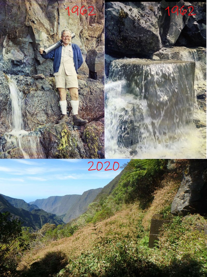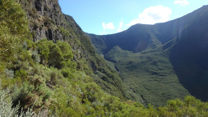 La randonnée débute au parking du Nez de Bœuf où des tables attendent pour le pique-nique de retour (voir fin du film). La fatigue procurée par cette très courte sortie justifie amplement une bonne halte au retour. Longer tout d'abord le pied du Nez de Bœuf sur un sentier large et plat de très bonne qualité qui file en direction du belvédère sur le bord du Coteau du Nez de Bœuf (Photo 2). Le spectacle y est garanti sur les Pentes du Nez de Bœuf et le Cratère Commerson situé juste en face. Réserver ce belvédère pour le retour afin d'étudier le parcours effectué. L'hiver, au petit matin, les températures peuvent y être négatives (Photo 3). Après une bifurcation sur la droite en direction de quelques beaux spécimens de petits tamarins des Hauts (Photo 4), il faut chercher, juste au pied de la pente du Nez de Bœuf, le départ du sentier qui n'a pas servi depuis plusieurs décennies, excepté peut-être pour quelques braconniers (Photo 5). Le ton est tout de suite donné par la vue sur la vallée qui se présente derrière les branles verts ou gris (Photo 6). La descente débute par une forte pente où les mains s'avèrent déjà utiles (Photo 7). Alternent alors des pentes faibles où le sentier est encore bien visible, de fortes parties abruptes où il est indispensable de s'accrocher aux branches (Photo 8), des parties cachées par des branches ou arbres tombés au sol (Photo 9), longues portions recouvertes de jouvences qui cachent totalement le cheminement pouvant comporter des ornières, parties en corniche où le sentier fait parfois moins de 20 cm de large, etc. En face, on distingue très bien le rempart déchiqueté coiffé par le Cratère Commerson (Photo 10). La descente se poursuit jusqu'à une falaise totalement verticale qui domine l'ancienne canalisation (Photo 12). On distingue, dans la pente, un replat d'une vingtaine de mètres de large (Photo 13). C'est là que se trouve la source et la canalisation. La descente se poursuit à flanc de rempart comportant de très fortes pentes avec de magnifiques vues vers le Mapou et le fond de la Rivière des Remparts (Photo 15). Il faut prendre tout son temps sur les portions de sentier très étroites pour ne pas glisser (Photo 16). On se retrouve, un peu plus tard, au pied de la falaise aperçue plus haut (Photo 18). La végétation composée d'une majorité de branles verts ou gris, comporte ça et là des essences plus grandes dont certaines abritent des fougères (Photo 19) ou de belles orchidées (Photo 20). Rendre hommage, au passage au pied de la falaise, à Ponin Nandjan Rock, venu atterrir ici après s'être précipité avec son véhicule de la Route Forestière du Volcan, située 200 m plus haut (Photo 22). La voiture en cours de décomposition donne une idée de la violence de la longue chute dans le vide et du désespoir de son conducteur. En regardant vers la falaise, on l'imagine en train de chuter mais on remarque surtout ces roches qui n'ont pas suivi leurs congénères lors du dernier éboulis (Photo 23). Le cliché, à lui seul, permet de se rendre compte du danger de cette randonnée ! Compter une bonne heure et demie depuis le Nez de Bœuf, pour atteindre le tuyau et 15 minutes supplémentaires pour arriver à la source. On rejoint très vite la canalisation située quelques mètres en-dessous de l'éboulis. Des vestiges d'ouvrages maçonnés retiennent encore de longues portions du tuyau métallique désormais totalement inutilisable (Photo 24). Impossible de se perdre car la source se situe au bout de ce tuyau. Les jouvences, qui adorent les endroits humides, sont ici très grandes et il est difficile de voir le tuyau (Photo 26). Plusieurs bruits d'eau qui coule attirent l'oreille. De nouveaux ouvrages bétonnés recueillent ces différentes arrivées d'eau, qui, à l'époque, finissaient dans le tuyau. On aperçoit de l'eau qui suinte d'une petite grotte (Photo 27). La source la plus importante se situe près d'une muraille qui semble difficile à franchir et signe la fin de la descente (Photo 28). Après un bon rafraîchissement, entamer la remontée qui ne prendra guère plus de temps que la descente à cause de la technicité de certaines parties abruptes. Quand la météo est favorable, les paysages et panoramas sur la vallée de la Rivière des Remparts ou les pentes vers la Plaine des Sables sont grandioses (Photo 25).