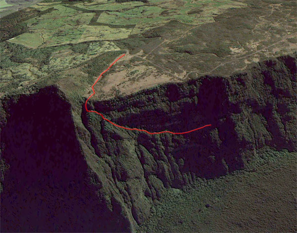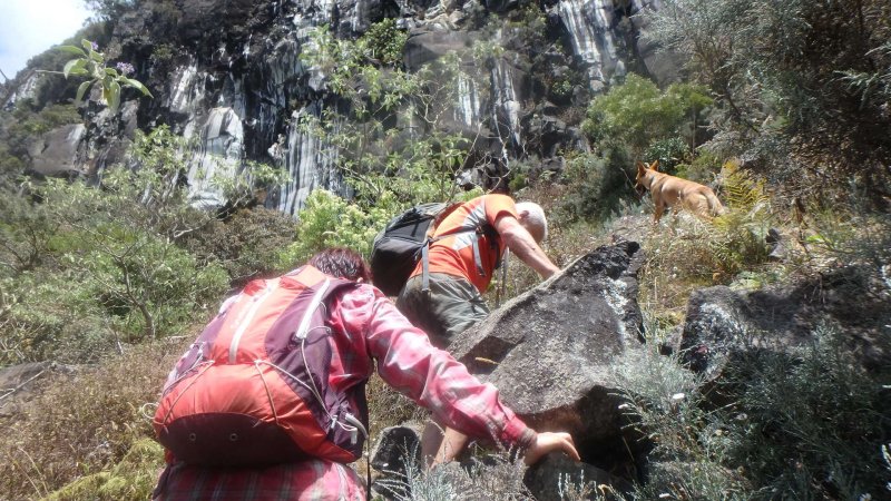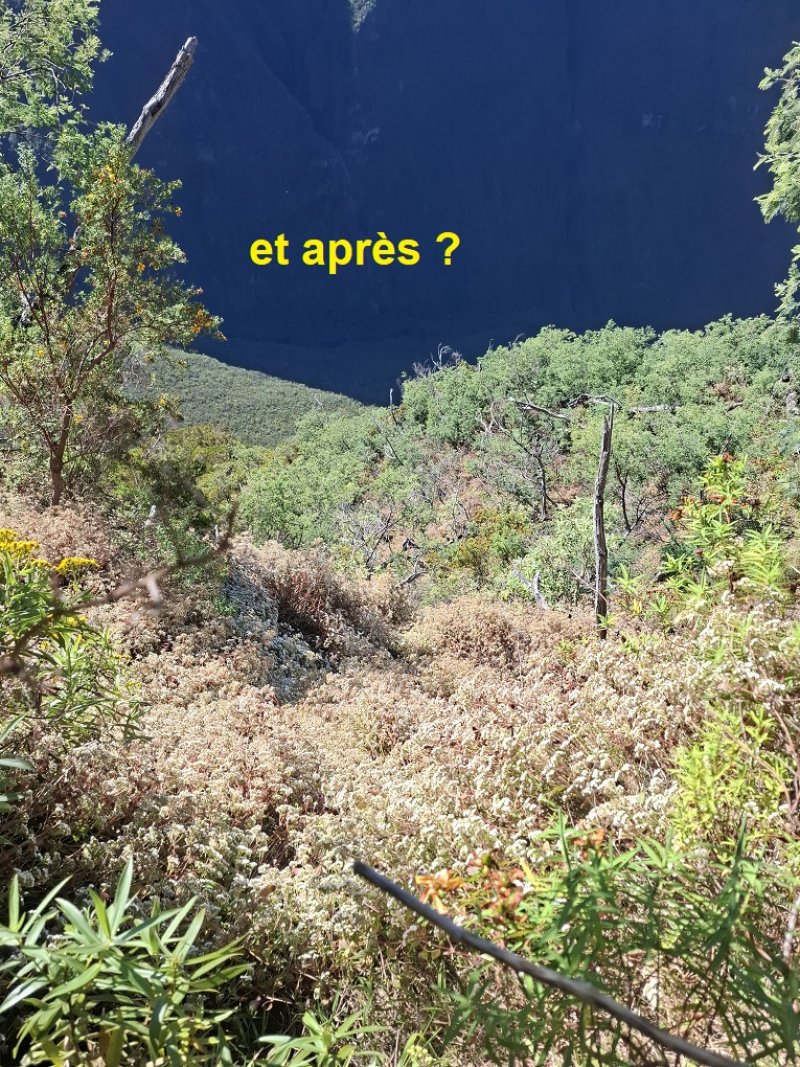 Les mois et les années passent et toujours personne (ou du moins aucun commentaire) qui n'ose s' aventurer dans le Rempart du Nez de Bœuf à part toujours la même bande d'aventuriers un peu fous de mes connaissances. Nous en revenons une fois de plus de pèlerinage donc les herbes couchées lors de notre passage pourraient peut-être inciter certains à se lancer. ATTENTION très difficile et logo tête de mort précisés sur le site. Bien lire ou relire fiche et commentaires avant de se lancer en toute connaissance de cause. La responsabilité de ceux qui ont fait cette rando et de randopitons ne peut être engagée, faut il le rappeler. Mais alors que dire de l' incursion tentée et réussie à la passerelle que j 'ai toujours rêvé d 'atteindre. Merci à Hervé, Martial et René pour avoir si bien sécurisé cette aventure avec cordes, baudriers ...Il vaut mieux avec 800 m de vide au dessous de nos pas, sur tout le long, une arête large de quelques centimètres...Arrivé à la canalisation au lieu de partir à gauche vers la source partez à droite. Cette fois-ci très très difficile et 2 têtes de mort .Dans l'attente d'une fiche randopitons..? Rien de plus car je fais du hors sujet...Pardon ! mais, pour moi, bien sûr une expédition classée dans mon top 5 des plus extraordinaires randos faites à la Réunion.