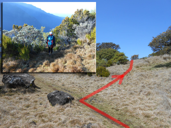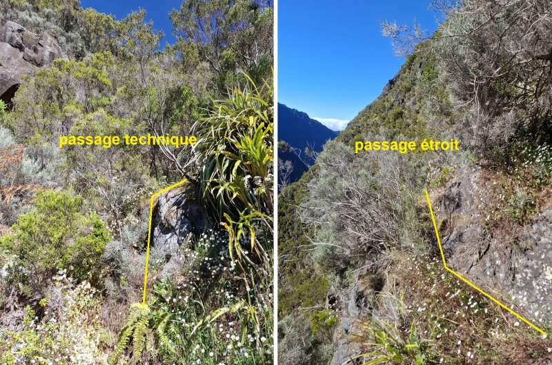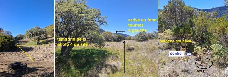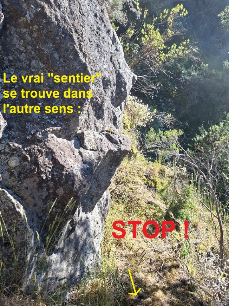 Pour trouver le départ du sentier à partir du parking, marcher en direction du pied du Nez de Bœuf sur le sentier balisé qui mène au belvédère - Au gros rocher situé à gauche du sentier près d'un autre rocher plus petit comportant un balisage officiel (photo ci-contre), prendre à droite (flèche rouge) et marcher tout droit jusqu'à de beaux petits tamarins - Au pied de la pente du Nez de Bœuf , repérer le départ très discret de ce sentier oublié (vignette ci-contre) qui plonge littéralement vers une longue fracture de la falaise - Suivre ensuite les traces ou rubalises.
