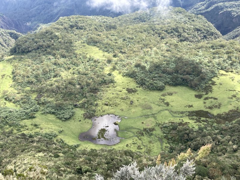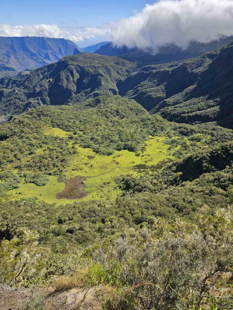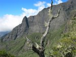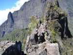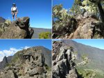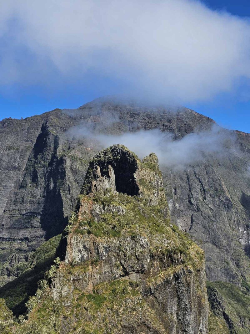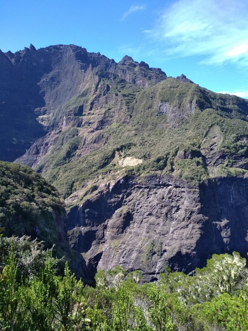 Magnifique vue sur Mafate, Cilaos et les sommets, même la Roche Écrite ! La progression sur le col n'est pas si horrible mais nécessite d'être vigilant (ce doit être horrible si on a le vertige). Ceci dit je me suis arrêtée a la dernière bosse juste avant d'arriver aux 3 salazes, de un parce qu'il y avait 2 groupes d'escalade, de deux parce que je voyais bien que ça devenait trop vertical. La montée fait souffler un peu, et en descente on peut glisser/rouler sur le sentier sableux par endroit. Ne pas manquer de faire un détour au Cap Bouteille avec un joli point de vue sur le cœur du Piton et du Gros Morne (45min aller-retour)