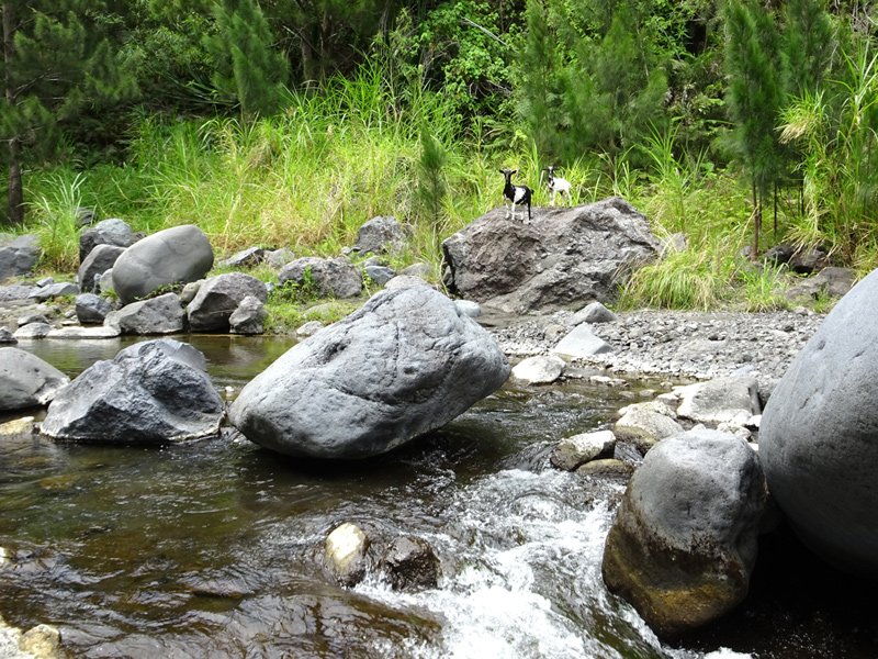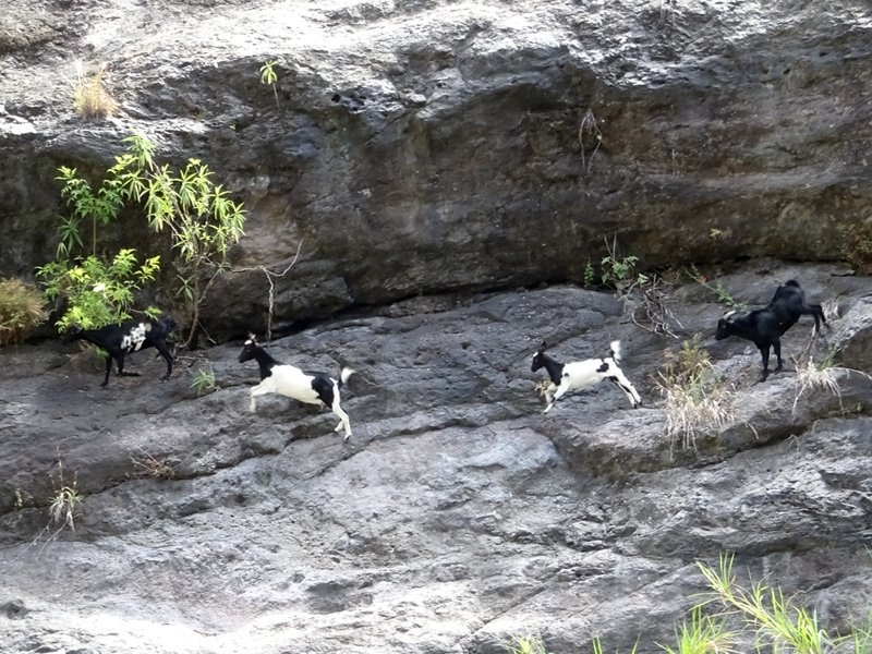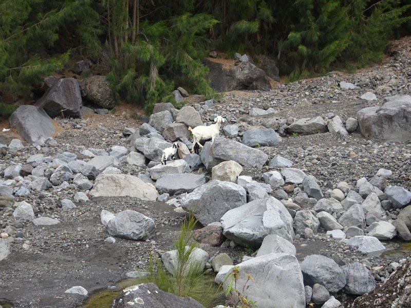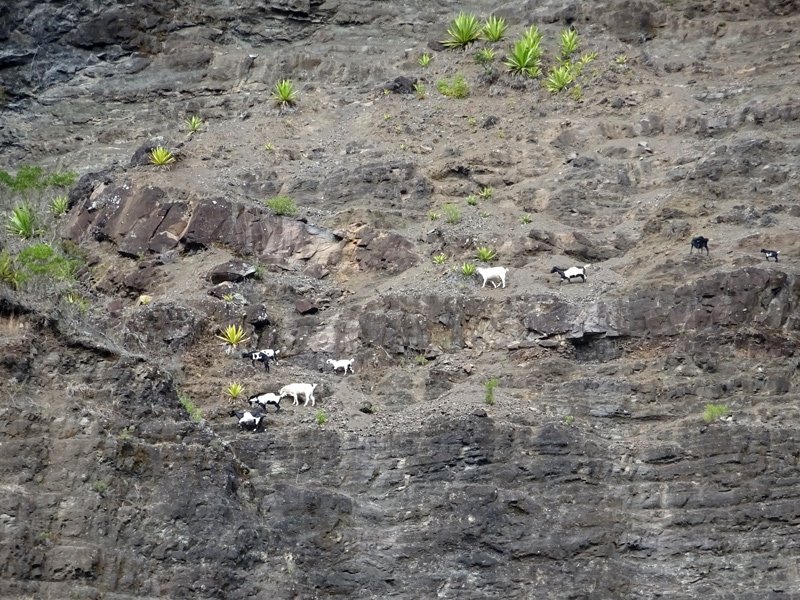 @Juanitarun : Le cirque de Mafate (et une partie de celui de Cilaos) est peuplé de chèvres sauvages qui se multiplient à grande vitesse faute de prédateurs naturels. Mais, soyons sans crainte, les bracos surveillent !! On trouve parfois des cadavres au fond des gorges, issues fatales de biquets ayant posé le pied sur un caillou instable. Ils savent se faire discrets dans les endroits fréquentés. Il est facile de les surprendre en remontant la Rivière des Galets (photos 1,4 & 5). Il faut parfois avoir l’œil pour les deviner sur des falaises où même les varappeurs n'osent aller (photo 2, falaise & 3, détail). Enfin, le matin de bonne heure, il est fréquent d'entendre bêler du côté des pentes du Taïbit sans pour cela les apercevoir.