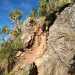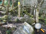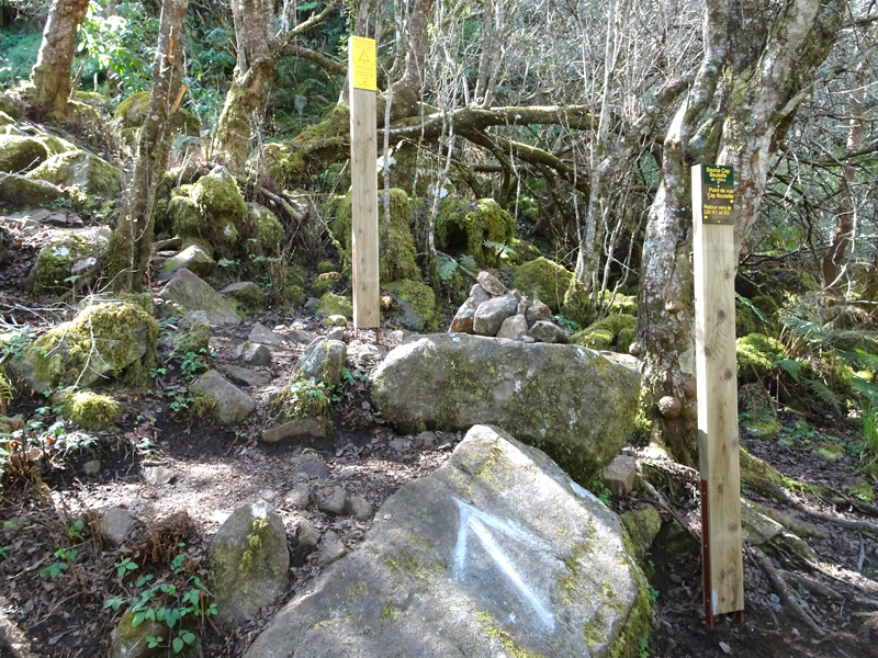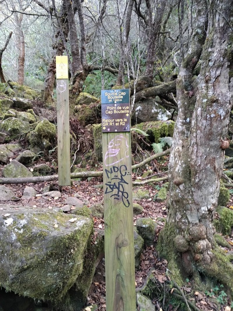 Suivre le sentier de Cap Bouteille sans se poser de questions sur l'embranchement. Le cairn installé il y a quelques années est toujours là avec la flèche blanche peinte sur la roche. Mais l'ONF a installé deux poteaux qui permettent de bifurquer sans hésitation. Le premier indique la suite du trajet vers le Cap Bouteille. L'autre attire l'attention des marcheurs sur le danger de la montée laissée à l'entière responsabilité de celui qui s'y aventure.