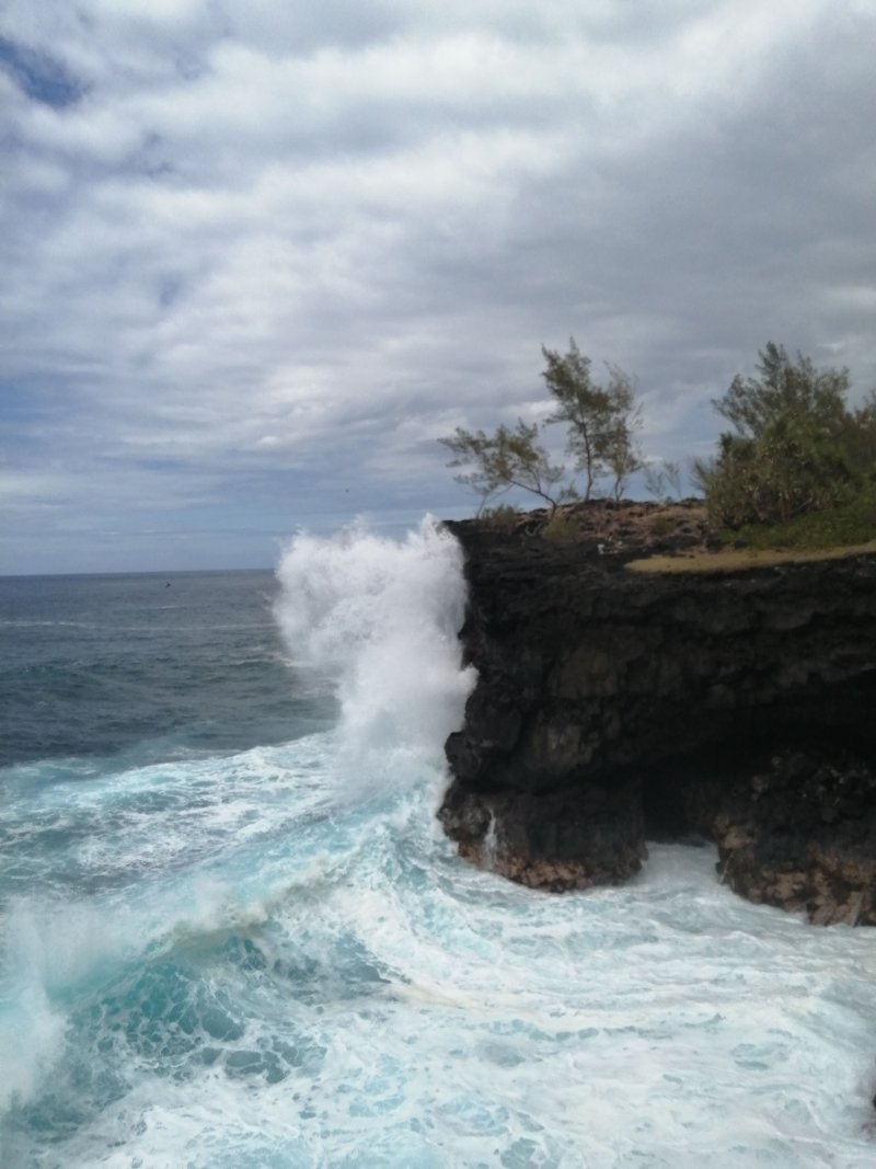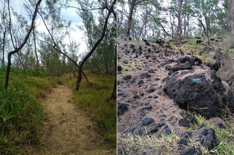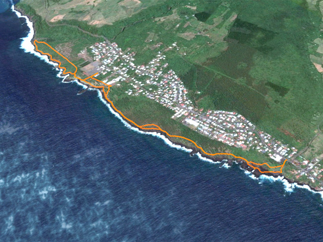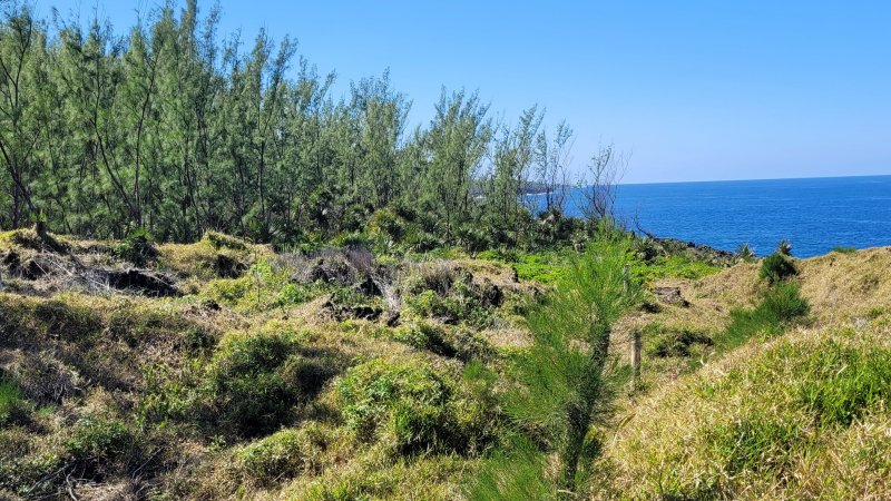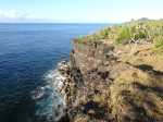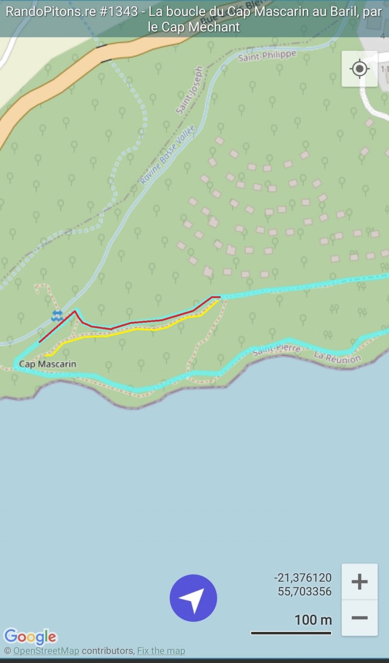 La randonnée débute près des kiosques à l'ombre des vacoas du Cap Méchant. Filer immédiatement sous les filaos en direction de l'océan (Photo 1). Les filaos sont remplacés par un magnifique gazon pique-fesse, un gazon digne d'un green de golf, jamais tondu et toujours court (Photo 2). Obliquer sur la droite et rejoindre l'escalier repérable de loin aux barrières de protection, (Photo 3). L'escalier en pierre de lave aux très hautes marches permet de descendre à proximité de la mer qu'on voit déjà éclabousser les rochers du Fond de Parc. Se rapprocher des vagues et suivre le sentier étroit mais bien visible. Il serpente entre les roches de lave recouvertes de longues herbes. Éviter les hors sentiers à cet endroit qui comporte quelques fissures rendues invisibles par cette traînasse et privilégier les petites sentes de pêcheurs garantissant des endroits sûrs. On peut ainsi se rapprocher d'un puits dans la lave qui présente un grand souffleur quand la mer est forte (Photo 4). Plus loin, on aperçoit les falaises trouées d'arches naturelles qui ne resteront pas des siècles en raison de la puissance des vagues (Photo 5). Très vite, des oiseaux sombres en vol indiquent l'endroit de prédilection des macouas qui y nichent à la saison. Ils se rassemblent ici par dizaines (Photo 6) et on peut approcher certains nids à moins de 2 mètres en rampant sur le bord du précipice (Attention à la chute). Les oiseaux se contentent de tourner la tête mais ne sont pas effarouchés. Les plus belles photos se font lorsque l'oiseau est en vol, entre le haut de la falaise et les vagues blanchies par l'écume. Lorsqu'ils sont en mer, leur habitat est trahi par leurs déjections blanches qui forment de petits tas de guano. Le sentier se poursuit, parfois étroit, et longe le rempart jusqu'au Cap Mascarin (Photo 7). Depuis le couvert des nombreux vacoas, on voit très bien des ilots basaltiques proches de la côte (Photo 8). On peut rejoindre plus loin la Ravine de Basse Vallée mais un sentier part sur la droite. L'emprunter et entamer la remontée vers l'hôtel abandonné. On devine la vallée de la ravine qui remonte vers la RN2 (Photo 9). Un sentier, plus discret, file en direction de la ravine et d'un haut mur d'escalade. Ce n'est pas une aventure extraordinaire que de le rejoindre pour y rechercher les noms originaux donnés aux voies de grimpe (Photo 10). On ne peut l'escalader qu'avec le matériel de professionnel et gare à la chute pour ceux qui voudraient s'y essayer sans entraînement. Poursuivre sur le sentier principal qui serpente dans les fougères et vacoas sur un sol rocailleux et rejoint en quelques minutes le grillage entourant les ruines de l'hôtel (Photo 11). Longer sans difficulté la haute clôture puis la piste (Photo 12). Délaisser l'escalier remontant vers le terrain de sport de Basse Vallée (Photo 13). Le sentier se termine à l'escalier pris pour la descente après avoir longé une haute barre rocheuse (Photo 14). Retrouver le gazon endémique (Zoysia matrella, gazon pique-fesses) et longer l'océan en passant près du Cap Méchant dont on ne verra l'arche qu'en descendant de nouveaux escaliers (Photo 15). Ces escaliers qui passent dans de hauts pans de falaise permettent de s'approcher des kiosques de pique-nique. Poursuivre vers l'est en suivant les balises bleues sur les filaos (Photo 16) (quand ils ne sont pas fraîchement coupés). Le cheminement est facile malgré les creux et bosses d'un terrain assez accidenté (Photo 17). Le sentier passe tout d'abord sur de grandes herbes puis sur d'épais tapis d'aiguilles de filaos qui recouvrent le sol. Sans être de grands aventuriers, quitter ce sentier balisé de bleu pour suivre d'autres passages marqués de blanc ou de orange pour s'approcher des falaises et des vagues et ainsi profiter de paysages plus aquatiques (Photo 18). Le cheminement s'effectue au lus près de la falaise sans grand danger (Photo 19). Repérer alors les lavengères qui adorent vivre sur la lave où les embruns salés les arrosent en permanence (Photo 20). Quand le passage devient plus difficile, reprendre le sentier officiel pour le quitter à nouveau après un passage herbeux sous des filaos et rejoindre la zone chaotique de rochers battus par les énormes vagues au Port dont un gouffre sans fond (Photo 21). Attention à la chute douloureuse sur les laves solidifiées pour s'approcher des gouffres, failles ou arches dont une magnifique qui vaut à elle seule ce petit écart qui emprunte d'ailleurs un ancien tracé du sentier littoral où l'on rencontre encore les balises de l'époque (Photo 22). Poursuivre vers la Ravine Pérote et la suivre pour retrouver le pont de la N2 (Photo 23). Le sentier se finit à l'arrêt de bus "Rue du 10 mai 1981". En traversant la Ravine Pérote, on peut poursuivre vers le Souffleur d'Arbonne. Faire demi-tour et rejoindre le Cap Méchant en prenant cette fois exclusivement le sentier balisé entre fougères et trainasse (Photo 24 et Photo 26). Au Cap Méchant, à un très grand filao, prendre à droite pour rejoindre le premier kiosque sur la droite et grimper les escaliers qu'on aperçoit déjà de loin (Photo 27). On passe au plus près du Puits des Français, une cavité dans la falaise, bouchée de grandes fougères au pied d'une rampe formée de marches (Photo 28). Emprunter cet escalier qui finit au parking du premier restaurant et rejoindre le véhicule en longeant les deux autres établissements qui reçoivent chaque week-end des centaines de convives.