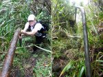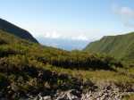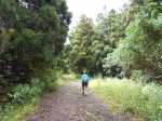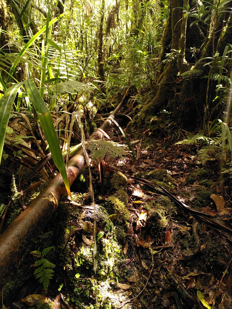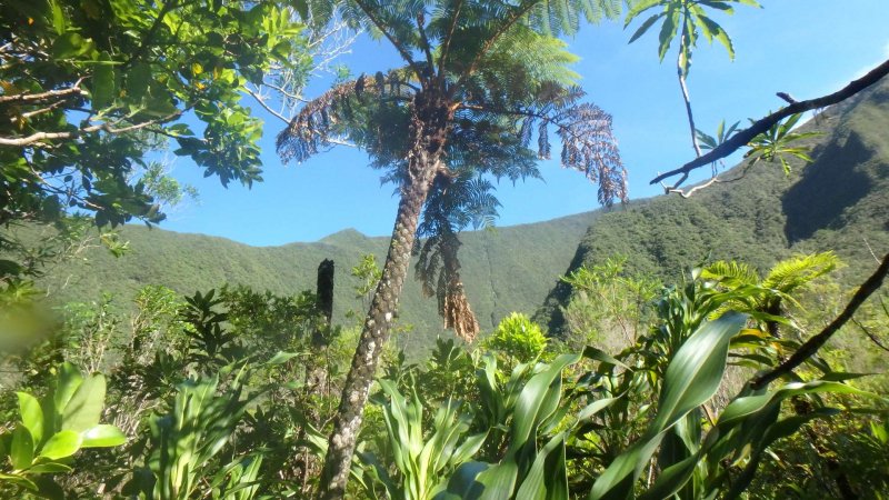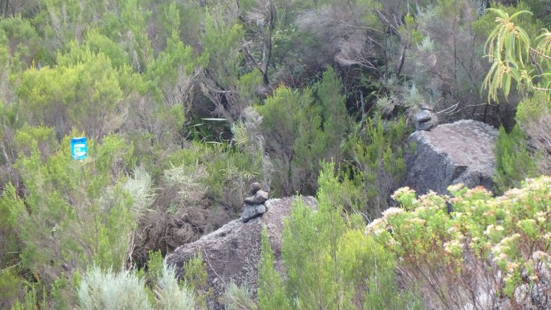 Début du sentier fait, depuis Jacques Payet. La forêt est magnifique mais le sentier fort étroit et la paille sabre trempe le premier randonneur de la journée. Le tuyau est percé en haut moins deux endroits dans la forêt de bois de couleur, c'est parfait pour boire. Goyaviers et ronces blanches sur la route forestière (fermée après le gîte). On peut aussi couper par la forêt de crypto le long des canalisations mais c'est plus sombre et ennuyeux.