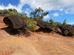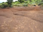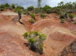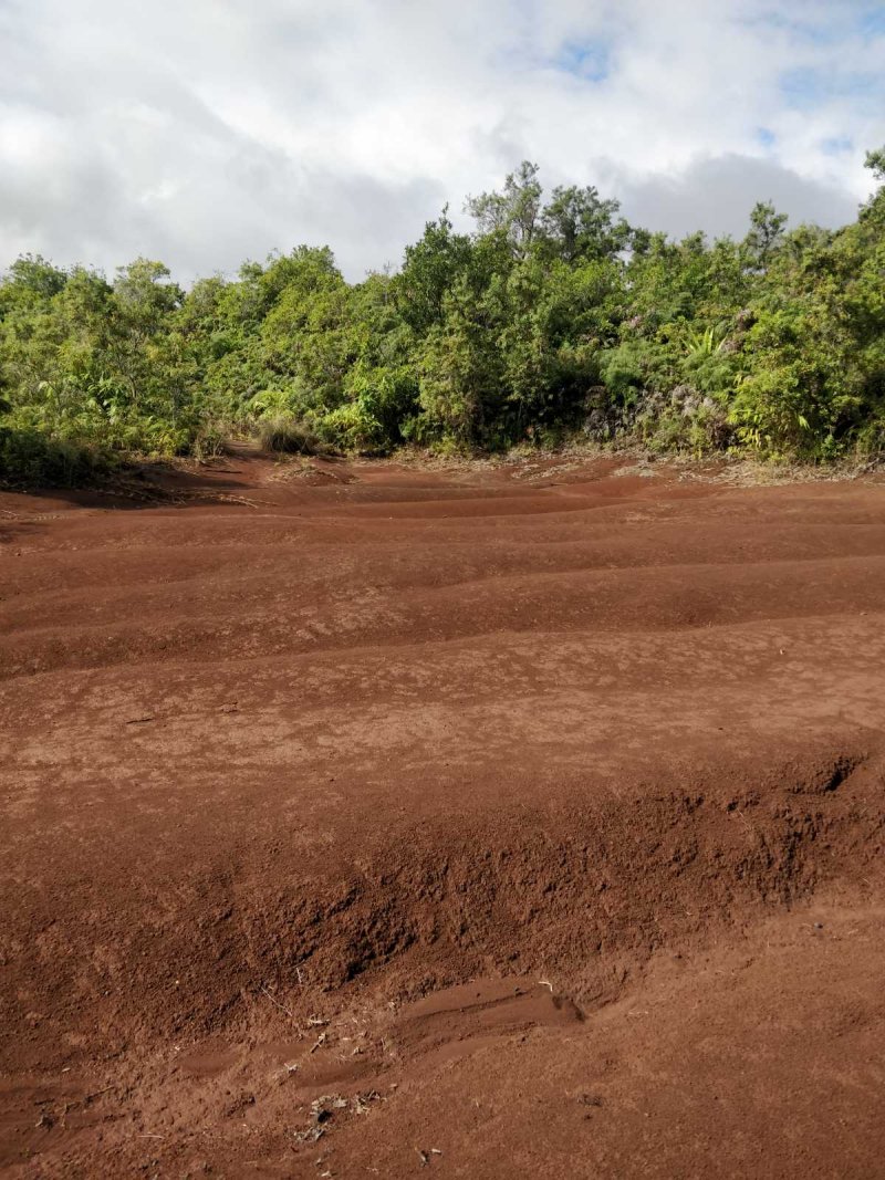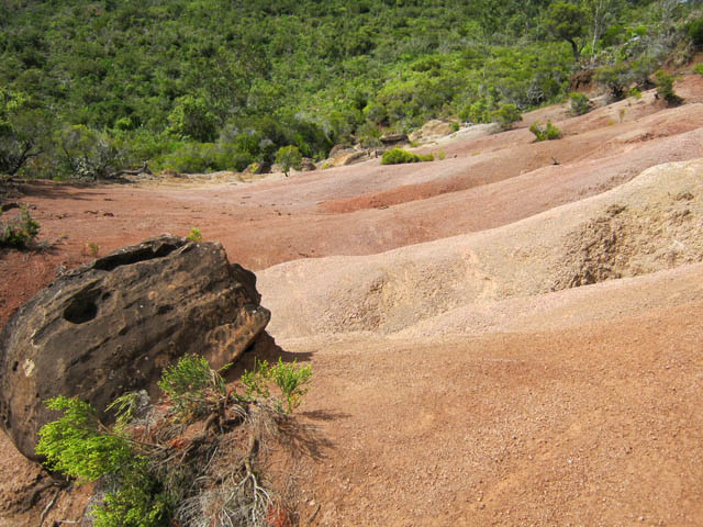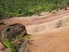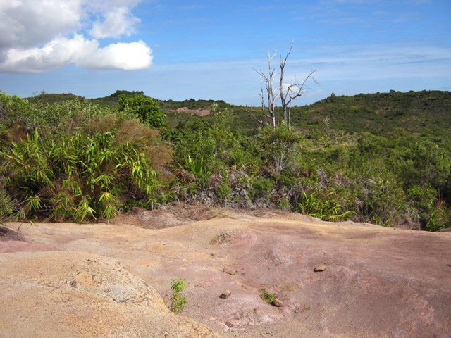 Quand on visite Chamarel à Maurice on se rend compte que la surface qui attire autant de touristes est relativement insignifiante. Seules les couleurs variées peuvent leur donner vraiment de l'attrait. Cette courte randonnée peut donner l'impression de se trouver à Maurice pour quelques minutes car on traverse à plusieurs reprises des portions dénudées recouvertes de terre de différentes couleurs allant du gris clair au brun en passant par quelques nuances d'orange. La plus belle de toutes, très colorée et présentant de beaux rochers en équilibre instable, se situe en fin de parcours et nécessite un petit écart d'une centaine de mètres (voir carte). Les motards ont depuis longtemps repéré ces zones défrichées et les traces de pneus laissent à penser que les ornières et traces profondes auront tôt fait de détruire totalement ce superbe lieu. A réserver aux amateurs de belles photos de nature. Contrairement à la boucle qui effectue le tour du Piton de la Ravine à Malheur, le sentier est toujours large et propre et ne comporte aucune difficulté malgré quelques pentes. Il correspond à la fin du circuit du Chemin des Anglais pour ceux qui ne prennent pas le béton pour rejoindre la route de la Plaine d'Affouches.