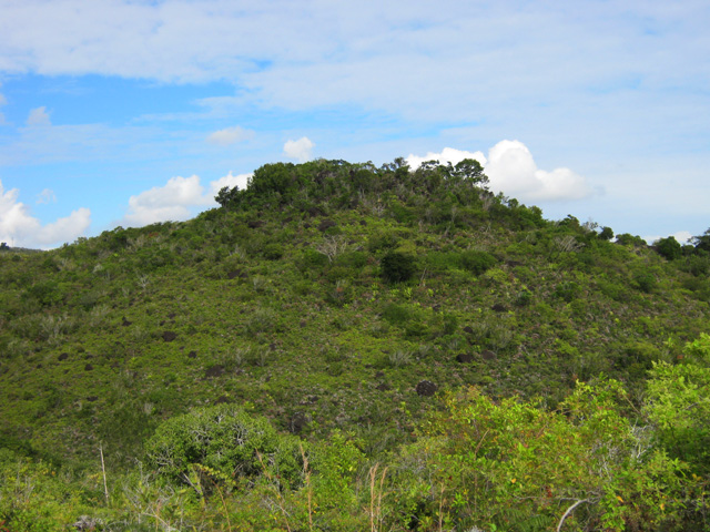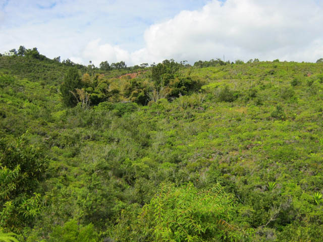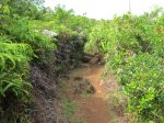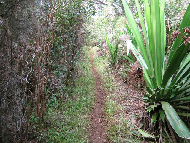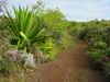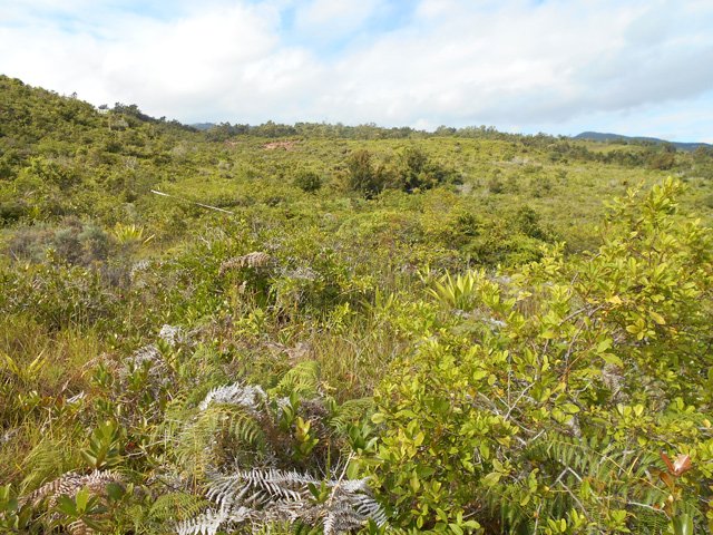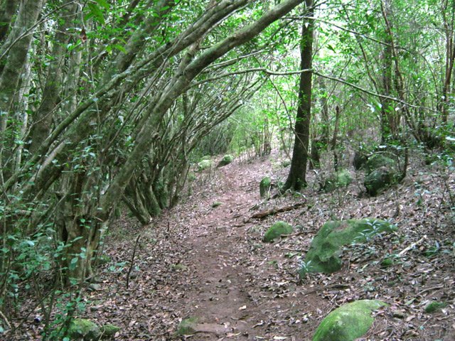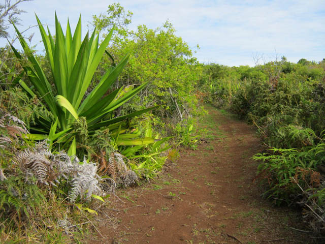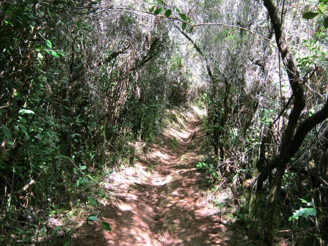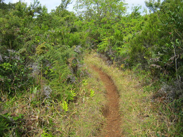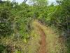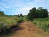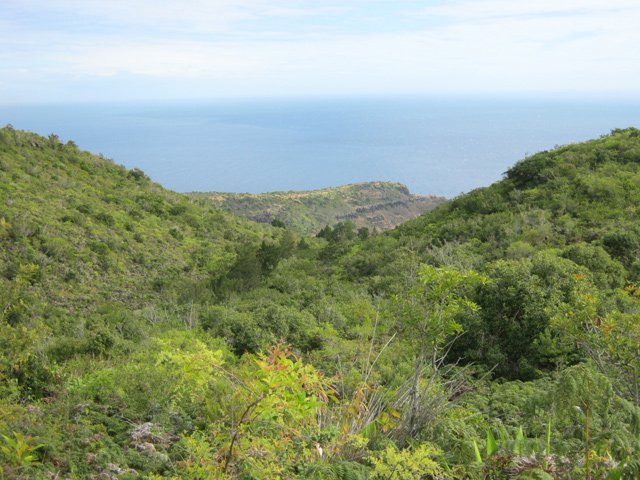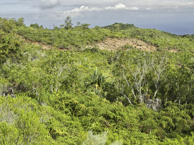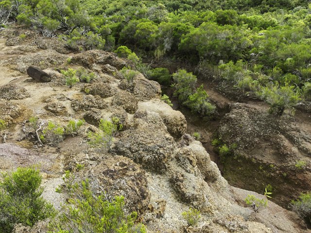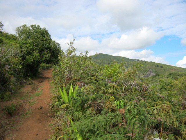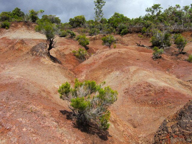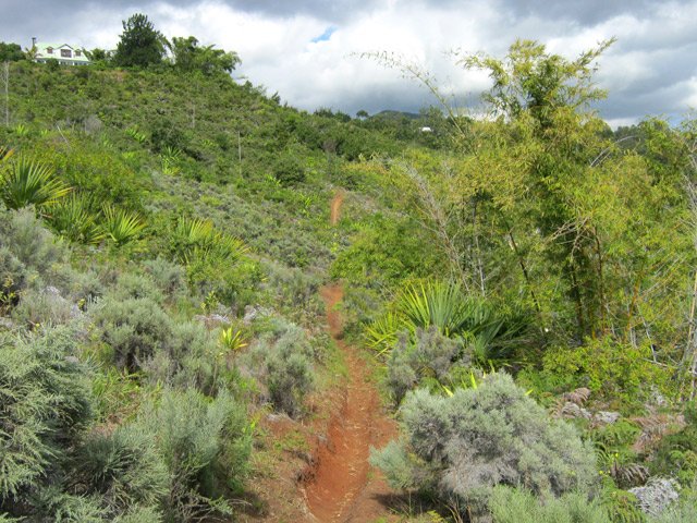 La randonnée débute à la Route Forestière de la Plaine d'Affouches car il y a peu de possibilités de parking sur les bords de la sinueuse D41. On marche quelques mètres sur la route Antide Boyer pour prendre rapidement le sentier qui descend dans la partie sombre crée par les jamrosas qui poussent ici nombreux et serrés (Photo 1). Le sol peut y être glissant après une pluie. Plus loin, on retrouve la lumière, les branles et les fougères qu'on ne quittera plus jusqu'à la fin de la sortie (Photo 2). Le sentier est le plus souvent étroit mais en bon état. Puis ce sont les goyaviers et quelques chocas parmi les fougères qui bordent le sentier (Photo 1). On remarque, sur une grande partie du parcours des milliers de fougères qui ont eu du mal à pousser et dont les feuilles forment des boules informes. Elles semblent avoir beaucoup souffert. Espérons que les radiations venues de Fukushima n'y sont pour rien !!! On se retrouve à une bifurcation. Prendre à gauche ; la partie droite est celle qu'on empruntera au retour. Puis c'est une aire de pique-nique comportant de grosses touffes de bambous, des zones tondues de manière originale et peu de kiosques qu'on traverse facilement avant de pénétrer dans une petite surface boisée (Photo 4). Très vite, les fougères reprennent le dessus. La progression s'effectue dans le même type de végétation constituée essentiellement de fougères, chocas et poivriers (Photo 6). Les panoramas sont rares en direction de l'océan (Photo 5), plus nombreux côté montagne (Photo 7). Avant d'obliquer sur la droite et emprunter un sentier sinueux, on a en ligne de mire un petit piton dominant à 489 m (Photo 8). Quelques grandes touffes de bambous dépassent de la végétation et peuvent servir de repère (Photo 9). La jonction avec le Chemin de la Grande Chaloupe et le chemin des Anglais s'effectue facilement sur un sentier plus large (Photo 10). On a longé sans trop la voir une surface dénudée de terres ocre mais la prochaine est tout simplement traversée par le sentier (Photo 11). A l'approche du Chemin des Anglais, le sentier comporte quelques roches qui se franchissent facilement (Photo 12). Quelques filaos dépassent, annonçant le Chemin des Anglais (Photo 13). De l'autre côté de la Ravine à Jacques qui paraît infranchissable, les habitations des Bambous dominant l'horizon (Photo 14). Marcher quelques mètres sur la petite route et rejoindre ou non le Chemin des Anglais. Comme la boucle est courte, pourquoi ne pas en effectuer une courte portion. Il est large, terreux et n'est pas encore recouvert des pavés qui ont fait sa renommée (Photo 15). Il comporte quelques pierres ou ornières qui ne découragent pas les milliers de sportifs courant ici chaque semaine (Photo 16). Après cette courte incursion sur le Chemin des Anglais, rejoindre les grands filaos qui en marquent la fin (ou le début) et rebrousser chemin par le même itinéraire. Prendre à gauche au premier croisement et traverser une nouvelle zone plus colorée que la précédente (Photo 17). Poursuivre, toujours dans les fougères et repérer déjà à l'horizon la nouvelle surface dénudée, la plus belle et la plus intéressante de la boucle (Photo 18). On semble la dépasser quand on l'aperçoit sur la droite (Photo 19). Poursuivre cependant sur un beau sentier qui oblique sur la droite (Photo 20). Quand le cheminement devient glissant et sableux, repérer le départ du sentier partant sur la droite le long d'une ravine étroite creusée dans le sable. A partir de là, prendre tout son temps pour apprécier ce paysage unique sur l'île (Photo 21). Toutes les couleurs chaudes sont présentes (Photo 22). De nombreuses roches en équilibre instable dépassent, maintenues par les racines des branles verts plus que par la terre friable (Photo 23). Eviter à tout prix de grimper sur ces roches qui ne demandent qu'à dévaler la courte pente. Les amateurs de photos de nature trouveront ici le terrain idéal par beau temps. Par temps de pluie, tout paraît terne et gris. Reprendre le chemin du retour en empruntant un nouveau sentier sous les goyaviers (Photo 26). Sa pente faible est suffisante pour le rendre glissant lorsqu'il est humide. Plus haut, on retrouve les jamrosas du début qui créent de l'ombre (Photo 27). On se retrouve très vite sur la Route Antide Boyer puis sur la RD41 bordée çà et là de quelques habitations entourées de jardins verdoyants (Photo 28). La piste forestière est tout près.