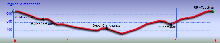 Se rendre à La Possession ou à La Montagne et prendre la direction de Saint-Bernard puis le début de la route forestière de la Plaine d'Affouches - Garer le véhicule au début de la piste et débuter la randonnée en prenant la D41 vers la Montagne - A la première route à gauche, bifurquer et suivre cette route jusqu'au sentier qui démarre sur la droite et plonge vers une Ravine - Au premier croisement de sentier, prendre sur la gauche et longer ce très beau sentier jusqu'à la route qui se termine au Chemin des Anglais - Suivre une partie du Chemin des Anglais en fonction du temps disponible et retourner sur ses pas pour reprendre le même sentier qu'à l'aller - Au premier croisement, prendre à gauche et remonter vers le Sud en direction de Saint-Bernard - Au passage, visiter les belles zones "chamarel" qui donnent l'occasion de superbes photos puis reprendre le sentier qui rejoint le premier croisement et la D41 - Le véhicule est alors à moins de 200 mètres.