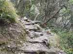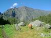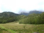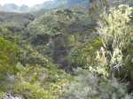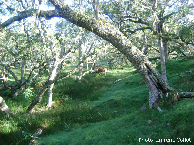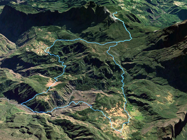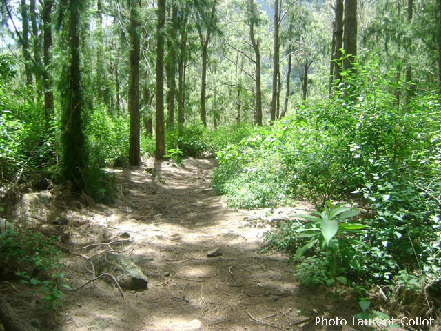 La randonnée débute au Piton Marmite, fin officielle pour les véhicules empruntant la Route Forestière du haut Mafate mais pas pour les piétons qui poursuivent sur ce tronçon en pente douce pour bien préparer les jambes aux 15 kilomètres qui suivront. Les paysages sur Grand Sable, la Plaine des Merles et le Col de Fourches sont toujours agréables (Photo 1). On domine les cryptomerias omniprésents avant d'arriver au Col des Bœufs qui est l'une des entrées de l'île la plus employée. Il faut dire que la Nouvelle est facile d'accès en bas de la longue descente. On embrasse d'un seul regard la Plaine des Tamarins et le Rempart de Mafate du côté du Maïdo et du Grand Bénare qu'on approchera de près en arrivant à la Rivière des Galets. Il est fréquent qu'un hélicoptère fasse la noria entre ce col et les îlets pour les ravitailler en matériel de construction. La descente ne présente guère de difficultés même si on rencontre parfois des marches plus hautes que la moyenne. La traversée de la Plaine des Tamarins ne se décrit plus et on flâne en regardant vers le Gros Morne ou le Morne de Fourche, assis sur le tronc d'un tamarin des hauts tombé lors d'un cyclone mais qui a poursuivi sa croissance comme si de rien n'était (Photo 2). De grandes clairières couvertes de joncs sont entourées de grands tamarins (Photo 3). On peut même y rencontrer des vaches qui vivent heureuses dans cette grande herbe verte (Photo 4). La descente vers la Nouvelle est plus difficile car les marches deviennent plus hautes et quelques fois glissantes. Un détour est possible pour un beau point de vue sur la Nouvelle depuis le Plateau Chêne. L'Îlet de la Nouvelle est le plus grand de Mafate et plusieurs sentiers parcourent le village où l'on peut voir de belles cases et beaucoup de gîtes entourant la chapelle constituée de deux pans descendant jusqu'au sol. Le sentier qui rejoint plus loin la Plaine aux Sables est parfois abrupt et en lacets mais moins fatigant que dans le sens inverse. Après avoir franchi la Ravine aux Sables, toujours à sec, on arrive dans la Plaine du même nom où il est possible de croiser d'autres petites vaches (Photo 6). C'en sera bientôt fini des descentes après avoir franchi la belle pente qui amène par de très courts lacets à la Rivière des Galets. La fin s'effectue sur un sentier ombragé par des centaines de filaos (Photo 8). En fonction de l'heure et de la météo, le détour vers la Cascade de Trois Roches ne prendra que trente minutes, sinon il faut débuter la longue ascension vers Marla sur un sol très souvent dénudé ou poussiéreux et glissant. Le cheminement à plat le long de la rivière est une balade facile sous quelques filaos (Photo 9). On s'approche de la rivière constituée de larges plaques basaltiques bordées de falaises friables (Photo 11). Un escalier en bois amène à des marches pour entamer la remontée. On s'éloigne un peu de la rivière pour franchir un rein en face des petites cascades de la Ravine du Taïbit (Photo 10). Le sentier longe ensuite à nouveau la rivière en rive droite avant le franchissement d'un gué fait de grosses roches. Le sol est parfois très rocailleux et les plantes ont du mal à s'installer (Photo 13). Par beau temps, le soleil chauffe ces roches et la terre glissante qui constitue le sentier (Photo 14). La remontée alterne lacets terreux, pierreux et de belles portions refaites à neuf pour empêcher l'érosion (Photo 15 et 16). En fonction des endroits, on bénéficie de magnifiques panoramas sur la vallée de la Rivière des Galets ou Marla qui approche doucement (Photo 18). L'arrivée à l'îlet s'effectue après une portion très rocailleuse puis une montée plus calme vers le point de vue officiel qui a presque totalement disparu dans la végétation. Comme à la Nouvelle, on peut flâner dans l'îlet ou rejoindre au plus vite le sentier qui vient du Taïbit et remonte à la Plaine des Tamarins. Descendre à gauche en direction de l'école et de la chapelle (Photo 19). Remarquer, derrière le petit édifice, les prairies verdoyantes qui abritent des troupeaux de biches et de cerfs de java. Les vues sur le Taïbit, les Trois Salazes ou la tête de chien sont impressionnantes. Le sentier quitte les habitations en franchissant la très discrète Ravine de Marla puis descend doucement vers la rivière des Galets. On rejoint sans problème Maison Laclos qui semble très isolée au pied du Plateau du Kerval. A partir de Maison Laclos et toujours en fonction de l'heure ou de l'état des jambes, un détour est possible vers la Passerelle sur la Rivière des Galets, proche de beaux bassins ou cascades. Sinon, poursuivre pour franchir le Bras Massine (Photo 22). Une petite cascade qui alimente un bassin en aval du gué peut se rejoindre sans difficulté en sautant de rocher en rocher. Plus loin, c'est le gué sur la Rivière des Galets qu'il faut franchir sans difficulté dans un environnement boisé de filaos (Photo 23). Après le gué, débute une forte pente constituée de lacets courts et nombreux constitués de marches en bois ou en pierre (Photo 24). Le sentier passe parfois près de ravins profonds mais protégés par les bois de couleurs couverts de barbes de Jupiter (Photo 25). On domine de plus en plus la vallée de la Rivière des Galets qui est un véritable canyon par moments (Photo 26). On parvient à la fin de la montée pour profiter du point de vue officiel sur Marla et la Grand Bénare (Photo 27). On retrouve les tamarins et les clairières couvertes de joncs et de hautes herbes où paissent paisiblement quelques petits troupeaux. La Mare aux Serres est plus un marécage qu'une mare mais suffit à abreuver les bovins. La traversée d'une nouvelle portion de la Plaine des Tamarins est un plaisir renouvelé malgré les jambes qui souffrent plus qu'au départ (Photo 28). Les fortes pentes ne sont pour autant terminées car il faut entamer la montée vers le Col des Bœufs. Le sen