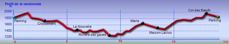Pour diverses raisons, il n'est pas toujours possible de traverser Mafate car il faut pour cela randonner sur plusieurs jours. Lorsqu'on ne dispose que d'une journée pour se ressourcer, cette boucle, ni trop longue ni trop difficile permet de se régaler des magnifiques paysages de Mafate ou des panoramas alentour. Elle emprunte tout d'abord un grand classique de Mafate par la descente à la Nouvelle par la Plaine des Tamarins. C'est toujours un plaisir de traverser cette étendue recouverte de ce grand arbre endémique de la Réunion qui semble résister à tout sauf aux incendies. On rencontre quelques petites difficultés sur le sentier qui sépare le plus grand îlet du cirque à la Plaine aux Sables qui permet de se reposer avant une éventuelle trempette dans la Rivière des Galets ou une visite à la grande cascade de Trois Roches qui attire chaque jour de nombreux randonneurs. Cette belle chute se mérite, quelle que soit la direction prise pour l'atteindre ; la plus difficile vient du Maïdo, surtout si la sortie est effectuée dans la journée. La remontée vers Marla traverse des zones d'intenses éboulis qui ont déchiqueté les parois rocheuses, rendant glissants certains tronçons du sentier, heureusement bien consolidé de marches en bois. Ne pas oublier de boisson car le sol chauffé par le soleil déshydrate fortement. Heureusement, la boutique de Marla est prête à fournir les ingrédients manquants. Si on a peu l'habitude de marcher dans cette partie de Mafate, il ne faut hésiter à profiter de l'occasion pour effectuer une petite visite à la Stèle Joset Ethève, à la passerelle qui a failli être emportée par un gros rocher et surtout aux beaux bassins ou petites chutes d'eau qui l'entourent. On ne rencontre que deux raidillons : Entre Marla et la Plaine des Tamarins et un peu avant de rejoindre le Col des Bœufs.