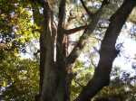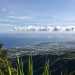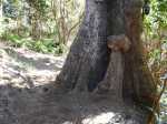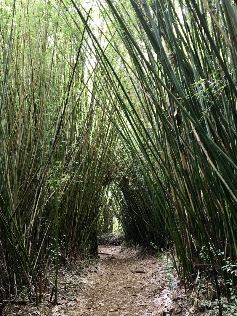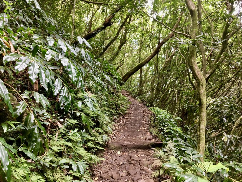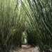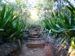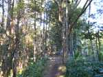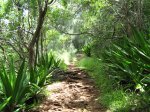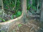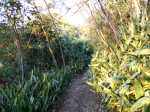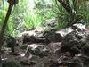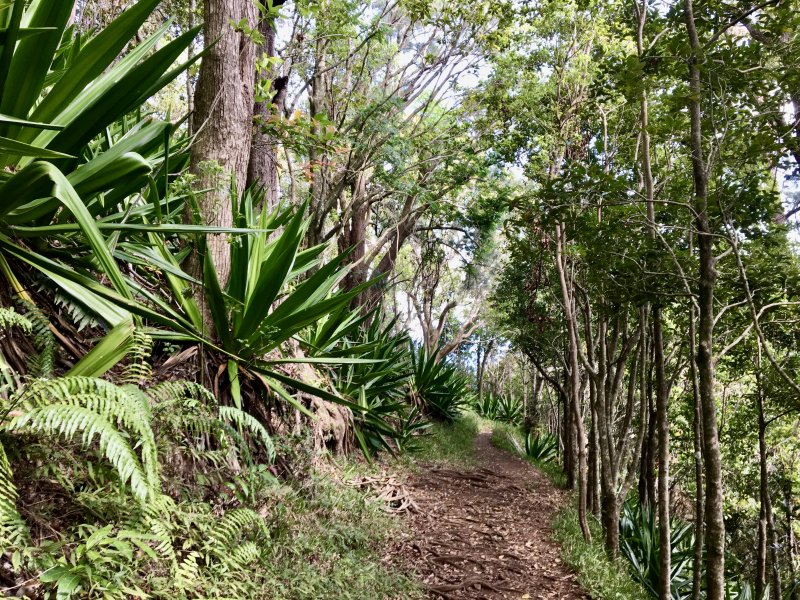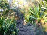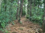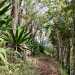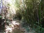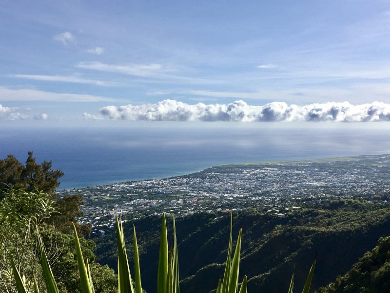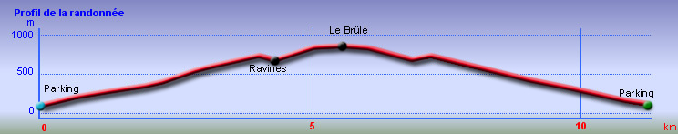 La randonnée débute à la Providence, près d'une aire de loisirs et d'une belle touffe de gros bambous et de palmiers royaux (Photo 1). Le sentier est facile à trouver près des panneaux et poteaux de l'ONF qui prévoient 2h30 de montée pour atteindre le Brûlé. Il débute sur des roches, tout d'abord organisées en marches puis semées ça et là comme pour ralentir la marche (Photo 2). La végétation sur les bords est très pauvre et comporte beaucoup de chocas (Photo 4). Quelques lacets caillouteux rapprochent d'un kiosque qui permet de voir des quartiers de Saint-Denis (Photo 5). Quelques panneaux sous forme de triptyques présentent succinctement la végétation du lieu (Photo 9). D'autres, plus petits comportent un dessin de caméléon (endormi à la Réunion) et le nom de la plante. Quelques marches en bois retiennent la terre quand ce ne sont pas les racines qui le font (Photo 8). Plus on monte et plus les panoramas s'étendent sur le chef-lieu mais ils deviennent rares (Photo 10). Après de nouveaux lacets on rencontre une piste bétonnée et le sentier botanique file vers la droite (Photo 14). Poursuivre sur le GRR2 marqué de rouge et blanc en passant sous le couvert des arbres qui deviennent de plus en plus grands. Les cailloux diminuent mais sont remplacés par les racines constamment piétinées de ces grands arbres (Photo 11). On rencontre également une plantation de cryptomerias où les racines sont encore plus nombreuses mais moins grosses, très glissantes par temps de pluie (Photo 12). Après avoir coupé la piste, le sentier passe entre de nouveaux gros arbres présentant d'énormes racines qu'il faut parfois enjamber (Photo 15). Plus haut, le sentier bordé de jouvences se rétrécit et on retrouve cette piste qu'il faut suivre sur une cinquantaine de mètres avant de la quitter en partant sur la droite vers une zone couverte de filaos sur un sentier assez plat (Photo 16). Puis ce sont les camphriers qui les remplacent dans un sous bois plus aéré que plus bas (Photo 17). Le sentier suit alors la ligne de crête d'où l'on peut voir la vallée de la Ravine du Butor (Photo 18). De l'autre côté on aperçoit parfois les habitations des bas du Brûlé qui dépassent des arbres couvrant les flancs de la Ravine Montplaisir (Photo 21). Avant de plonger vers la gauche en direction de petites ravines, affluents de la ravine du Butor, on croise de magnifiques spécimens de filaos centenaires (Photo 19). Ils semblent participer au concours du plus gros filao et certains ont certainement dépassé le siècle d'existence. Profiter du dernier panorama sur la ravine et sur l'aéroport en direction de Sainte-Marie (Photo 22). Le sentier, très ombragé, descend sur la gauche en légère descente. On rencontre une première ravine étroite et sèche qui se passe sans aucune difficulté sur un sentier humide et gras (Photo 23). Le sentier monte plus fortement sur des marches après la deuxième ravine et on se retrouve sur un sentier glissant bordé de goyaviers (Photo 24). Après une petite plantation d'araucarias (Photo 25) suivie d'une autre d'eucalyptus, le passage s'effectue entre des dizaines de grosses touffes de bambous qui vont jusqu'à créer des tunnels qui cachent de la lumière (Photo 27). Un dernier raidillon, très court, se finit à une rue du Brûlé à quelques mètres d'un petit stade. Il est possible de se désaltérer avant d'entamer la descente par le même itinéraire ou en utilisant la piste ou le sentier botanique pour rallonger et varier le circuit.