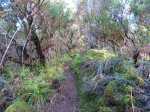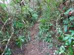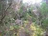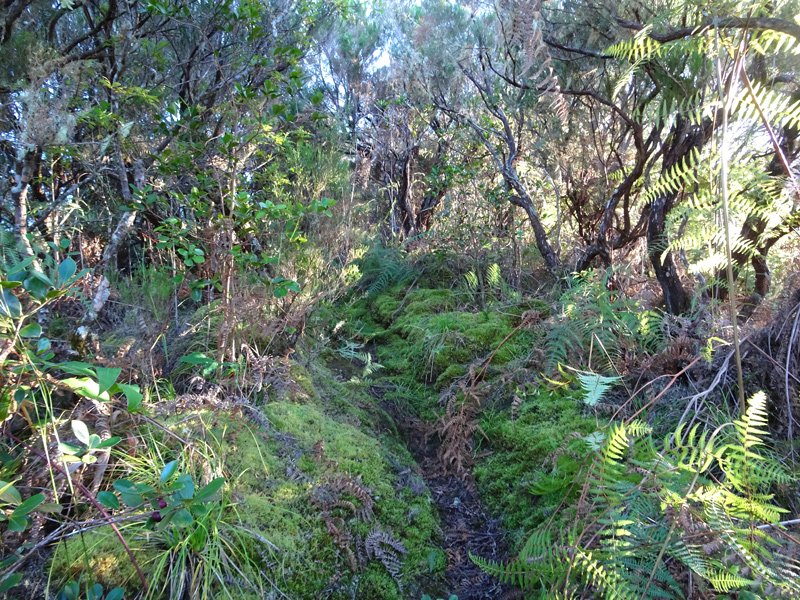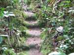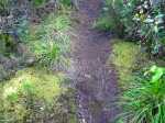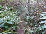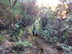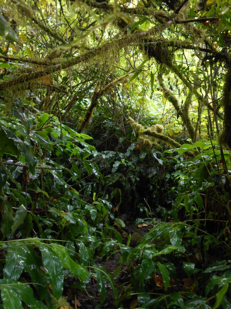 Sentier bien glissant dans la montée avant la ferme. Les longoses sont en train d'empiéter sur le sentier et le rendent très étroit par endroit dans la première partie. Regardez bien où vous mettez les pieds sinon chute garantie. Le sentier reste praticable mais est très envahi par la végétation et arbres tombés, ça fait un peu jungle, lumière verte tamisée de sous-bois.