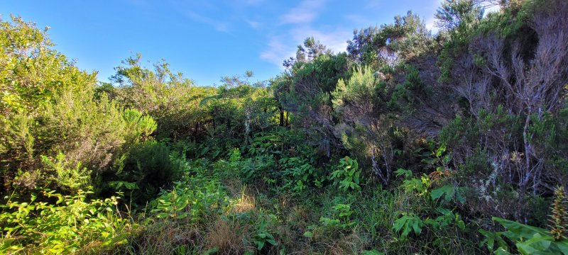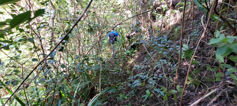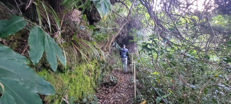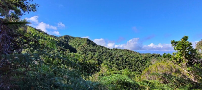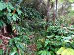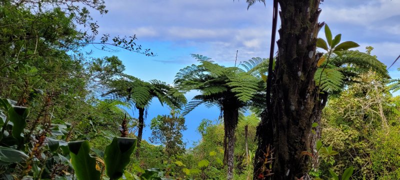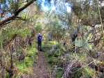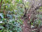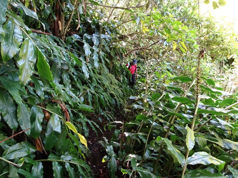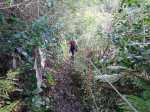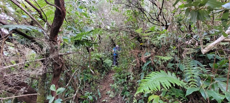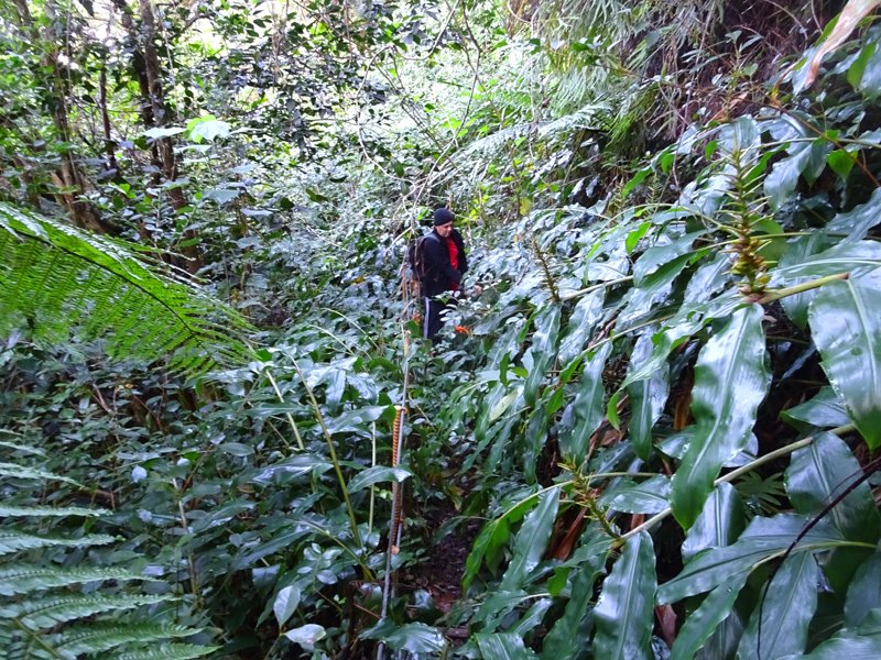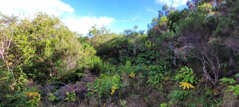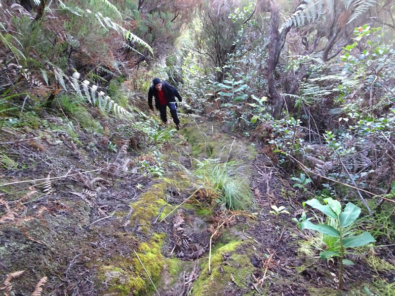 Sentier vers la Ferme Deveaux finalement trouvé après y être passé devant à plusieurs reprises sans l'avoir identifié à cause des longoses et fougères qui avaient repris leurs droits malgré la coupe de Martial en janvier 2016. On a remis quelques coups de sabre. La suite est grimpante, glissante, mais avec quelques beaux points de vue. Les cryptomerias au-dessus la Ferme sont très beaux. Seul bémol, déjà mentionné sur la fiche : les déchets ! On a ramené un sac à dos rempli, et on a dû en laisser, faute de place.