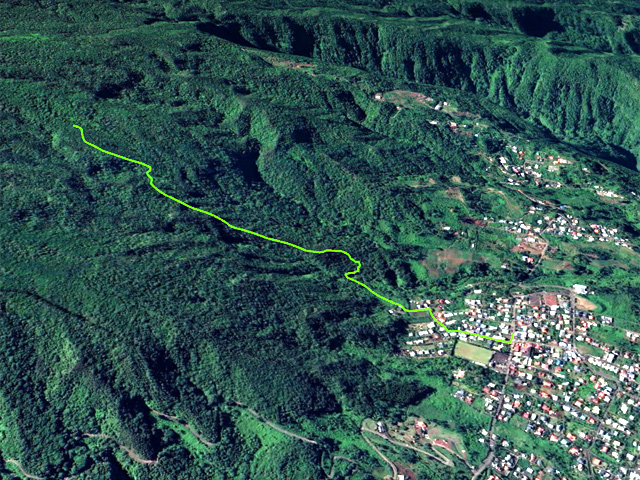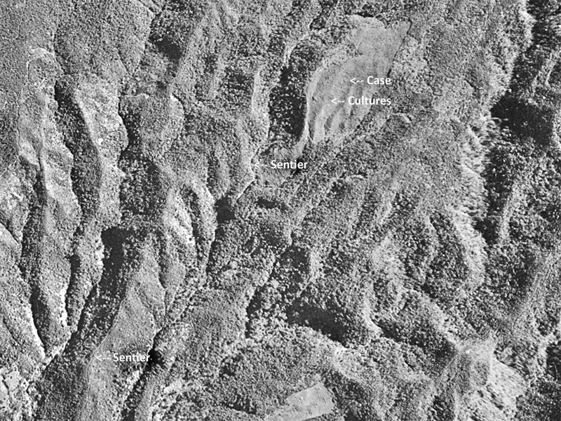 L'image aérienne prise dans les années 60 fait clairement apparaître le sentier quittant le village pour monter en direction du Piton Deveaux. On le voit longer la crête dominant le Bras Cresson. Tout le flanc du piton semble cultivé ou au moins défriché. Les cryptomerias plantés en lisière ont dû l'être au moment où il était facile de circuler. Les longoses, galaberts, goyaviers et vigne marronne ont depuis longtemps détruit ces anciennes cultures.