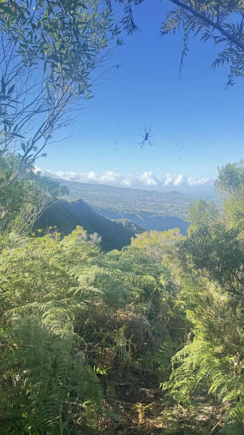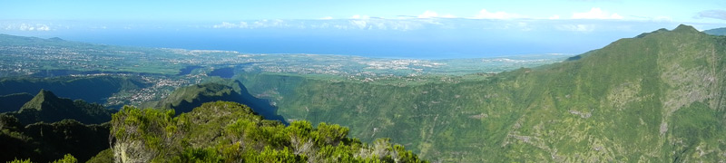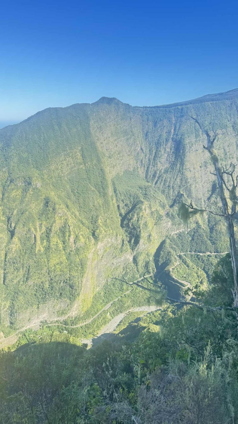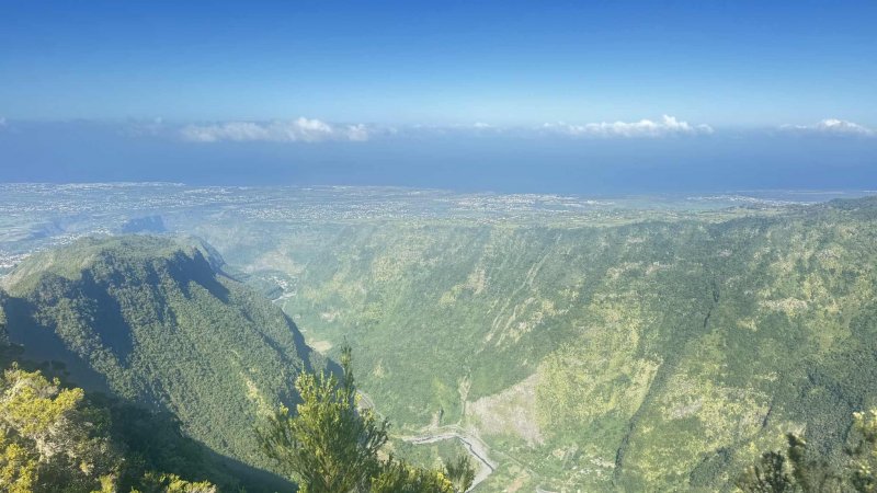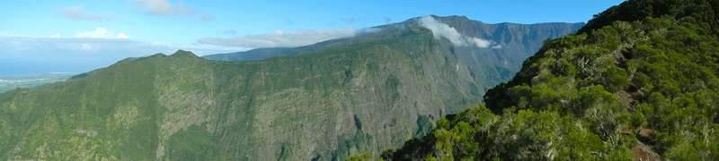 Cela faisait longtemps que je n'avais pas emprunté le Bayonne. Il est maintenant officiellement ouvert, parfaitement entretenu et correctement balisé. Qu'est ce qu'elle est rude cette montée mais elle en vaut la peine. Les panoramas sur Cilaos et la crête du Dimitile jusqu'au Jacky Inard et au Piton des Neiges sont époustouflants. Seul bémol, le bruit incessant, très présent et envahissant des voitures et motos qui montent depuis la route de Cilaos. On ne trouve pas le calme auquel on pourrait s'attendre à cette altitude. Heureusement, dès qu'on bifurque avant la dernière montée, le silence revient. A la descente nous avons emprunté le zèbre et Rosalie pour retrouver notre véhicule.