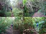 La randonnée débute à l'école primaire de Bras Long, en face de l'EHPAD. La jonction avec le sentier Bayonne, par quelques montées sur route, permet de s'échauffer avant d’entamer la très longue montée vers le Dimitile. Le quartier de Grand Fond Extérieur est assez peu urbanisé et la marche s'effectue sereinement même s'il faut se pencher vers l'avant dans les parties les plus pentues (Photo 1). Au parking pouvant accueillir une demi-douzaine de véhicules, il n'y a plus de départ pour le sentier Bayonne car il a été déplacé plus au Sud. Emprunter alors le sentier du Coteau Sec qui débute par une pente très forte dans les pierres et restes d'escaliers effondrés avec de très hautes marches (Photo 2). Pas de crainte à avoir même si l'on peut penser s'éloigner du Bayonne. On le débusque un peu plus loin sous les filaos. Partir à droite en longeant une rambarde en bambou (Photo 3). Il est moins large que le sentier du Coteau Sec, comporte peu de difficultés et chemine à flanc de falaise ou en ligne de crête jusqu'à un pylône électrique situé au bord du sentier historique (Photo 4). Partir à gauche et entamer la montée de plusieurs heures en prenant dès le départ un rythme adapté à l'effort. Le sentier, assez fréquenté malgré sa fermeture officielle, est large dans une végétation peu entretenue. Les lacets sont fréquents et permettent de diminuer un peu la pente (Photo 5). On arrive facilement, en une demi-heure, au Plateau Raisin, aisément reconnaissable à son sentier passant sous les jamrosats qui poussent si serrés que la lumière du jour a beaucoup de mal à pénétrer. Plus on s'élève, plus les panoramas s'agrandissent de tous côtés. On aperçoit la côte, les coteaux parallèles au sentier, la région des Makes vers la Fenêtre et les remparts des Bénares mais surtout les pointes en direction du Dimitile qui donnent très vite le ton de ce que sera le reste de la montée (Photo 6). Le sentier est toujours correct même s'il n'est pas très large par endroits. On rencontre à peu près tous les types de terrain : zones herbeuses, caillouteuses, terreuses, moussues, humides, bordées de fougères en passant des jouvences aux longoses ou dans les éternels goyaviers ou jamrosats (Photo 7). La pente est constante et les portions de plat très rares (Photo 8). Le sentier est autant en corniche qu'en ligne de crête (Photo 9). Les araignées se plaisent sur le bord des remparts où de grandes toiles peuvent accrocher le vêtement si on est le premier à passer. Ne pas hésiter à se retourner pour profiter des magnifiques panoramas allant jusqu'à l'océan (Photo 10). Le sentier passe souvent le long de l'arête proche du précipice dominant le Petit Serré dont on aperçoit les maisons à l'ombre en regardant vers le Bras de Cilaos. Les sensations de vertige sont rares en raison de la végétation toujours présente (Photo 11). Quand on peut voir la moitié du Cirque de Cilaos, les cryptomerias de la Fenêtre des Makes en face ou une grande partie de la route sinueuse qui rejoint Cilaos, le plus gros de la montée directe est terminé. En revanche, débutent alors une série d'une demi-douzaine de descentes et remontées successives. On utilise souvent des lignes de crêtes dénudées où la trace est de très bonne qualité (Photo 12). Les branles de petite taille facilitent les panoramas qu'on ne quitte jamais (Photo 13). Après 2h50 de montée constante, on atteint un passage un peu vertigineux mais qui a été récemment protégé d'une rambarde (Photo 14). Le sentier quitte parfois l'arête pour emprunter le flanc du rempart mais les montées ne disparaissent pas pour autant. Les points de vue sur Cilaos se multiplient. Il faudra pourtant remonter encore pour redescendre avant la dernière ascension menant au Dimitile. On rencontre quelques éboulis dont un important qu'il faut délaisser et poursuivre sur le sentier de plus en plus difficile à deviner (Photo 15). Les belles portions creusées dans le sol et maintenues par des marches souffrent de plus en plus (Photo 16). Quand on peut voir le Bonnet de Prêtre et le Sommet de l'Entre Deux, il ne reste plus que deux fortes montées où des échelles permettent de passer les pentes les plus abruptes (Photo 17). Les points de vue grandioses sur Cilaos méritent quelques haltes pour se régaler du paysage et souffler un peu (Photo 18). Les premiers tamarins des Hauts annoncent enfin l'arrivée proche du sommet. Quand on profite des panoramas sur Cilaos on est impressionné par la verticalité du rempart en direction de l'Îlet à Calebasse (Photo 20). Quelques barrières protègent du vide avant de se diriger vers le point de vue classique (Photo 21). Après un arrêt à la table d'orientation pour situer les principaux sommets ou îlets, la jonction avec le sentier de la Grande Jument ne prend que quelques minutes. Les jouvences sont plus fréquentes et plus touffues que lors de la montée mais le sentier reste visible. Plus bas ce sont les sabres qui bordent le sentier (Photo 22). Ne pas marcher le nez en l'air car le sentier est étroit et le précipice très vertical. Heureusement la végétation est assez touffue pour freiner une éventuelle chute hormis à la verticale des sources du Grand Bras. On traverse de longues portions recouvertes de branles verts sur un sol rouge et glissant (Photo 23). On atteint rapidement la jonction des Sentiers du Zèbre et de la Grande Jument. Celui du Zèbre est plus boueux et comporte plusieurs lacets dans les bois de couleurs avant d'arriver au départ du Sentier Marron (voir § ci-dessous pour le trouver sans difficulté). La plongée sur ce sentier est immédiate et violente (Photo 24). Le sentier n'est pas très visible mais instinctif. Les marches dépassent le mètre de hauteur et les racines ou arbustes sont indispensables (Photo 25). Après une centaine de mètres très techniques, le sentier devient presque de bonne qualité et le reste 