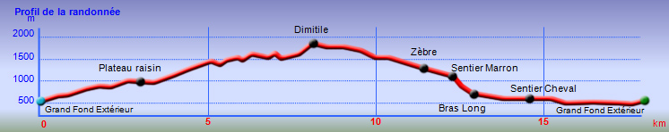 Les montées au Dimitile peuvent être courtes et faciles par le Sentier de la Chapelle, moyennes par celui du Zèbre ou la Grande Jument, très longues à partir de Cilaos ou très difficiles comme celle-ci. De plus, le sentier n'est plus entretenu, devient de plus en plus étroit et comporte des éboulis qui peuvent dérouter. La boucle n'est pas excessivement longue mais l'effort à fournir est constant pour un dénivelé approchant les 2000 m. Une succession de montées et descentes pour épouser au plus près les dents de scie en bordure du rempart de Cilaos coupent les jambes et peuvent démoraliser les plus fatigués. Quand on pense être arrivé au Dimitile, que l'on aperçoit une nouvelle descente et la trace du sentier qui remonte vers l'Est, on a tendance à regarder la carte pour savoir si la montée se terminera bientôt. Heureusement tout a une fin et l'arrivée à la table d'orientation est un véritable soulagement. La descente par le Sentier de la Grande Jument est une longue période de repos qui permettra de se remettre en forme avant d'attaquer la formidable plongée par le sentier marron. Il faut l'avoir effectuée au moins une fois, qu'on soit un adepte de ce genre de sortie ou non. Pas de vertige mais une pente si forte qu'on aurait beaucoup de mal à descendre s'il n'y avait pas tous ces arbustes si judicieusement placés là par la nature. Ceux que l'aventure rebute poursuivront sur le Sentier du Zèbre et le Rosélie qui ne présentent aucune difficulté dans ce sens.