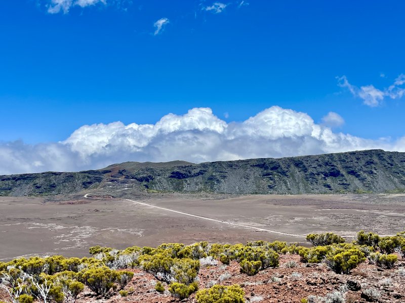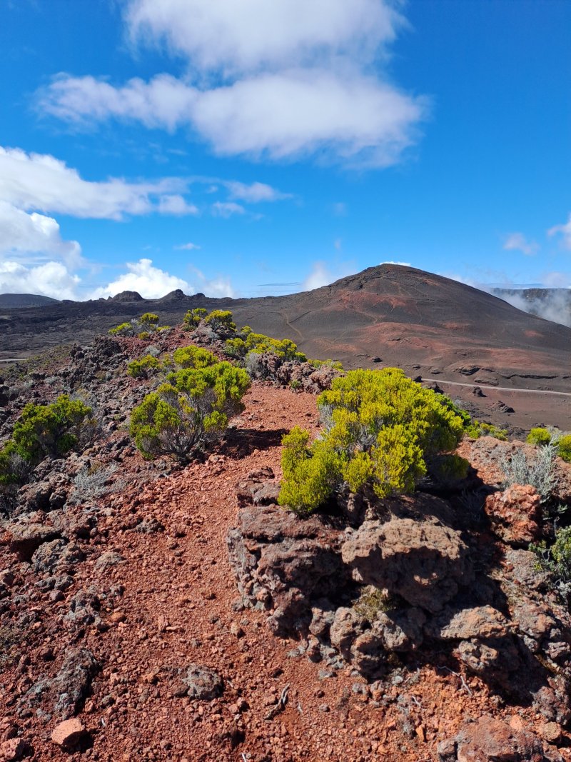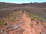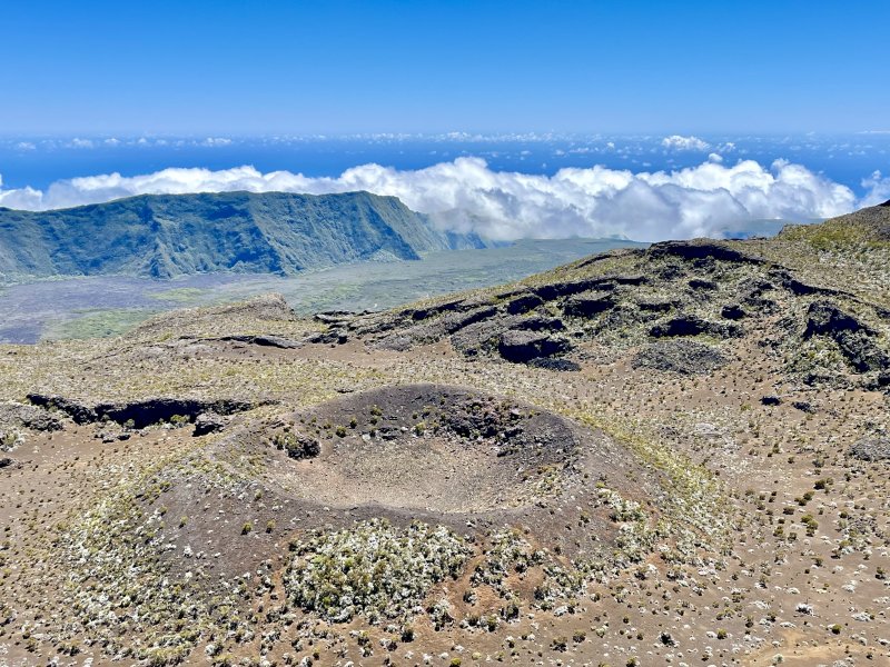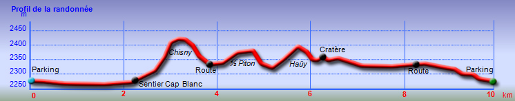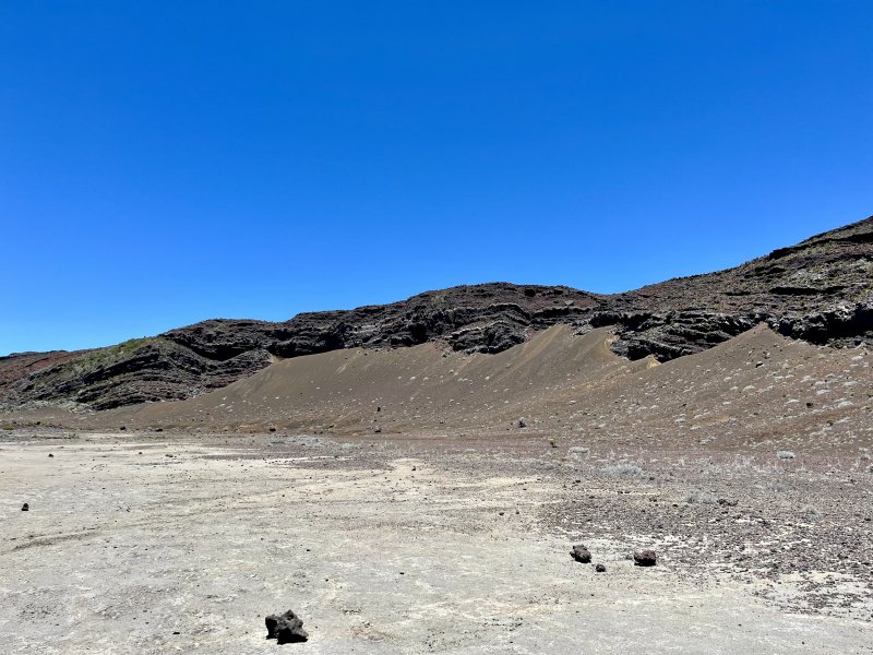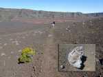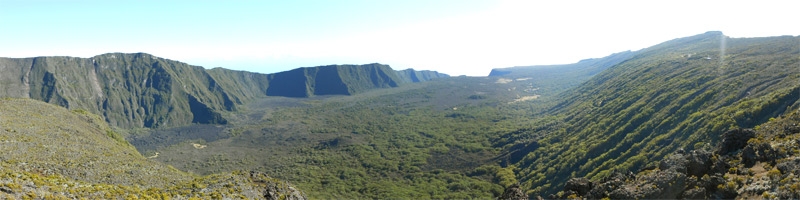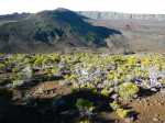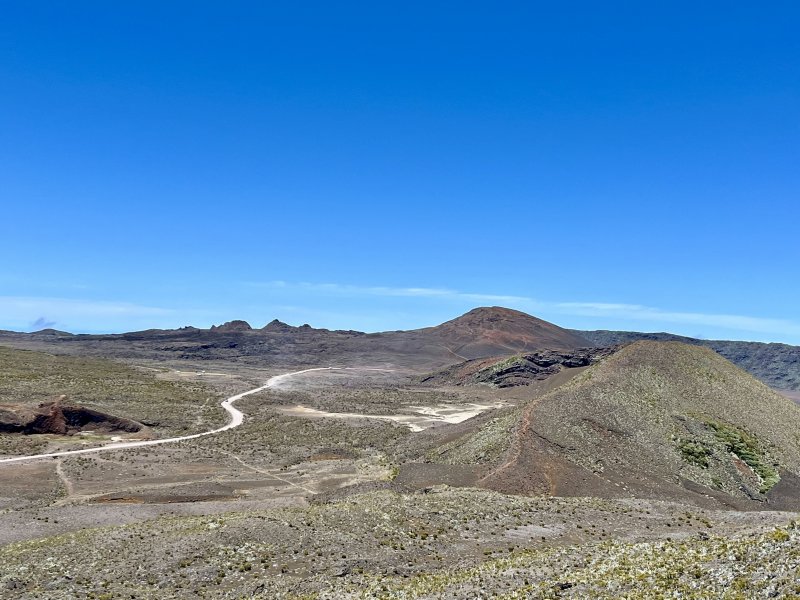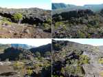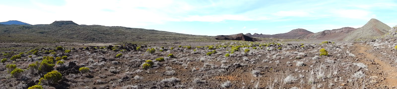 La randonnée débute au pied du rempart du Pas des Sables après avoir emprunté les six lacets de bitume rouge. La piste, toujours infestée de nids de poules, est ainsi évitée en véhicule. A partir de ce point, on peut aller n'importe où sur la Plaine des Sables et se balader au gré des paysages rencontrés en marchant sur un sol sableux totalement plat (Photo 1). Les aspérités sont rares ; ce sont des restes de roches dépassant du sol. Ne pas manquer cette particularité des zones aux couleurs chaudes situées un peu partout sur la plaine. Certaines ont une forme presque circulaire (Photo 2). Après une flânerie sur ce lieu unique au monde, viser le sud du Piton Chisny en laissant le rempart du Morne Langevin (Photo 3). Rejoindre le sentier de Cap Blanc, le traverser et viser un sentier qu'on devine sur le flanc du Piton Chisny. Il n'est pas balisé mais bien marqué. La végétation y est quasi inexistante et l'on rencontre souvent de belles bombes volcaniques expulsées lors de l'éruption strombolienne du Chisny datant d'un millénaire (Photo 5). La pente n'est pas trop forte. Le sentier devient plus discret lorsqu'il passe sur de la lave solidifiée comportant de multiples fissures qui doivent se contourner (Photo 6). Le sommet se rejoint assez facilement après ces 150 m d'ascension. Quelques branles verts tentent de survivre dans des conditions difficiles (Photo 7). Les panoramas sur la Plaine des Sables valent ce court effort pour les admirer. On voit également très bien le Piton de La Fournaise qui apparaît à l'horizon derrière les cratères Aubert de la Rüe (Photo 8). Plusieurs sentiers permettent de rejoindre la Route Forestière du Volcan aperçue depuis le sommet. Entamer la descente glissante et sableuse sur un de ces itinéraires créés par les multiples passages (Photo 9). Traverser la route pour rejoindre les Gendarmes, ces sculptures de lave naturelle qui émergent de la Plaine des Sables au plus près de la piste. Traverser en quelques minutes la courte distance qui sépare du Demi-Piton en zigzagant entre roches et végétation. Le sentier, peu marqué en raison de la roche, n'est pas très large mais se trouve facilement sur l'arête de cet original piton coupé en deux dans le sens de la longueur. La montée est rapide pour s'éloigner du Chisny qui diminue à vue d'œil (Photo 10). Elle est beaucoup plus aisée et le cheminement sur la crête est facilité par l'étroit sentier créé par les marcheurs (Photo 11). Ne pas marcher trop vite pour profiter des panoramas exceptionnels de tous côtés en direction de La Fournaise, du Piton Haüy ou de la Plaine des Sables (Photo 12). Le trajet ne comporte pas d'à-pics ou de zones vertigineuses même si de larges plaques de lave dépassent du sommet (Photo 13). Débuter la descente en direction du Col Lacroix et de la Griffe du Diable qu'on devine déjà depuis le sommet (Photo 14). La Fournaise dépasse à l'horizon et l'on devine le cours de la Ravine du Piton Haüy qu'on arpentera en fin de boucle (Photo 15). On domine enfin de plus près cette Griffe du Diable si caractéristique du pied du Piton Haüy. Avec de l'imagination, on peut effectivement voir une grosse patte griffue lacérer la lave et y laisser de profondes trainées où la végétation s'est installée (Photo 16). La dernière descente, comme au Chisny, est glissante et nécessite un peu d'attention (Photo 17). Au GRR2, partir à gauche et trouver quelques sentes débutant à droite, créées par les curieux désireux d'admirer le cratère sommital. Le début est assez facile dans une végétation ne gênant pas la marche. La pente est plus raide que sur les autres pitons mais la montée s'effectue sans danger si l'on prend soin de contourner un peu les parties molles pour rechercher des portions plus rocheuses et en évitant les fissures. En se retournant, on voit bien la pente que l'on vient de descendre du Demi-Piton (Photo 18). Comme le Piton Haüy est en bordure de la Plaine, on a sous les yeux la presque totalité de cette vaste étendue recouverte de gratons, de lapillis et sables colorés. Le sommet comporte plusieurs failles profondes qu'il faut éviter et un sol facile à fouler sans blesser les plantes qui le recouvrent. La végétation, à cette altitude est rabougrie, facilitant la marche hors sentier. Quelques bombes volcaniques, comme au Chisny, vieillissent et se fissurent lentement (Photo 19). On remarque très vite cette petite merveille au fond du grand cratère (Photo 20). Un petit cratère s'est formé au milieu du plus grand et semble accessible assez facilement. On peut descendre à plusieurs endroits sans danger mais il faut tout de même se méfier de possibles glissades sur les gratons et parties sableuses. La montée au petit cratère, le tour à pied (Photo 21) ou la descente au cœur ne comportent aucune difficulté (Photo 22). Tout autour, les roches déchiquetées sont sauvages et peuvent abriter de petites grottes naturelles (Photo 23). Pour poursuivre la boucle, il est possible de remonter par le même itinéraire ou partir de l'autre côté. Le spectacle sur le Fond de la Rivière de l'Est est déjà très beau et c'est en marchant vers l'est qu'on bénéficiera de magnifiques panoramas sur le Gîte du Volcan, la Forêt Départementale des Plaines du Volcan et le Cassé de la Rivière de l'Est. La descente vers la plaine et la Ravine du Piton Haüy s'effectue assez facilement à travers les branles verts et les roches parfois acérées (Photo 24). Une fois arrivé au sentier officiel, prendre à l'envie la piste, effectuer du hors sentier ou longer le fond de la Ravine du Piton Haüy pour profiter de belles sculptures naturelles laissées par l'eau en période de pluie (Photo 25). On longe le Demi-Piton côté cratère pour se rapprocher du point de départ en traversant de larges parties plates où seules quelques herbes réussissent à pousser (Photo 26). Après la pluie, la ravine comporte quelques 