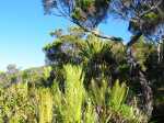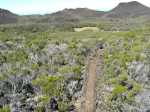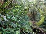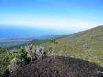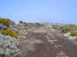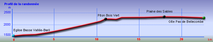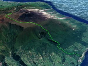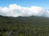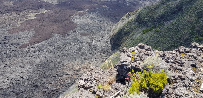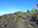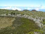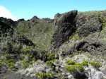 La randonnée débute à l'église de Basse Vallée qui dispose d'un arrêt de bus et d'un grand parking. Dans ce cas, on commence la montée par la route jusqu'à la Maison Forestière de Béloni (en vente) pour récupérer, un peu plus loin sur la droite, le sentier qui rejoint le Gîte de Basse Vallée. Cette première partie, sur un sentier caillouteux, traverse la forêt de bois de couleurs et ses plans de vanille installés un peu partout à l'ombre sur les arbustes (Photo 1). Pas de difficulté particulière pour cette portion à peine tortueuse qui traverse une belle forêt des bas assez peu envahie de plantes invasives (Photo 2). Ce sont surtout les fougères, humides le matin, qui bordent le sentier (Photo 3). Le sentier coupe par quatre fois l'étroite Route Forestière de Basse Vallée (Photo 4). Chaque fois le sentier reprend de l'autre côté. Certaines portions montent assez fortement mais, en règle générale, la pente est assez faible et régulière. Certaines parties sont assez plates sur les feuilles tombées d'une végétation touffue (Photo 5). D'autres, plus encombrées de racines et de pierres moussues, sont un peu plus difficiles (Photo 6). Repérer dans la montée les grottes ou anfractuosités particulières liées à ce type de paysage accidenté. On peu même descendre dans l'une d'elles sur la gauche du sentier. On se rapproche du Bras Plat qu'on suivra jusqu'au gîte. Le fond recouvert de mousse lui donne souvent un très bel aspect mais attention à la glissade facile. Les gros arbres sont rares mais on en rencontre tout de même ça et là ainsi que de grosses racines en bord de sentier (Photo 8). Quelques cultures sur la droite, principalement de vacoas (pandanus) puis la route pour la 5ème traversée marquent l'arrivée au gîte qu'on ne verra pas puisqu'on bifurque immédiatement en direction de la RF des Camphriers. Partir aussitôt à gauche sur un raccourci qui monte dans les goyaviers, les bois Noël (Ardisia crenata) et les losto café (Gaertnera vaginata) à l'odeur agréable pour rejoindre la Route Forestière des Camphriers, dans le dernier lacet. Bien profiter de cette partie qui monte lentement sous les camphriers odorants car les choses vont se compliquer à partir du nouveau kiosque. Visiter la grotte sur la gauche, cachée par la végétation avant de s'approcher du kiosque. Le sentier commence à cette aire de repos. Il grimpe dans les bois de moyenne altitude en offrant peu de panoramas. Il se rapproche de la Vallée Heureuse après 500 mètres mais les occasions de voir le fond sont également rares en raison de la végétation. C'est une succession de courtes montées suivies de courtes descentes, augmentant ainsi le dénivelé de la journée. Près d'un kilomètre plus loin, en s'approchant d'une petite ravine, il oblique sur la droite et contourne le Piton Ravine Basse Vallée sans qu'on le voit vraiment, surtout qu'il dépasse à peine de la forêt. Les jambes commencent à chauffer car 1200 m viennent d'être grimpés et il en reste autant à effectuer. On profite parfois de vues sur la région qui permettent de remarquer que la pente est faible mais qu'il reste encore beaucoup de montée avant de parvenir à la Fournaise (Photo 9). La végétation forestière diminue et se remplace doucement par les branles et les fougères arborescentes (Photo 10). Les montées et descentes successives ne diminuent pas pour autant. La pente moyenne non plus ne faiblit pas et on parvient, 600 m plus haut au Piton Rick, un cratère dépassant de la végétation de plus en plus rase (Photo 11). Il reste encore quelques touffes de branles et de hautes fougères (fausses osmondes) qui égayent le paysage. Puis on poursuit dans les branles verts qui diminuent encore de taille. Vu l'altitude, c'est beaucoup plus pratique pour admirer le paysage allant jusqu'à l'océan (Photo 13). Puis le sentier s'approche des zones de plus en plus désertiques des Puys Ramond (Photo 15). On frôle des cratères profonds difficiles d'accès (Photo 16 et 17) avant de tenter l'escalade d'autres cheminées dépassant du sol (Photo 18). Tous ces cratères s'escaladent mais il faut avoir du temps pour cela car il reste peu d'ascension mais la distance est encore longue jusqu'au gîte. On peut visiter cette région et pénétrer dans de nombreux tunnels en consultant cette randonnée. A 2000 m, la pente se calme enfin en quittant les puys (Photo 19). Le sentier, déjà balisé de blanc voit ses taches de peinture se multiplier, signe qu'on approche de l'Enclos Fouqué où le brouillard sévit une bonne partie de l'année (Photo 20). Le soulagement arrive enfin à 2200 m quand on s'approche des zones herbeuses du Piton de Bert (Photo 21). Suivre alors le bord de la caldeira et marcher presqu'à plat sur un sentier large et même une piste récemment construite. Prendre l'un ou l'autre et marcher facilement jusqu'au croisement avec le sentier redescendant au gîte par la rive droite de la Vallée Heureuse. On frôle un semblant de cratère plat qui peut parfois contenir de l'eau (Photo 22). Depuis le bord, on voit très bien le Pas de Bellecombe (Photo 23) qu'on peut rejoindre directement à partir du Piton Rouge en continuant de longer le rempart dominant l'Enclos Fouqué. Sur la droite, le Piton de la Fournaise en impose par sa taille (Photo 24). Si on reste sur le GR, on passe près d'un oratoire original fait de plaques de lave empilées puis à quelques mètres de la Caverne du Chisny. Le sol est plat et très agréable surtout dans ces paysages exceptionnels de la Plaine des Sables. On parvient à la route forestière du Volcan et on se rapproche tranquillement du Demi-Piton (Photo 26). On peut filer tout droit vers la Griffe du Diable ou prendre à droite la route en terre et ses nids de poules (Photo 27). Que l'on emprunte l'une ou l'autre, on parvient enfin au gîte pour un repos bien mérité. Le lendemain, c'est une demi-douzaine de circuits qui peuvent s'effectuer
