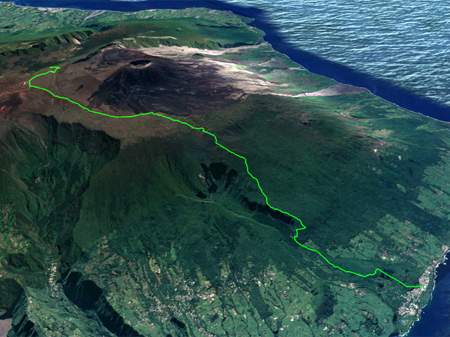 Cette longue randonnée permet de rejoindre directement la route nationale 2 au volcan en n'empruntant que quelques dizaines de mètres de route. Elle est longue et monte constamment jusqu'au Piton de Bois Vert et nécessite un assez bon entraînement pour ne pas dépasser la durée de marche minimum avant l'arrivée au gîte. Ne pas oublier de réserver le gîte longtemps à l'avance en fonction de la saison car il est presque impossible d'effectuer l'aller retour en une seule journée. Des variantes sont possibles en passant par la Forêt de Mare Longue en prévoyant deux heures supplémentaires ou par le Sentier Jacques Payet à l'Ouest de la Vallée Heureuse. D'autres explications avec la sortie aux Puys Ramond, Matouta ou le Tremblet depuis la Plaine des Sables.