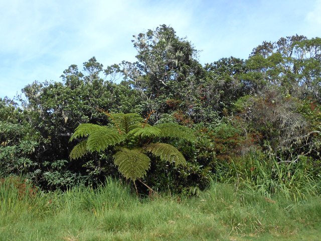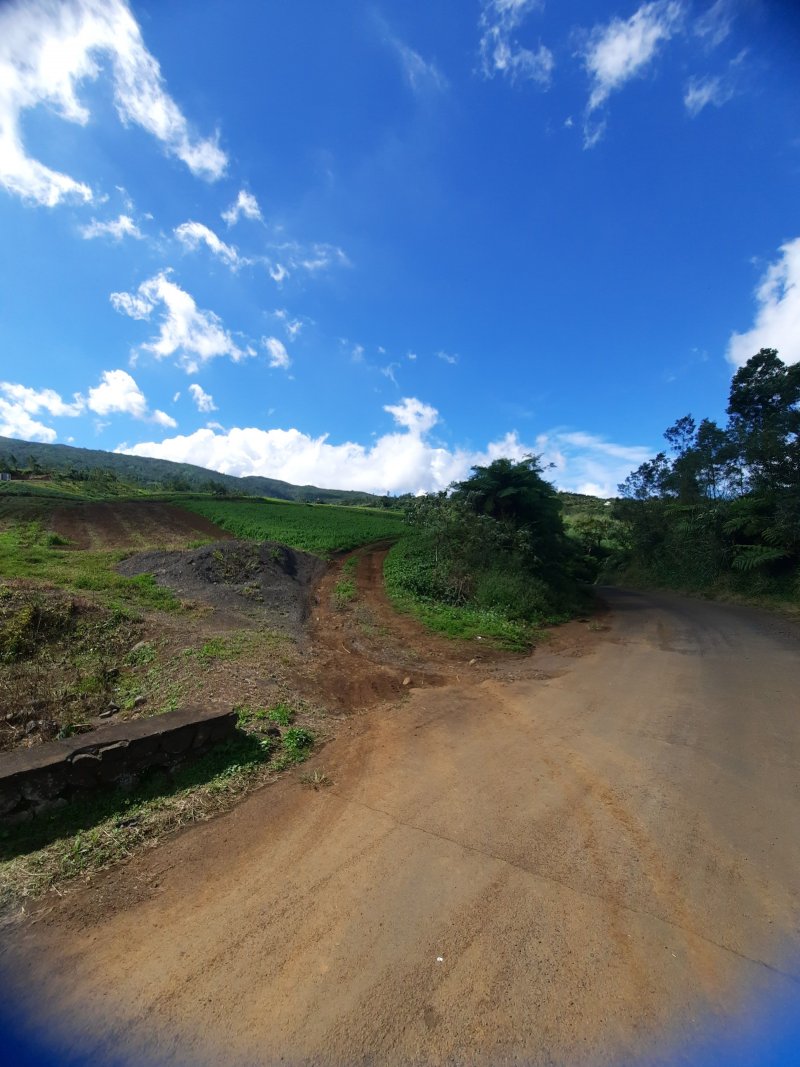 La randonnée débute dans les champs de salades, de choux, de carottes et de courgettes après avoir passé le Piton du Relais, l'aire de pique-nique, la chapelle et le centre équestre du Relais (Photo 1). Pour ne pas manquer le début du trajet, compter 1300 m à partir de la chapelle et garer le véhicule à la piste qui part tout droit dans un virage à droite, près d'une maison en bordure de maraîchage où l'on est accueilli par les aboiements des chiens. Continuer à pied sur la route et obliquer à gauche, 50 mètres plus loin, sur la piste qui démarre dans les champs en direction du nord. Il n'y a pas de balisage et la piste ressemble à toutes les autres pénétrant dans des champs. On suit cette piste le plus naturellement possible entre les maraîchages puis, plus haut, sous les acacias. La piste monte constamment par des lacets pour traverser la forêt communale de Petite Île. Elle alterne des sols herbeux qui se font lentement dévorer par les jouvences (Photo 2). Certaines zones sont entièrement recouvertes de vigne marronne rendant la piste inutilisable par manque d'entretien régulier (Photo 3). Il est d'ailleurs conseillé d'emporter un coupe-coupe dans le sac pour éviter ou atténuer les griffures. La montée régulière comporte quelques parties terreuses glissantes par temps humide. Les portions envahies par les jouvences sont beaucoup plus agréables que celles couvertes de vigne marronne (Photo 4). Les acacias noirs rencontrés depuis les maraîchages laissent petit à petit leur place aux bois de couleurs et fougères arborescentes. La piste se transforme plus loin en un superbe sentier qui pénètre dans la forêt primaire. Le contraste est saisissant au milieu des troncs noueux et des épiphytes (Photo 5). Il comporte quelques pentes faciles à négocier et beaucoup de portions plates qui retiennent la boue après la pluie (Photo 6). On le suit jusqu'aux alentours du Piton La Mare sur de belles portions bordées de magnifiques arbres dont les racines viennent parfois obliger à lever le pied (Photo 7). Cette belle forêt aux arbres moussus recouverts d'épiphytes et d'orchidées est par endroit en meilleur état que celle, plus classique, de Bélouve (Photo 8). A la fin, le sentier est de plus en plus envahi de jouvences, mouillées le matin par la rosée, sans gêner pour autant le cheminement. On arrive par une courte descente à la clairière de la Mare, fin du sentier et début de la piste qui relie la route de Notre Dame de la Paix. La Mare porte bien son nom ; c'est une petite étendue d'eau claire surtout retenue par les travaux qui ont permis le passage de la piste. Elle est entourée de hauts fanjans, de bois de couleurs, de joncs et d'arums du plus bel effet au moment de la floraison (Photo 9). Des troncs posés au sol permettent de passer la zone humide sans se mouiller les pieds car l'eau y coule en permanence. Dès la fin de ce caillebotis, on chemine sur une piste parfois glissante sur ses parties recouvertes de terre lisse. Elle monte fortement au début mais s'assagit par la suite quand elle devient Chemin de la Forêt des Hauts de Mont Vert. On est à 1500 m d'altitude et les points de vue portent jusqu'au Tampon et à Saint-Pierre. Les prairies abandonnées, envahies de fougères arborescentes, de digitales et d'arums sont superbes à la fin de l'hiver (Photo 10). On les devine encore sur les flancs du Piton de la Mare où elles se couvrent petit à petit de plantes envahissantes (Photo 11). Un banc à mi-parcours permet une pause près d'un nouveau point de vue (Photo 12). Le regard porte également sur toute la région de Saint-Pierre, à peine cachée par les arbres (Photo 14). Plus haut, la piste qui oblique à gauche pour longer le rempart est bordée d'un côté par les espèces plantées pour en faire une continuité du Sentier Botanique de Notre Dame et de l'autre par le rempart vertical de la Rivière des Remparts. Quelques trouées ou petits sentiers permettent de s'approcher du bord pour apercevoir le fond ou Grand Coude de l'autre côté. S'il n'y a pas de brouillard, on voit même le Nez de Bœuf à l'horizon ainsi que le Bras de Mahavel (Photo 15). Cette piste en montée faible constante est très agréable lorsqu'elle est bordée de fougères arborescentes ou de fleurs (Photo 17). On y trouve presque tous les bois de couleurs les plus classiques avec beaucoup de mahots et de fleurs jaunes (Photo 18). On arrive à la barrière qui gardait les troupeaux au moment de l'exploitation des prairies ; elle est désormais plus souvent ouverte. La remontée cesse au moment où l'on emprunte une petite route rejoignant sans effort la route de Notre Dame de la Paix (Photo 19). Dans le cadre d'un entraînement de footing, il est possible alors de faire demi-tour pour éviter la route. Commence alors un long périple sur la route qui serpente tout d'abord sous les cryptomerias, passe au plus près du départ du Sentier Botanique et se poursuit jusqu'au village. Même si la fatigue se fait sentir, ne pas hésiter à rejoindre le belvédère pour des vues magnifiques sur Grand Coude, Mahavel et Roche Plate au fond de la Rivière des Remparts à moins de garder cet écart pour le retour, moins fatiguant (Photo 21 et 22). Effectuer une courte incursion sur ce sentier botanique de toute beauté (Photo 23). On n'est pas obligé de faire le tour complet pour rencontrer de belles racines (Photo 25) ou des arbres centenaires couverts de toutes sortes de plantes (Photo 26). Revenir sur la route et rejoindre le Village de Notre Dame de la Paix. Le plus difficile, presque tout en montée, est terminé car la chapelle se situe plus bas à la sortie du village et se rejoint par une petite route facile à trouver dans un virage proche d'une première chapelle également appelée notre Dame de la Paix. La chapelle "officielle" est un petit bâtiment banal au toit de tôle (Photo 27). Comme souvent, l'intérieur tranche vraiment car tout est blanc, propr