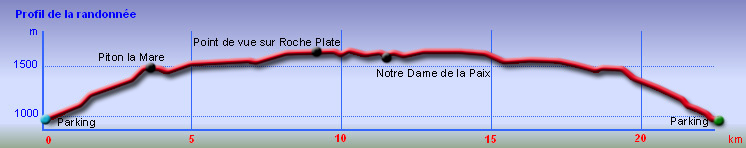 Se rendre à Petite Île et monter au Piton du Relais à Manapany les Hauts - Passer le Piton, l'aire de pique-nique, la chapelle et le club hippique - A 1300 m de la chapelle garer le véhicule à la piste qui part tout droit dans un virage à droite, près d'une maison - Prendre la route sur 50 mètres, obliquer à gauche sur la piste qui démarre dans les champs et se transforme en sentier qu'on suit jusqu'au Piton La Mare - Traverser la forêt primaire jusqu'aux premiers pâturages - Passer devant le panneau indiquant le sentier et obliquer à droite en suivant le chemin de service jusqu'au rempart de la Rivière des Remparts - Profiter du panorama sur Grand Coude et la vallée - Le chemin continue en longeant le rempart jusqu'à la barrière marquant la fin - Franchir la barrière et suivre la route forestière qui mène à la route de Notre Dame de la Paix - Marcher 1000 m pour arriver à l'embranchement du sentier botanique et du point de vue sur Roche Plate - Profiter du spectacle ou faire le tour du sentier botanique puis reprendre la route durant 3 km jusqu'au village de Notre Dame de la Paix - Poursuivre jusqu'à l'embranchement de la route de Notre Dame de la Paix - La chapelle se trouve à 650 m de ce croisement - Le retour s'effectue par le même itinéraire.
