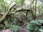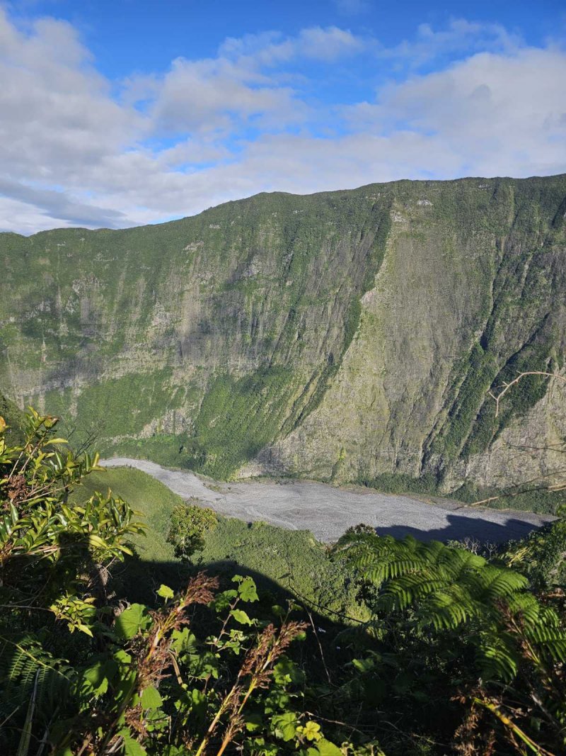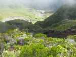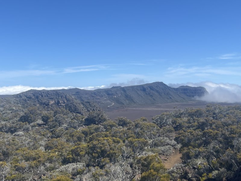La boucle débute à Grand Galet où plusieurs places peuvent accueillir un véhicule pour la journée. Il vaut mieux se garer assez bas dans le village car la pente de 450 m pour rejoindre Grand Coude est assez violente et il est bien d'avoir chauffé un peu les muscles auparavant. La pancarte indiquant Grand Coude a disparu et le sentier n'est plus toujours entretenu. Le sentier, qui démarre dans les bananiers proches de quelques champs est étroit (Photo 1). Il comporte des portions rocheuses non sécurisées et glissantes, des marches si hautes qu’on ne peut plus les nommer ainsi, des racines qui peuvent aider tout comme elles peuvent gêner la progression, de la végétation parfois envahissante, etc. (Photo 3). On emprunte ensuite routes ou pistes pour rejoindre la petite supérette, l’église et le rempart en direction de l’ancien sentier de découverte de Grand Coude ou des Trous de Cissia. Profiter de la traversée du plateau pour repérer le haut du Morne Langevin qui, pour l'atteindre, demandera quelques efforts sérieux (Photo 4). La montée au kiosque est un classique de la région sur un sentier comportant beaucoup de marches en rondins ou des parties plates bordées de fougères, cannes fourragères et surtout vigne marronne (Photo 5). C'est après le kiosque que les choses sérieuses vont commencer. L'ascension vers le Morne débute par des portions assez plates mais boueuses jusqu'au début de la véritable montée. La forêt est magnifique et exempte de plantes envahissantes. Il est conseillé de bien nettoyer équipement et chaussures au système mis en place en début de parcours. Après les ravines les plus marquées qui imposent quelques dents de scie, le sentier attaque sa montée sur des centaines de marches (Photo 6). Le travail de réhabilitation du sentier a demandé un travail colossal (Photo 7). Plus on s'élève et plus la pente s'accentue, toujours sur ces marches souvent hautes (Photo 8). Les passages les plus rocheux s'effectuent par de belles échelles (Photo 9). Elles se succèdent régulièrement à partir d'un point de vue aménagé sur l'arête rocheuse. Marquer la pause à cet éperon pour profiter des magnifiques panoramas sur la région (Photo 10). En regardant vers l'amont, on voit qu'il reste encore beaucoup à grimper (Photo 11). Après deux heures de grimpette toujours aussi difficiles, une dernière échelle suivie d'une barre rocheuse indiquent enfin le sommet pour retrouver le plateau du Morne Langevin. Une fois le haut du Morne atteint, trouver le sentier de bord qui débute aussitôt sur la droite. Il longe le rempart et donne la possibilité de beaux panoramas sur Grand Pays et les forêts qu'on traversera dans deux heures. La végétation est plus rabougrie et clairsemée excepté quelques ilots sans doute plus humides (Photo 12). Effectuer ou non une halte au point de vue du Morne Langevin et entamer la jonction avec le Pas des Sables en longeant le rempart sur un sentier agréable qui permet de se reposer en profitant du spectacle sur le Piton Chisny, les taches rouges de la Plaine des Sables et le grand cassé de Grand Pays (Photo 13). Ne pas manquer de s'arrêter un peu pour se régaler du spectacle unique sur la plaine, surtout qu’à cette heure, le soleil est haut et fournit de belles couleurs (Photo 13). Une fois à la fin du sentier, il faut utiliser un peu de route pour rejoindre la Plaine des Sables : mais quelle route (Photo 14) !