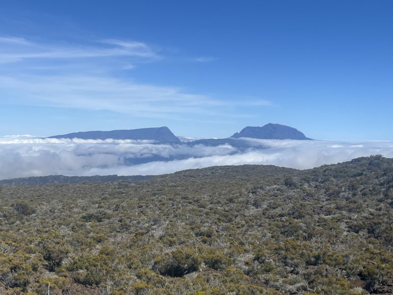 Voici une longue et magnifique randonnée autour du Morne Langevin qui laissera pour quelques heures des douleurs dans les muscles au réveil du lendemain mais en gravera dans la tête pour de longues semaines. Outre le côté très sportif de la sortie, on aura la chance d’admirer toutes sortes de paysages grandioses ou uniques (prairies, forêt primaire, zones rocheuses, Plaine des Sables, gratons, coulées de lave, etc.). La sortie est longue et difficile et nécessite un très bon entraînement ainsi qu'une confortable réserve d'eau car les sources de la montée au Morne Langevin jusqu’à la descente vers Grand Pays sont inexistantes. Même si les paysages sont sublimes et variés, ne pas trop traîner en route pour éviter de terminer à la tombée de la nuit. Voilà pourquoi il vaut mieux partir de Grand Galet que de Grand Coude pour éviter la montée entre les deux villages une fois la nuit arrivée.