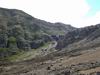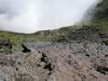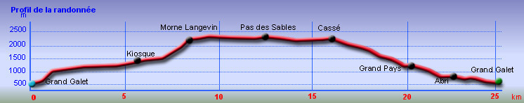 La Plaine des Sables peut se traverser par le sentier de Grand Galet qu'on trouve sur la droite 300 m après le dernier lacet ou par la plaine elle-même en longeant le pied du Morne Langevin qui permet de découvrir de meilleure manière cet endroit unique en se reposant un peu les jambes (Photo 16). Quelle que soit la décision, ne pas manquer les plaques colorées à mi-parcours (Photo 17). Dans les deux cas, rejoindre le sentier et entamer la descente assez raide vers Grand Pays. Cette plongée qui permet de rejoindre Grand Pays, Cap Blanc ou Grand Galet est impressionnante, tant en montée qu'en descente (Photo 18). La pente y est forte et les lacets très serrés. On se retrouve vite au pied du Morne Langevin (Photo 19). On longe des paysages sauvages et chaotiques et on a même l'occasion de marcher longuement dans un fond de ravine basaltique qui n'a que quelques siècles d'érosion (Photo 20). La végétation n'est pas très haute mais elle est touffue, empêchant toute exploration (Photo 21). On longe parfois de profondes failles lorsqu'on chemine sur le sentier en lacets (Photo 21). Le mieux est de bien rester sur le sentier car d'anciens effondrements l'ont parfois diminué de moitié en largeur. De plus, en cas de chute, on se retrouve très vite 50 m plus bas (Photo 23). Le sentier est le plus souvent terreux mais on trouve également des parties assez pierreuses (Photo 25). On devine déjà Grand Galet dans le fond de la vallée (Photo 26). Plus bas, à Cap Blanc, le sentier traverse une très belle forêt de filaos qui se poursuit jusque sur les flancs des remparts de Foc-Foc (Photo 26). Ne pas oublier, après avoir passé l'abri de Cap Blanc et traversé la rivière, d'admirer la petite cascade sur la droite, bien visible depuis qu'un observatoire a été aménagé le long de la Grande Ravine. Le sentier traverse encore quelques champs à moitié abandonnés (Photo 28) avant de retraverser la Grande Ravine encombrée de gros galets.