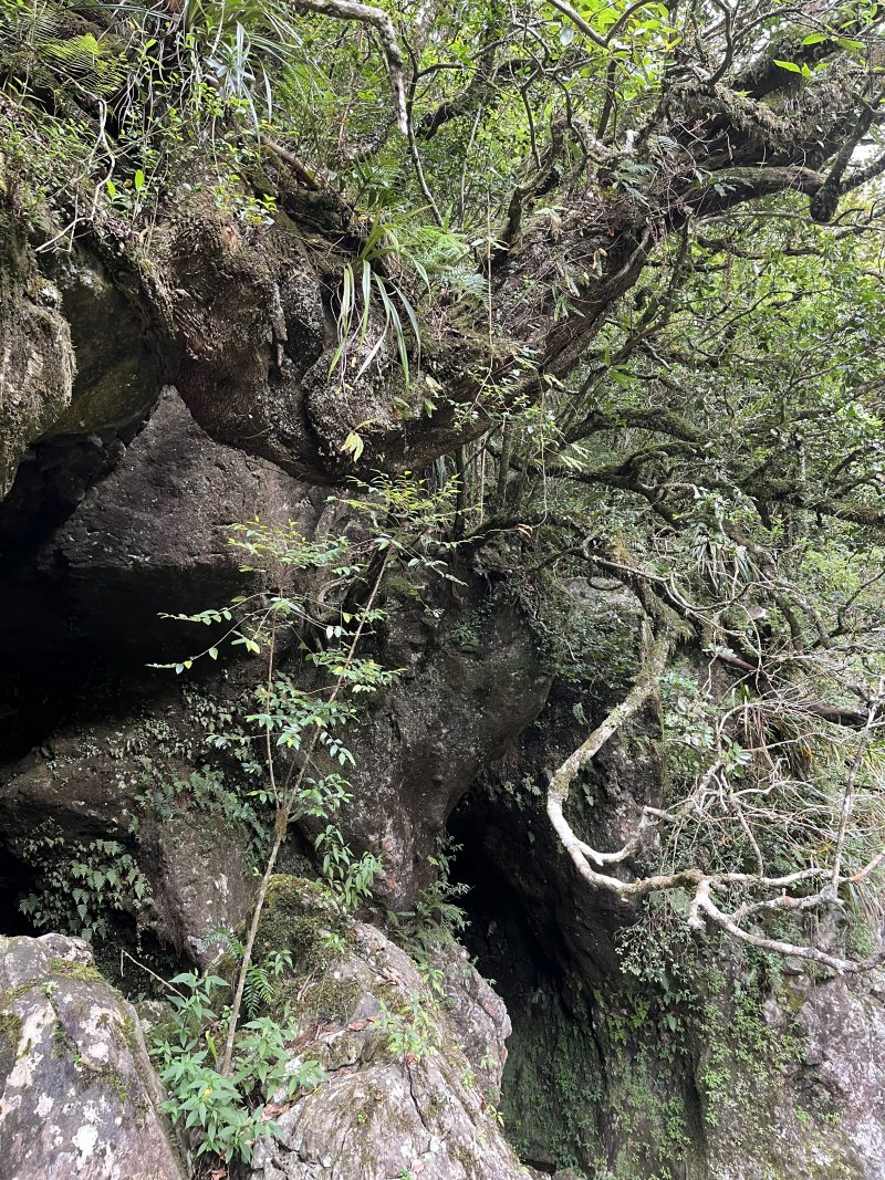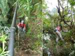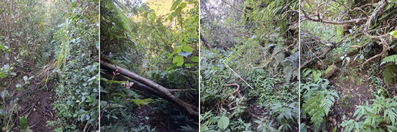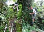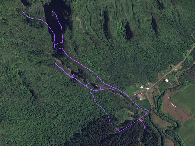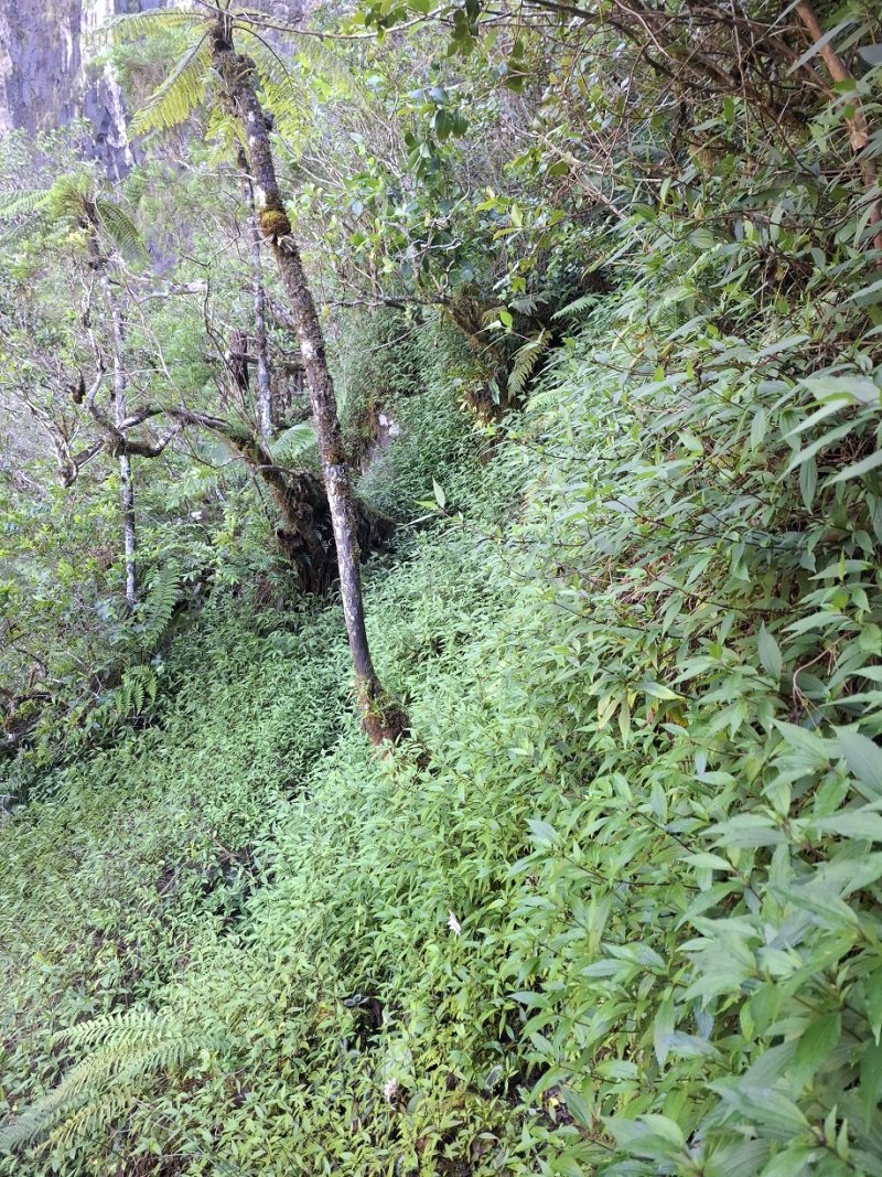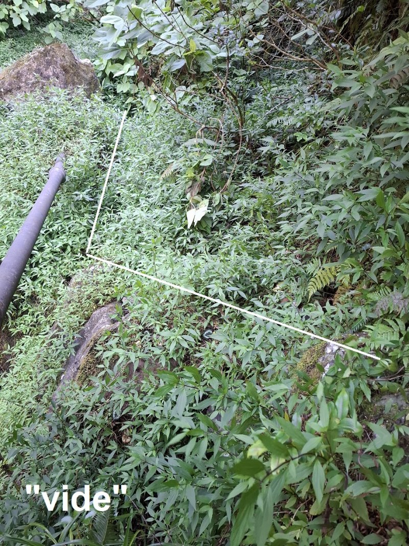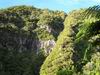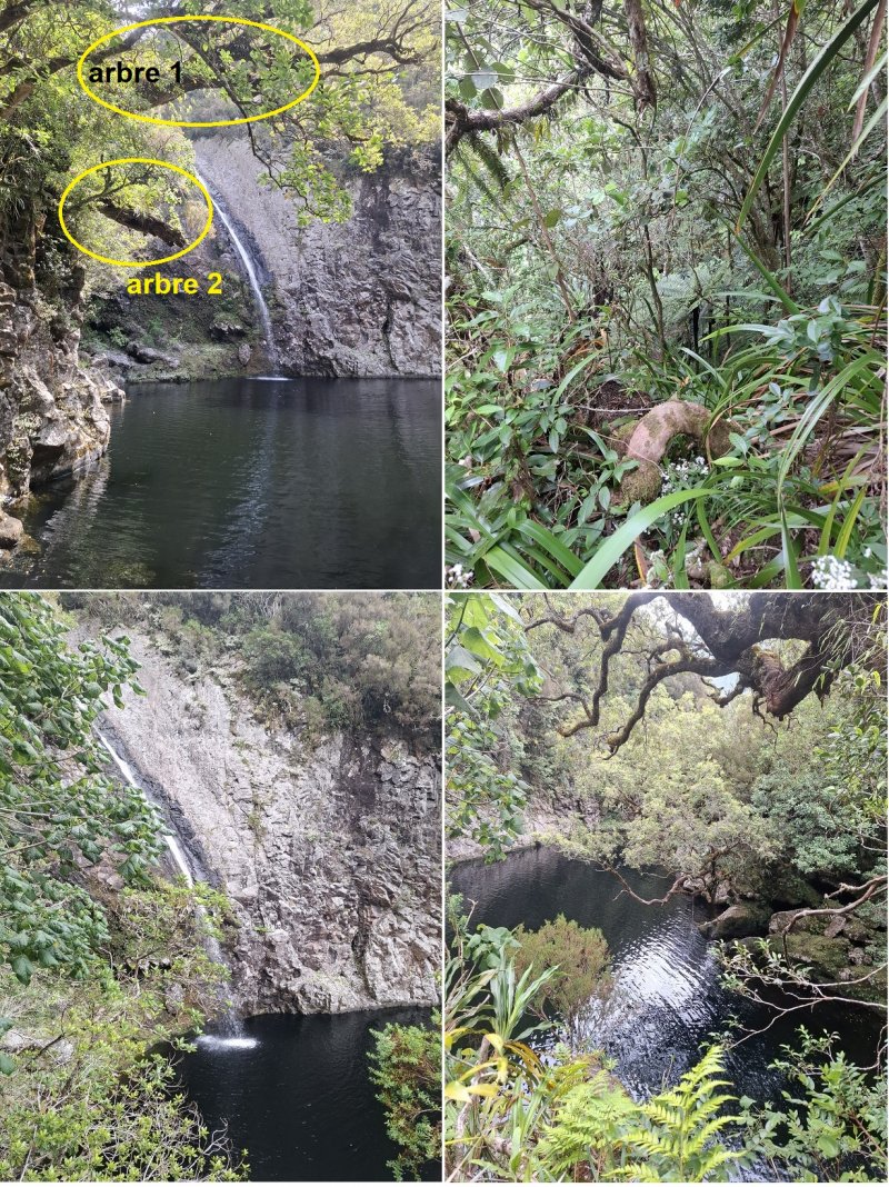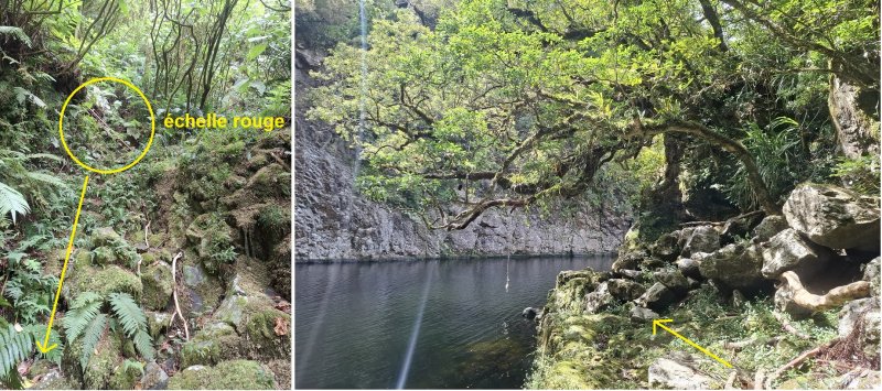 La randonnée commence à la Petite Plaine et peut se coupler avec une autre présentée alentour. Le sentier grimpe d'abord doucement en rive gauche du Bras Noir parmi les goyaviers qui envahissent de plus en plus la forêt de Bébour ou de Bélouve. Il n'est pas évident à découvrir de prime abord mais en gardant à l'esprit qu'il est proche de la rive droite et que des prairies privés empêchent de partir trop loin, on le trouve sans beaucoup d'hésitations. On peut débuter par le lit du Bras Noir en marchant dans les herbes. S'il y a beaucoup d'eau, partir vraiment en rive droite (Photo 1). Le sentier est en très bon état et aucune chance de s'égarer puisqu'il suit sans discontinuer le tuyau de transport de l'eau captée dans la falaise, à la fin de la première partie (Photo 2). Echelles, cordes, passages sur racines ou étroits, quelques rares sensations de vertige sont les ingrédients de cette forte mais courte montée à flanc de falaise basaltique (Photo 4). Les paysages sur la Vallée du Bras Noir ou sur la falaise sont étroits mais très beaux (Photo 5 et 6). Durant la montée, ceux sur la cascade sont impressionnants et font craindre le vertige lorsqu'on s'en approchera (Photo 7). Le sentier est étroit, glissant et souvent masqué par les jouvences (Photo 8). Heureusement les passages délicats sont sécurisés par des câbles d'acier (Photo 9). On arrive en sueur aux falaises rocheuses proches des captages (Photo 10). Le coin est très humide et des petites sources jaillissent de partout (Photo 12). On rejoint le premier captage puis au deuxième quelques secondes plus tard (Photo 11). Après avoir profité des vues sur le bassin 60 mètres plus bas il suffit de rebrousser chemin pour retrouver un sentier aperçu en montant et le prendre à droite pour rejoindre très vite le fond du Bras Noir afin de le remonter vers la haute cascade. Le cheminement en période sèche est très aisé jusqu'au bassin, sur de gros rochers entourés d'arums (Photo 18). Attention cependant car ils sont gros et acérés, d'autant plus dangereux s'il a plu. Les eaux sombres constituent un excellent miroir qui peut donner lieu à de beaux clichés de reflets dans l'eau (Photo 19). Le cirque, vu d'ici, est impressionnant et on aperçoit plus haut le tuyau passant dans le vide près du sentier emprunté 30 minutes plus tôt (Photo 17). La falaise tombant à la verticale est infranchissable. Sa base est criblée de petites grottes difficiles à atteindre (Photo 20). Il faut alors reprendre à nouveau le même itinéraire mais ne pas emprunter le même sentier de remontée pour pousser jusqu'à la cascade en aval, très originale, qui se précipite par un siphon dans deux gouffres sombres et inquiétants (Photo 14 et 15). Les pitons plantés dans le rocher indiquent que tout le monde n'est pas impressionné par ces lieux insondables à l'œil. Ne pas manquer, avant de partir, la nature morte constituée de deux bois de rempart qui se croisent au-dessus des gouffres (Photo 13). Bien repérer sous le bois de rempart en rive gauche le très discret sentier qui remonte en forte pente rejoindre le sentier du captage, à deux pas de la première échelle rencontrée en montant. Les mains sont nécessaires mais les racines sont parfois bien disposées et l'escalade s'effectue sans danger. On reprend alors la descente le long du tuyau en guettant, à l'approche de la route, la petite sente qui dévale dans les racines vers les berges basaltiques du Bras à un premier bassin alimenté par une petite chute d'eau (Si on le manque ou si le niveau de l'eau est trop haut, il faudra rejoindre la route puis le départ du sentier botanique de la Petite Plaine). A partir de ce point, il faut toujours rester en rive droite et monter au plus près du ravin. La pente est très forte par moments et des passages discrets permettent de rejoindre les berges et surtout les cascades. Le sentier n'est pas toujours évident car il est surtout pratiqué par les canyonistes pour rejoindre les chutes les plus hautes. La carte ci-dessous prévoit un arrêt à la dernière montée qui suit une échelle orange placée presque à l'horizontale. Plus haut ce n'est plus de la randonnée et les tronçons qui restent sont laissés aux professionnels ou aventuriers responsables qui décident de poursuivre. Le retour au parking est agréable sur une courte portion de Sentier Botanique qui traverse le bois de cryptomerias très connu des amateurs d'accrobranche de Forestia avant son démantèlement. C'est désormais Acroplaine qui occupe une autre partie de la forêt de cryptomerias.