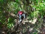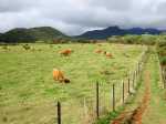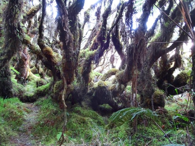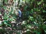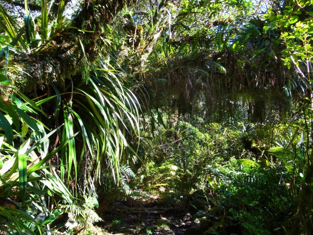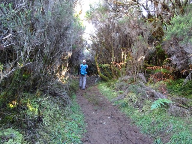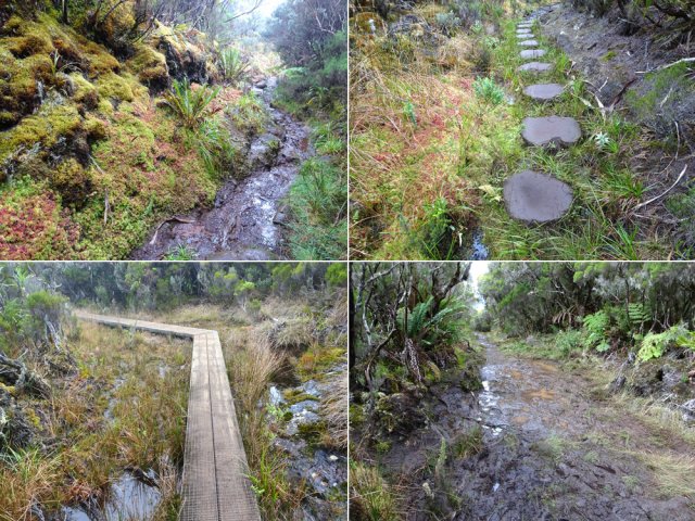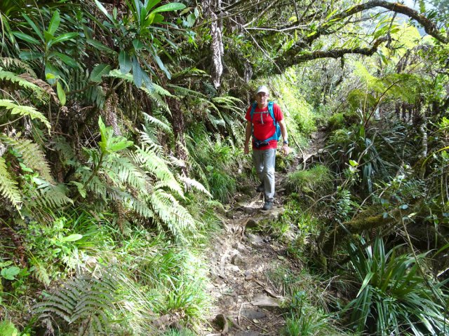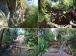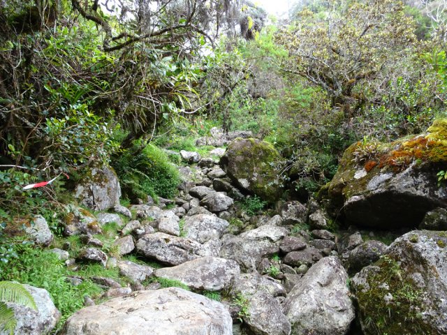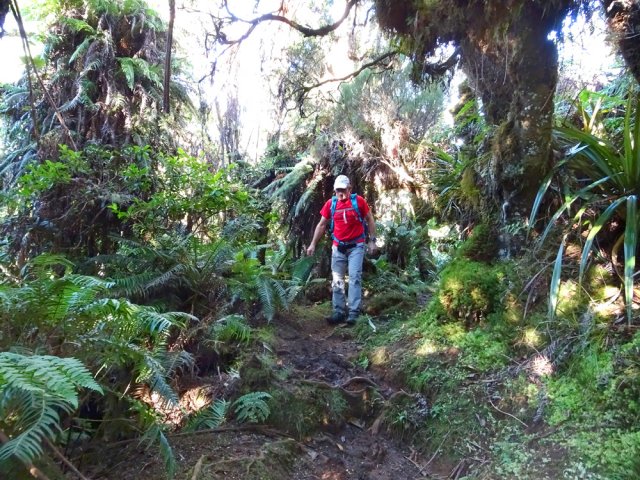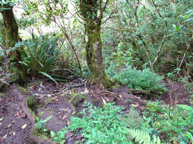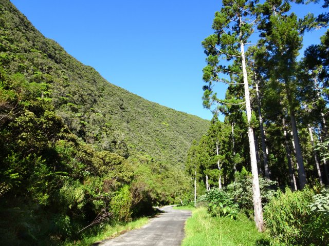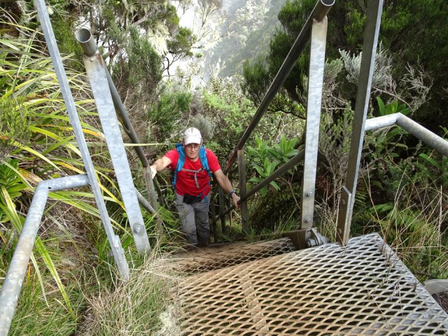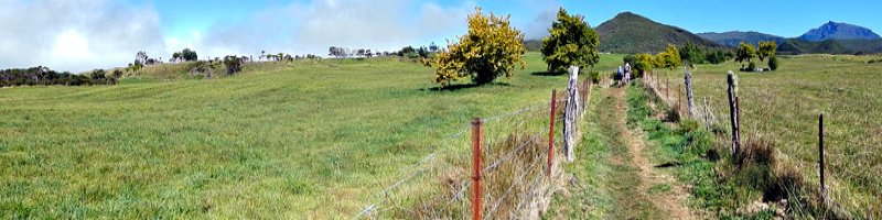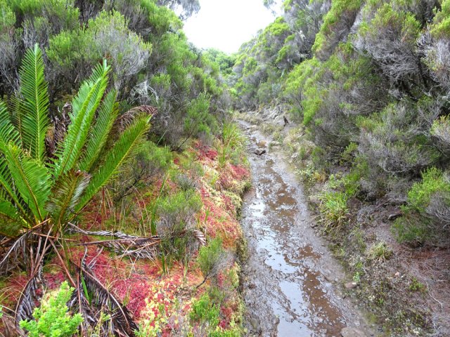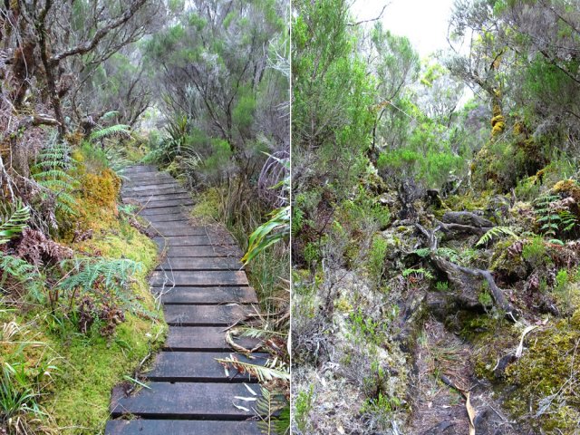 La randonnée débute au parking situé au plus près du GRR2 venant du Piton des Neiges. Partir à droite sur la piste désormais bétonnée à travers les prairies de Biberon où de nombreux troupeaux de vaches et de chevaux vivent au frais à 1600 m d'altitude. L'endroit est idéal pour se promener en famille avec de jeunes enfants. On bénéficie de la fraîcheur et de magnifiques panoramas sur le Piton des Neiges et les autres pitons de la Plaine des Cafres. La piste est large et permet un agréable échauffement à travers les prairies (Photo 1). Certaines accueillent de grands troupeaux, d'autres sont réservées à la récolte de foin (Photo 2). A la fin de la piste, le sentier forestier de Bébour débute dans les herbes qui peuvent être humides de la nuit. Il est un peu gras à travers les branles verts ou gris et les grands ajoncs d'Europe (Photo 3). On rencontre plusieurs petites ravines abritant des bassins d'eau noire entourés d'arums (Photo 4). Plus loin, le sentier traverse de magnifiques zones très moussues. Des petits sentiers tracés dans les sphaignes partent un peu partout à travers ces vieux troncs de branles recouverts de mousses (Photo 5). On se retrouve pour un temps dans les mêmes paysages que sur le Piton Tortue, l'ésotérisme en moins. Puis le sentier ondule à travers la forêt et effectue de petites dents de scie jamais importantes en direction du Piton de la Plaine des Cafres (Photo 6). Après trente minutes à cheminer sans difficulté dans cette belle forêt, on aperçoit quelques panoramas à travers la végétation, signe qu'on approche du Piton de la Plaine des Cafres. Une barre rocheuse marque le départ de la descente assez technique vers le Col de Bébour. Certains passages comportent de très hautes marches rocheuses ou sur les racines (Photo 7). De la barre rocheuse jusqu'aux dernières marches avant le col, il faudra souvent éviter ces roches et ces nombreuses racines (Photo 8). Lorsque la végétation le permet, on peut apprécier de belles vues vers le Piton des Neiges et jusqu'au Piton Textor (Photo 9). Après cette descente assez sportive, on parvient à la route de Bélouve. Partir à gauche et franchir le col. Entamer la descente avec de nouvelles et magnifiques vues sur la forêt de Bélouve, le Piton des Neiges ou le Piton de Bébour (Photo 10). La circulation est assez faible sur cette courte portion de goudron et l'on peut sereinement profiter des paysages verdoyants (Photo 11). Bifurquer à gauche au premier croisement et entamer la jonction avec le sentier par l'agréable route forestière de Duvernay. Il y a parfois des engins de déboisement mais en général, ce tronçon reste toujours agréable dans la forêt de cryptomerias (Photo 12). Une vaste aire de pique-nique peut accueillir une dizaine de familles qui pourront s'étaler sur près de 500 m sous des kiosques de qualité comportant pour certains d'énormes barbecues (Photo 13). En semaine, on a ici l'assurance de pique-niquer en toute sérénité. La piste bétonnée se transforme en chemin de terre et gravier qui chemine sous le couvert des arbres. Puis elle se finit au début du sentier en direction du Bras Chanson. Le départ s'effectue sous les cryptomerias sur un sol recouvert de jouvences qui cachent parfois le sentier (Photo 14). Lorsque les conifères cessent, ils sont immédiatement remplacés par une belle forêt de bois de couleurs. Certains spécimens centenaires et tortueux méritent une courte halte (Photo 15). La montée n'est jamais très forte même s'il faut parfois grimper un peu plus pour franchir quelques ravines. On retrouve tous les types de sentiers dans les cailloux moussus, la terre glissante, sur des marches en bois ou de racines (Photo 16). Une échelle aide même à passer une partie plus technique sur les rochers. Les portions les plus pentues sont souvent recouvertes de marches en bois (Photo 17). La beauté de la forêt fait oublier les quelques efforts à fournir (Photo 18). Après une forte descente, on est obligé de traverser une première fois le Bras Chanson sur de grosses roches et trouver en amont la suite du sentier (Photo 19). Sur l'autre rive, le paysage change un peu. Les branles sont majoritaires, la marche alterne entre portions couvertes de planchers et les autres envahies de racines glissantes (Photo 20). Attention à certaines planches vermoulues ou pourries qui peuvent céder sous la semelle. Marcher de préférence sur les poutres de soutien. On franchit à nouveau le Bras Chanson puis on retrouve la forêt de bois de couleurs. Plus haut, on rencontre le GRR2 descendant du Plateau Kerveguen. Partir à gauche et entamer une partie assez facile malgré les racines et cailloux. Le sentier étant en corniche, on bénéficie assez souvent de belles vues sur la vallée (Photo 21). Il se met ensuite à monter sur des lacets serrés, toujours sur racines et roches (Photo 23). Le sentier passe le long d'un rein étroit et rocheux. Quelques échelles plus ou moins longues aident aux passages délicats. L'une d'entre elles domine la vallée profonde du Bras de Sainte-Suzanne (Photo 24). Les points de vue sur Grand Bassin et la vallée sont parfois impressionnants (Photo 25). Si jusque là, on peut avoir trouvé le parcours boueux, on va bientôt savoir ce que c'est vraiment. Cependant, rien à voir avec le sentier du Trou de Fer. Le départ s'effectue sur de longues portions recouvertes de troncs d'arbres pour isoler de la gadoue. Puis ce sont les plaques de vieux basaltes constamment arrosés de sources ou suintements. Les talus sont couverts d'une magnifique couche de sphaignes colorées (Photo 26). Arrivent ensuite les grandes plaques de boue, parfois profondes. On peut les éviter en sautant sur les branches ou les cailloux, en les contournant par les talus, en marchant sur des caillebotis ou tout simplement en pataugeant (Photo 27). On traverse plus bas une zone plane et propre qui marque le début de la descente plus propre