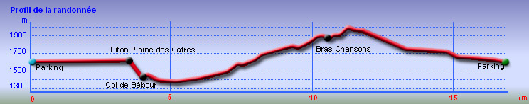 A partir de la RN3 entre Bourg Murat et la Plaine des Palmistes, prendre à gauche la route menant à Mare à Boue – Bifurquer à droite au premier croisement et stationner au parking – Suivre la piste bétonnée et poursuivre par le sentier forestier de Bébour - Descendre vers le Col de Bébour - Prendre la route vers Bélouve - Tourner à gauche sur la route forestière Duvernay puis la suivre jusqu'à la reprise du sentier qui monte vers le Bras Chansons - Au croisement du GRR2 qui vient du Piton des Neiges, bifurquer à gauche vers la Plaine des Cafres en longeant les remparts du Bras de Sainte-Suzanne - Terminer par quelques chemins boueux puis dans les prairies jusqu'au parking.