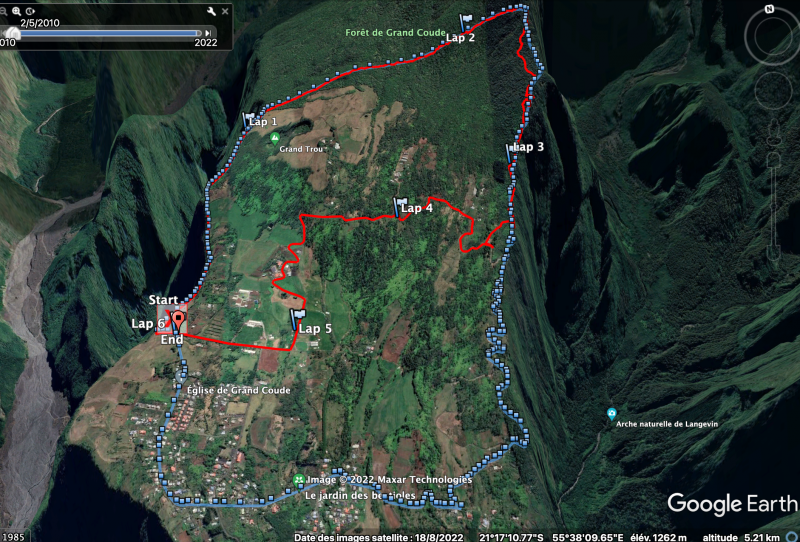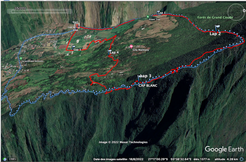 Ce charmant village d'altitude coincé entre les deux remparts imposants de la Rivière des Remparts et celui de Langevin était parcouru de sentier au début de ce siècle. Certains ont été fermés par les agriculteurs, d'autres sont tellement envahis qu'il devient aventureux de s'y rendre. Cette boucle n'a pas échappé à cette règle et la balade de l'an 2000 est devenue une sortie sportive qui impose de prendre un pantalon plutôt qu'un short. Heureusement, les randonneurs continuent à monter visiter le petit village en venant de Grand Galet ou de la Rivière des Remparts par l'Îlet Dimitile. La montée au kiosque se pratique encore puisque de plus en plus de marcheurs tentent la montée au Morne Langevin. Mais il est toujours possible d'effectuer cette boucle en gardant toujours à l'esprit qu'il faut marcher en ligne droite depuis le kiosque jusqu'au rempart sur Grand Pays. Tous les randonneurs qui se sont égarés n'ont pas suivi cette règle. On y a toujours les sublimes points de vue sur la Rivière des Remparts et de la Rivière Langevin mais on se griffe un peu plus. Profiter pour visiter au passage les Trous de Cissia. Le très vieux et délabré sentier de découverte qui débute au même endroit est quant à lui déjà mis de côté tellement la végétation l'a envahi. Le clou de la randonnée se situe au point culminant offrant de splendides panoramas sur Grand Pays, Grand Coude ou le Morne Langevin.