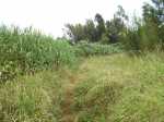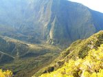 La randonnée débute au parking situé à une centaine de mètres de l'église et file directement vers le rempart de la Rivière des Remparts en passant devant la piste d'atterrissage depuis longtemps envahie par les herbes. Depuis le départ, on profite du magnifique point de vue sur le Morne Langevin (Photo 1). Rejoindre le rempart et partir sur la droite sur un sentier envahi et déjà un peu griffant. Plus loin, ce sont les herbes qui ne bouchent pas totalement mais obligent à chercher le sentier (Photo 2). Des herbes et des plantes envahissantes, on en trouvera également sur le sentier montant au sommet mais on passe tout de même facilement. Après avoir longuement longé le rempart dans une pente parfois assez forte, constituée de longues séries de marches (Photo 3) on passe près du sentier des Trous de Cissia. Le détour, si on ne visite que le premier maar, prend seulement 30 minutes. La montée reprend sur le même type de sentier et laisse peu de possibilités de repos (Photo 4). Il devient plus plat, passe sous quelques cryptomerias (Photo 5) et termine sa montée au kiosque esseulé qui vieillit sans visites (Photo 6). On arrive au panneau du Département et de l'ONF marquant le début du sentier de découverte ou celui qui mène directement au sommet du Morne Langevin. Délaisser ces sentiers et filer tout droit sur le coupe-feu qui n'a d'utile que le mot car la végétation l'a totalement recouvert depuis des années. Il suffit, à partir du kiosque, de suivre le coupe-feu qui file en ligne droite jusqu'au rempart de Grand Pays. L'expression "ligne droite" est primordiale car tous les randonneurs qui s'égarent et finissent au gîte Malmany ou ailleurs n'ont pas respecté cette consigne : voir la vraie ligne droite sur la carte correspondant au coupe-feu. Le sentier peut en rebuter plus d'un, surtout lorsqu'on manque d'habitude de ce genre de traversée (Photo 7). On monte souvent, on descend parfois mais on ne change jamais de direction. Le sentier y est étroit, bordé de fougères et de vigne marronne (Photo 8). Impossible de s'en échapper tant la végétation est touffue (Photo 9 et 10). Il est parfois difficile d'accès et franchit de nombreuses petites ravines glissantes dont une avec une longue échelle. Les branles verts ont poussé et les branches peuvent frôler les membres et vêtements mais jamais interdire le passage. Profiter de la belle forêt qui longe ce sentier et éviter de prendre les deux autres sentes rencontrées sur la droite avant d'avoir contemplé Grand Pays. Les points de vue sont pour cette raison assez rares en direction de Grand Coude qu'on aperçoit pourtant par moments (Photo 12). Mais en règle générale, les bois de couleurs et les branles verts bouchent l'horizon (Photo 14). Après une dernière descente assez forte et une remontée tout aussi sportive, on arrive en vue de la vallée de Grand Pays qu'on va dominer un moment (Photo 16). Bien profiter du spectacle grandiose de la vallée (Photo 17) avant d'entreprendre la descente sérieuse qui rejoint, beaucoup plus bas la route bétonnée du Chemin des Géraniums. Si le début est facile sur un sentier nu entre les branles, il est de plus en plus envahi de végétation (Photo 20) et d'arbres tombés lors des derniers cyclones (Photo 21). Ce sont les acacias noirs, en fin de descente, qui sont les plus fragiles et tombent en premier. Prendre son temps pour chercher des yeux le sentier qui ne disparaît jamais mais peut parfois en donner l'impression, principalement lors de la traversée de parties recouvertes de sabres péi Machaerina iridifolia (paille sabre, sabre marron) Cyperaceae -Endémique des Mascareignes (Photo 24) ou de bois de négresse, très nombreux dans cette descente (Photo 23). L'arrivée à la route s'effectue par une traversée de 10 mètres de canne fourragère aux feuilles coupantes (Photo 25). A partir de cette route, il y a plusieurs manières de regagner le véhicule ; en prenant à droite vers "les Pentes" puis en marchant vers le Sud pour descendre à l'église ou en tournant à gauche pour retrouver aux premières cases la Rue Emile Mussard puis l'épicerie du carrefour principal et enfin l'église (Photo 28). Remarquer au passage les prairies d'élevage de laitières (Photo 26) ou les rares champs de géranium qui restent dans cette région qui fut jadis un haut lieu de la culture de cette plante aromatique. Le thé est encore présent à l'état sauvage en bordures de champs à qui saura le reconnaître mais il a été domestiqué dans le village où on peut aller le voir de plus près et le déguster au Labyrinthe en Champ Thé.