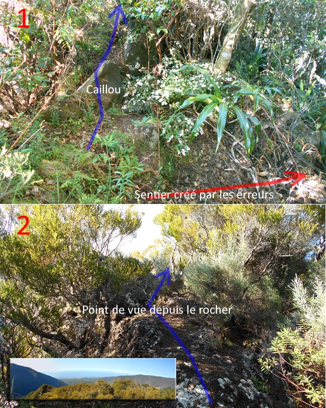 Une reconnaissance de ce circuit a permis de constater que plusieurs sentiers avaient été créés à force de petites erreurs d'aiguillage. RAPPEL : A la fin de la ligne domaniale venant du kiosque, on franchit une petite ravine assez profonde. Il faut remonter la pente assez rude et poursuivre sur le sentier qui fait un coude vers la droite en se rapprochant au plus près du rempart. Ne pas chercher à tourner à droite tant qu'on a pas atteint ce gros caillou à l'arête assez vive qui siège au milieu du sentier (Photo 1). Ne pas tourner à droite avant ce caillou (trait rouge) mais remonter pour atteindre le rocher dénudé entouré de branles verts (trait bleu). De ce rocher, on a un panorama de 180° sur Saint-Joseph et Grand Coude (vignette de la photo 2). Tant qu'on n'a pas admiré ce panorama, on ne réfléchit pas. Après le panorama, poursuivre dans la même direction vers le Chemin des Géraniums en longeant, au début, au plus près du rempart.