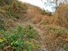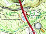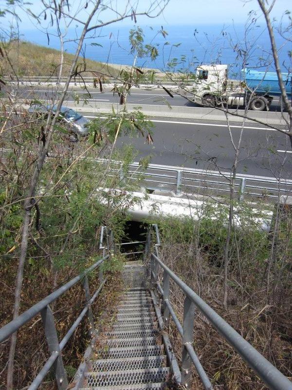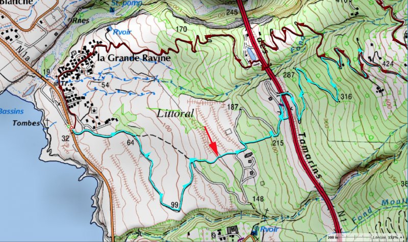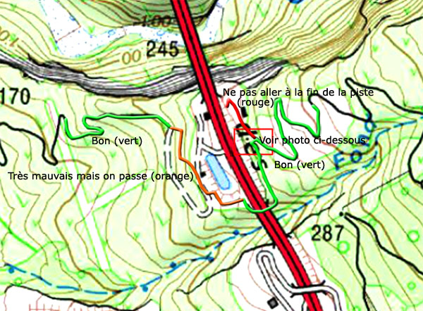 La carte représente la zone entourant le passage sous la Route des Tamarins pour franchir le pont de la Ravine Cocâtre. Les parties vertes correspondent à des portions de piste en très bonne qualité (Est) ou une piste envahie d'herbe (Ouest) mais où on ne se pose pas de question d'itinéraire. La partie rouge est à éviter absolument, voir photo ci-dessous. La portion orange représente la seule difficulté du parcours car la route de service de la société de la RN n'est plus visible. Les différents randonneurs ont tracé un minuscule sentier qui rejoint directement la fin de la descente le long du câble métallique servant de main courante (ouest de la RN) à la piste qui mène au village de la Grande Ravine. Cela représente environ 150 mètres de difficulté mais la trace reste visible sur un terrain pentu et glissant.