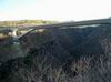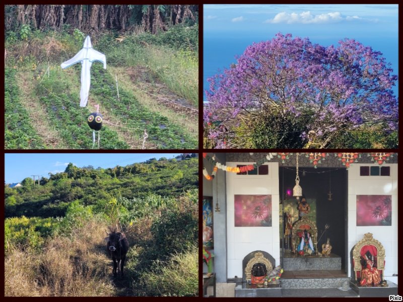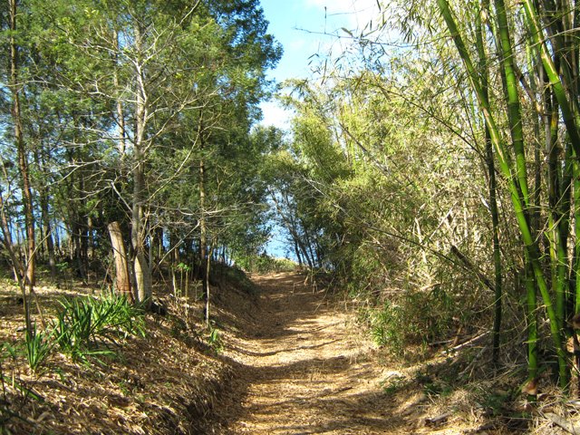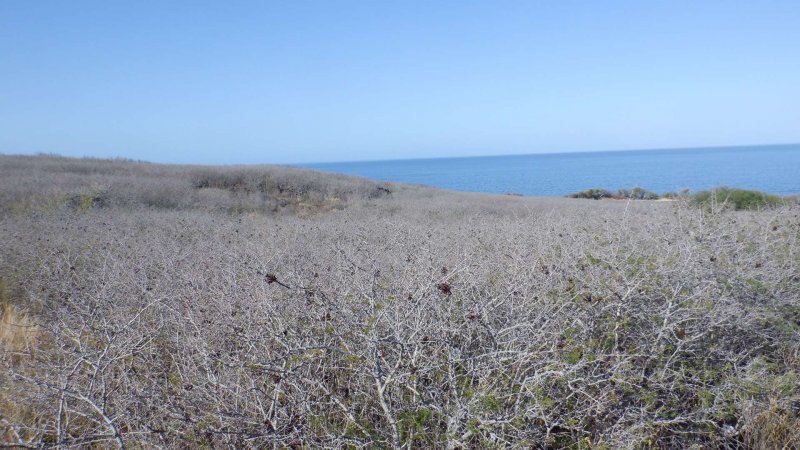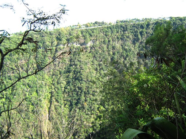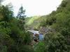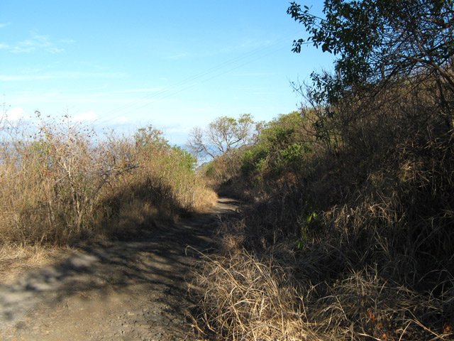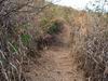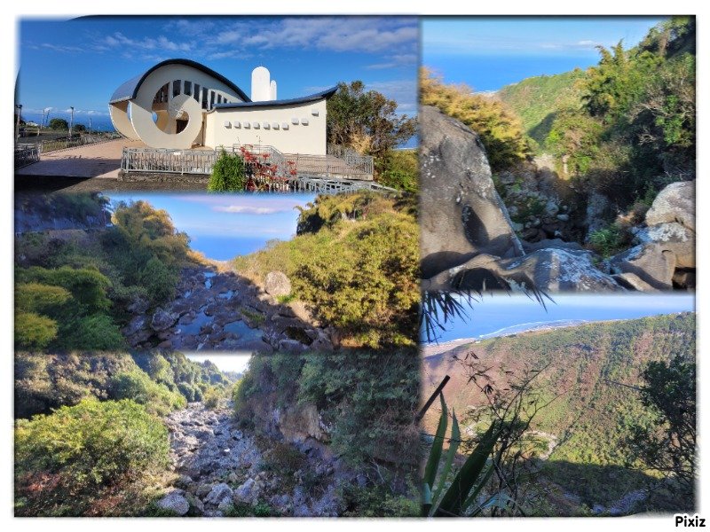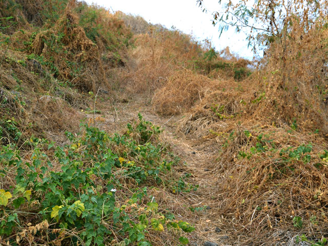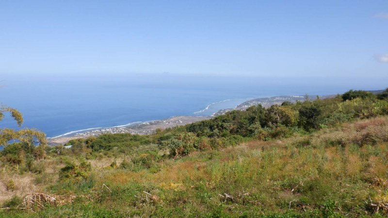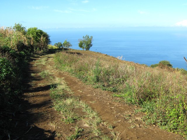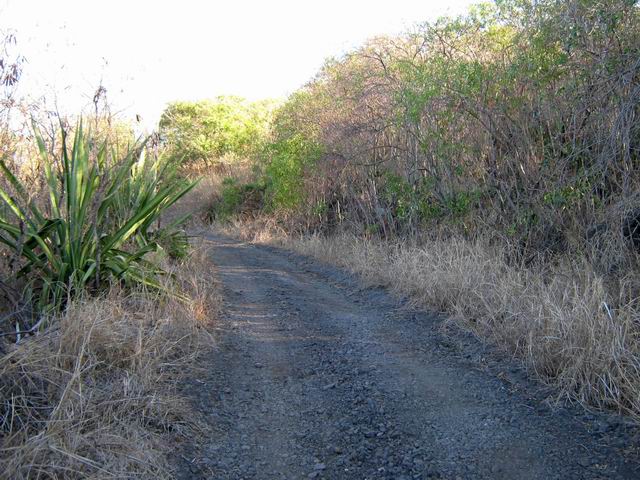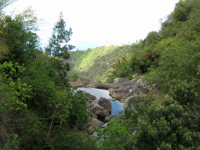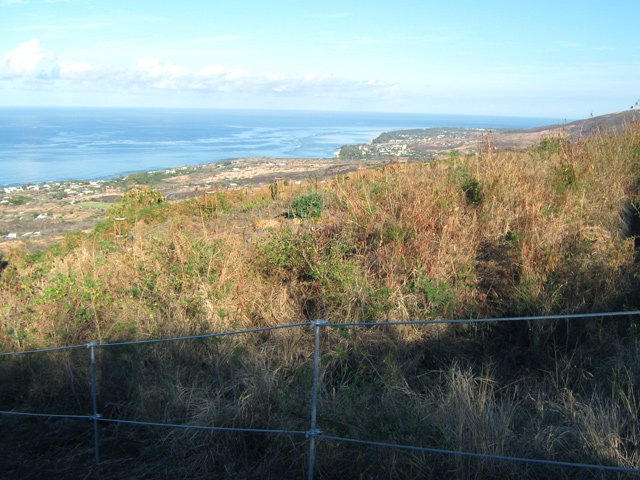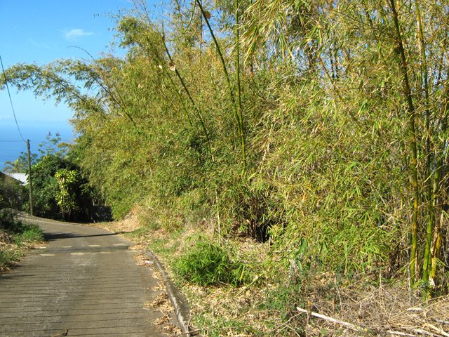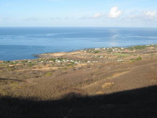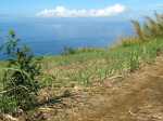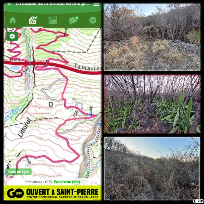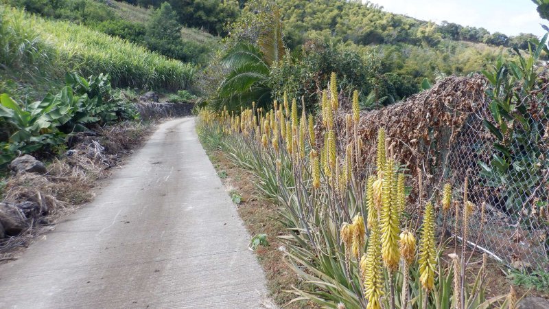 La randonnée débute au plus près de la RN1a avec quelques emplacements de parking possibles le long de la route, près de la piste qui rejoint l'ancien pont mais surtout sur le bord de la route qui mène à la Grande Ravine. Laisser à gauche la route de la Grande Ravine qu'on empruntera en fin de boucle et prendre à droite une petite route qui grimpe tranquillement en 4 lacets vers la route des Tamarins. Après 300 mètres de marche on pourrait prendre à gauche un raccourci mais il n'est pas toujours en très bon état surtout qu'il chemine dans des épineux et les herbes sèches qui peuvent rebuter en début de circuit. De plus, de nombreuses plantes se débarrassent de leurs graines collantes qui restent longtemps accrochées aux vêtements. Les panoramas sont nombreux sur l'océan et la côte mais s'adressent surtout aux amateurs de désert, à moins d'y passer après deux mois de pluies (Photo 1). On a du mal à imaginer qu'une grande partie de ces vastes étendues recouvertes d'épineux étaient jadis des champs de coton, de café ou autres récoltes du temps de l'esclavage. Que l'on prenne courageusement le raccourci ou la petite route, on se retrouve en moins d'une demi-heure de pente faible près du pont qui enjambe la voie rapide. Sur la gauche on aperçoit le pont de la Grande Ravine sous lequel on marchera dans six heures (Photo 2). Le petit pont qui enjambe la Route des Tamarins est un bien lourd investissement pour le peu de véhicules qui le franchissent (Photo 3). Ce sont souvent des 4x4 transportant les branches d'avocats marrons ou zépinards destinés à nourrir les biquettes. Comme la route s'élève, on domine la voie rapide, en général assez bruyante (Photo 4). Après le pont, poursuivre sur la piste caillouteuse jusqu'au premier croisement et obliquer à droite vers Piveteau (Photo 5). Cette piste où l'on est certain de marcher sereinement traverse cette végétation pauvre où aucun arbre remarquable ne viendra ralentir la marche (Photo 6). Elle arrive à un croisement qu'on empruntera pour le retour afin de créer une seconde boucle. Elle se finit à une route d'où l''on profite de nouveaux panoramas jusqu'à Saint-Leu (Photo 7) ou la Saline (Photo 8). Cette petite route bétonnée effectue quelques lacets jusqu'à un des hameaux de Piveteau (Photo 9). Pour éviter de rejoindre la Route Hubert Delisle par la route, ne pas manquer la piste qui débute au-dessus du village. Elle monte dans les champs, les savanes desséchées ou les friches (Photo 10). Elle est plate ou en pente faible à travers les champs (Photo 11). Les fils électriques et quelques conifères annoncent la fin proche de la montée (Photo 12). La piste finit au Chemin Bénard, aux premières cases de la Petite Ravine d'où l'on rejoint la route sans difficulté en longeant des jardins, accompagné par les aboiements parfois violents des gardiens de cours ! Flâner le long de la route pour rejoindre le pont sur la Grande Ravine. On peut y voir des cases typiques, des jardins fleuris, des cultures et profiter d'un superbe panorama sur l'océan depuis les alentours de l'église de Cocâtre à la forme originale d'une clé de sol (Photo 13). On peut en faire le tour presque complet en longeant la rambarde pour profiter des multiples points de vue. Cette portion de goudron de 2 km est inévitable mais c'est sans regret qu'on parvient à la Grande Ravine. Lorsqu'il y a de l'eau dans la ravine, une très haute cascade se jette dans le fond de la vallée. Le fond est rocheux et l'endroit sauvage (Photo 14). Un petit sentier permet, à partir du pont, de rejoindre le fond de la ravine pour mieux voir le précipice creusé par la cascade (Photo 15). Si on ne veut pas marcher jusqu'au pont, bifurquer 50 m avant, à gauche, le long des hautes touffes de bambous longeant une petite route bétonnée (Photo 16). La route s'éloigne du rempart pour desservir des habitations puis le rejoint. Elle se poursuit par une piste étroite recouverte de millions de feuilles de bambous (Photo 17). Ces bambous créent une barrière visuelle empêchant de profiter du fond vertigineux de la ravine qu'on aperçoit tout de même dans les rares trouées (Photo 18). Il y a deux manières de rejoindre ce fond de ravine pour amateurs de sculptures de basalte et de bassins. En remontant la ravine, à sec sur de gros rochers à partir de la mer ou en descendant par la rive droite depuis le village par une forte pente le long du rempart (Photo 19) . La piste, après avoir traversé des champs de canne (Photo 20), se termine à la petite route qu'on aurait pu emprunter à Cocâtre. On rejoint Piveteau par de nombreux lacets. Ne pas poursuivre jusqu'à la fin de la route car elle se termine en cul de sac mais prendre à gauche dans un lacet pour franchir les deux petites ravine et rejoindre le croisement aperçu dans la montée. Reprendre en sens inverse la route qu'on vient de remonter récemment et retrouver un nouveau croisement également repéré dans la montée. Bifurquer alors à droite et rejoindre dans les hautes herbes le passage délicat expliqué et détaillé ci-dessous (Photo 21). Si on prend bien soin de tourner à gauche avant la fin du chemin, on passe sans encombre sous la Route des Tamarins en débutant par un long escalier (Photo 22). La seule difficulté de la journée se présente alors dans les 200 mètres qui suivent la traversée sous la route. Par manque de piétinements, il faut viser dans la végétation et repérer les meilleurs passages pour contourner la réserve d'eau de la RN1. La piste, assez bien entretenue après les travaux de la RN1, est presque bouchée et peut rebuter les moins habitués (Photo 25). Le retour au village de la Grande Ravine s'effectue sur une piste herbeuse qui serpente entre les faux poivriers, les acacias et les chocas dans une zone sèche et désertique (Photo 26). Ne pas manquer, dans le premier virage à gauche après la voie rapide, le point de vue sur l'ouvrage qui 