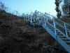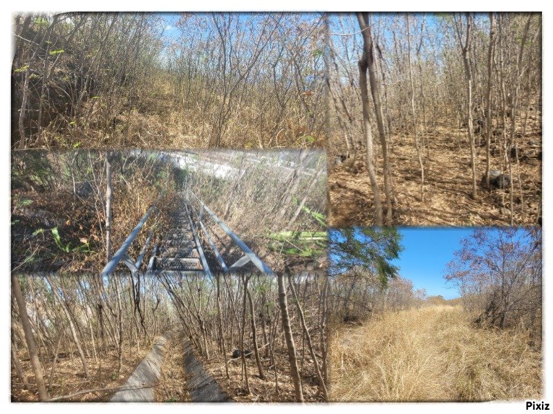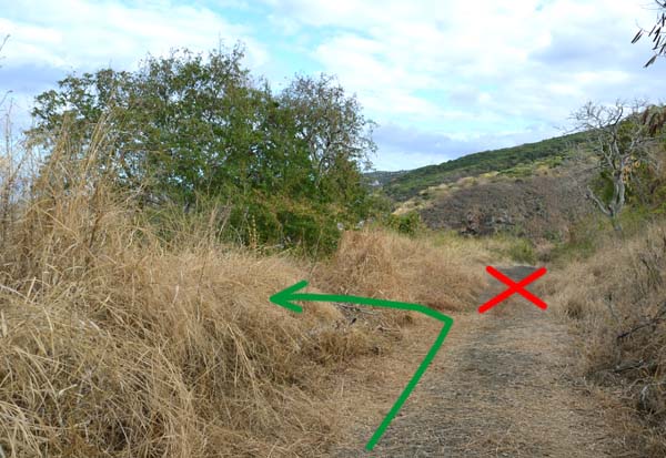 Cette photo représente la portion encadrée sur la carte ci-dessus. La croix rouge marque le début de la piste rouge. Il ne faut pas la prendre sous peine de se retrouver le long du précipice de la Grande Ravine. Bien repérer le bois noir des bas (A gauche avec des feuilles) et celui de droite qui est en plus mauvais état. Le sentier commence avant ces arbres, très discrètement dans les herbes, mais rejoint sans encombre l'escalier qui mène sous le pont. Passage désagréable le long de la portion en orange sur la carte, le reste s'effectue dans les grandes herbes mais le passage est encore possible