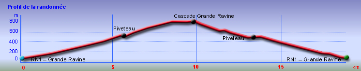 Se rendre à Saint-Leu si on vient du sud ou à la Saline les Bains depuis le Nord - De là, rejoindre le village de la Grande Ravine - Garer le véhicule au plus près de la RN1a et commencer la randonnée par la route qui débute plein Est et monte en lacets vers la Route des Tamarins - Passer sur le pont au dessus de la Route des Tamarins - Suivre ensuite le chemin qui rejoint plus loin la route qui remonte, également en lacets vers Piveteau - Une fois le village traversé, passer encore un grand lacet puis emprunter la piste qui débute au croisement de trois routes - Rester sur cette piste jusqu'à la D12 à la Petite Ravine - Tourner à gauche sur la D12 et la suivre jusqu'au pont qui franchit la Grande Ravine à Cocâtre pour voir le cassé de la cascade - Retourner sur ses pas de 50 mètres et prendre à droite la petite route bordée de bambous qui longe au plus près la Grande Ravine - Suivre ensuite la piste qui prolonge la route puis à nouveau une route qui se dirige vers l'Ilet de Piveteau - Un lacet plus bas, continuer tout droit pour rejoindre la route de Piveteau prise à l'aller - Redescendre par la route également empruntée à l'aller, puis un tronçon de chemin jusqu'au chemin déjà pratiqué - Tourner alors à droite pour une série de lacets qui amène sous le passage aménagé le long de la Ravine (voir explications supplémentaires ci-dessous) - Suivre ensuite le chemin qui aboutit au village de la Grande Ravine - Traverser le village et retrouver le véhicule au croisement de la RN1a.