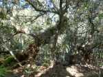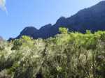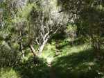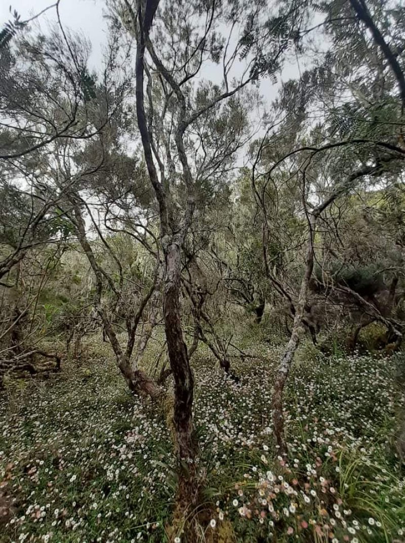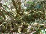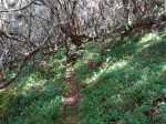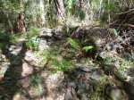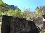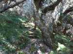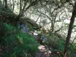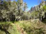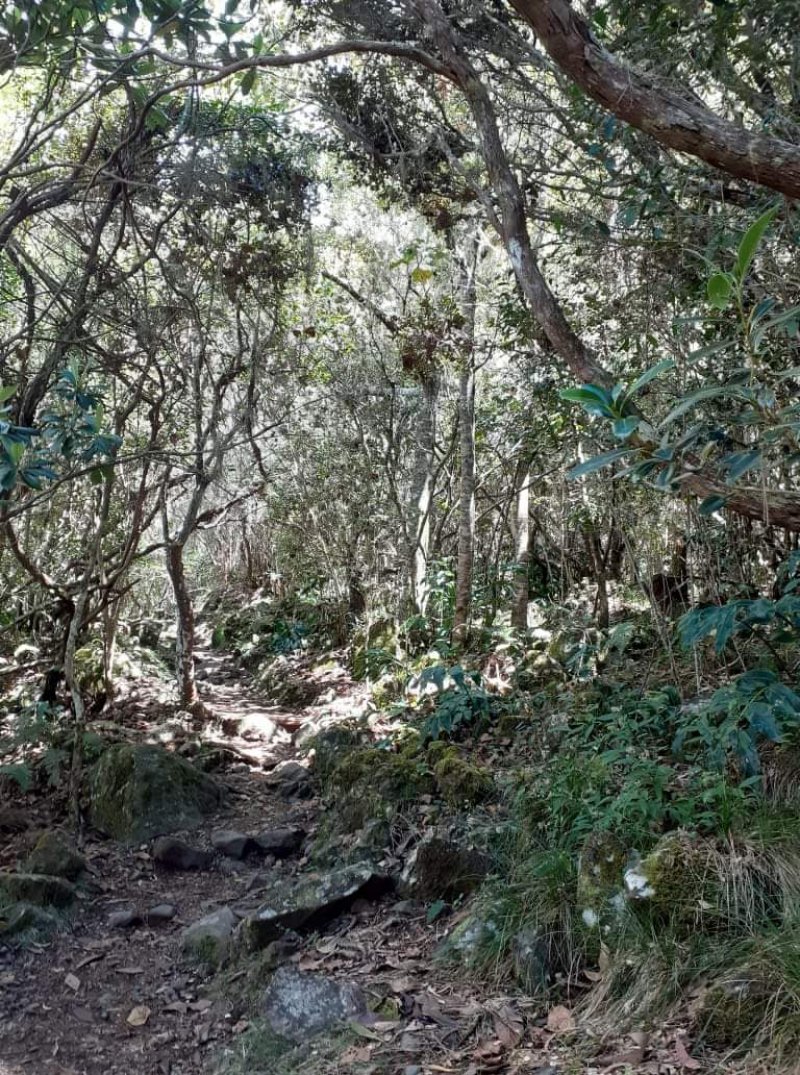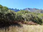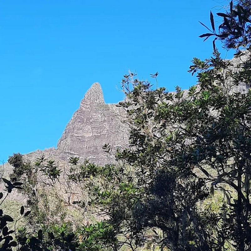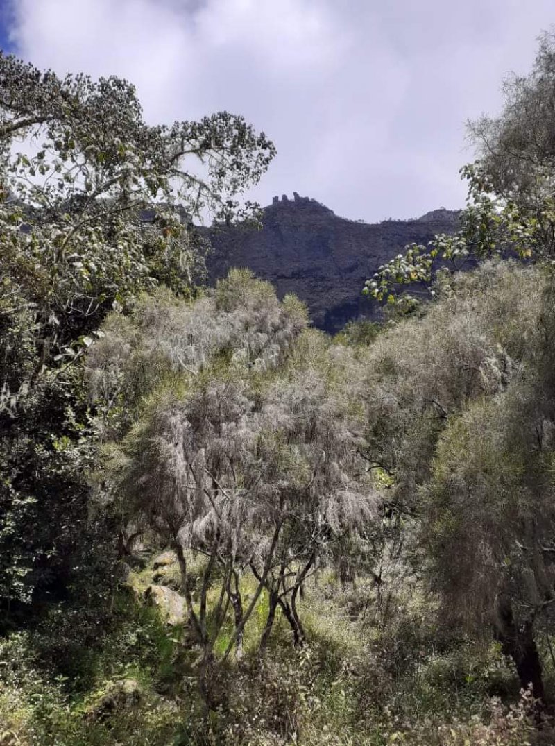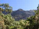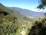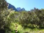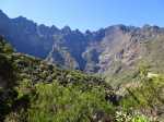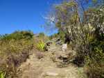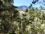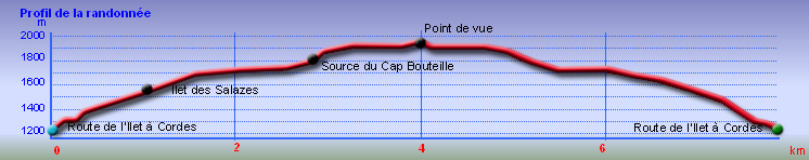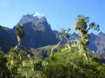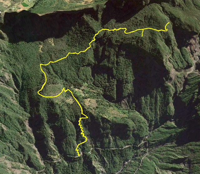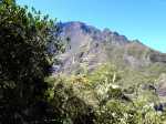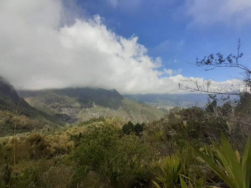 La randonnée débute à la route de l'Ilet à Cordes, aux escaliers raides commençant la montée assez sportive vers le Col du Taïbit. Les lacets sont nombreux pour franchir le rempart qui sépare la route du Plateau des Salazes accueillant un petit îlet. Il rejoint l'Ilet des Salazes, après une belle pente sur un sentier en marches d'escalier bétonnées, empierrées ou soutenues de rondins de bois (Photo 1). La végétation comporte les inévitables chocas, mais également de grands filaos, des eucalyptus et quelques bois de couleurs (Photo 2). Plus haut ce seront des essences moins communes dans les cirques comme les pins, quelques chênes et même des pruniers assez nombreux quand on sait les repérer. Les lacets courts et pentus sont indispensables pour escalader la pente. On bénéficie, tout au long de la montée de superbes panoramas sur les cascades Pitsa et sur les pentes entourant le cirque. Le sentier, très fréquenté, est toujours de bonne qualité, quelle que soit la pente. Après avoir longé une belle plantation d'eucalyptus, il passe au plus près du stand où il est possible de se désaltérer d'une délicieuse tisane chaude ou froide. Il ne faut pas oublier de laisser la pièce après avoir bu et rincé sa tasse au robinet. On passe l'îlet sans trop le voir, mais on peut en garder la visite pour le retour. Le sentier remonte assez fortement entre de grosses roches ayant roulé jusqu'au plateau lors d'un effondrement ancien. On bénéficie depuis cet endroit de magnifiques points de vue sur le Cap Bouteille surmonté du Gros Morne (Photo 3). Le terrain est presque plat en arrivant au plus près du croisement de Cap Bouteille, bien indiqué par un poteau de l'ONF. Partir donc vers la droite, passer près d'un gros pin et entamer une balade sans difficulté sur un tracé bien marqué. La marche s'effectue tout d'abord à l'ombre de grand eucalyptus (Photo 4). Puis le sentier traverse une zone comportant des ruines d'un ancien îlet abandonné depuis fort longtemps (Photo 5). On marche presque à plat jusqu'après le franchissement de la Ravine des Salazes. Le sentier devient plus caillouteux, étroit, et bordé de roches moussues (Photo 6). Il faudra s'habituer à ces pierriers parfois instables jusqu'au point de vue (Photo 7). Heureusement, quelques portions plates dans les herbes bordées de grand branles permettent de souffler un peu (Photo 8). Sur la gauche, toute la crête des Salazes affiche une falaise verticale qui impressionne les randonneurs qui osent affronter l'étroit passage. Du sentier, les trois pointes rocheuses paraissent bien petites, contrairement au moment où on se retrouve au pied (Photo 9). La végétation comporte beaucoup de fleurs jaunes parmi les branles (Photo 10). Le sentier monte de plus en plus et permet de profiter des vues jusqu'au Nez de Bœuf (Photo 14). Le dernier terrain plat rencontré à mi-parcours est couvert de branles cachés par les barbes de Jupiter et semble propice à l'installation d'un îlet (Photo 12). On tombe d'ailleurs très vite devant une nouvelles ruine de ce qui fut une habitation dont il ne subsiste que la cheminée (Photo 13). C'en est fini du plat et on pénètre dans une magnifique forêt semi-primaire. Les nombreux mahots, recouverts de fougères, de mousses et d'épiphytes sont tortueux en raison de la pauvreté du sol (Photo 14). La pente qui devient plus forte se passe sur de nouveaux pierriers qui peuvent être glissants par temps humide (Photo 15). Les grosses roches deviennent plus nombreuses le long du parcours et on arrive à une plus grosse que les autres, fendue en son milieu et bordée de fuchsias (Photo 16). Côté rempart, repérer un rocher se couvrant de plus en plus de végétation. On peut cependant y monter sans grand danger pour profiter de la Tête de Lion et des dernières vues sur Cilaos (Photo 17). Poursuivre, toujours en montée qui effectue même des lacets pour contourner les grosses roches. On distingue parfois la forêt du Cap Bouteille à travers les futaies (Photo 19). On tombe nez à nez avec des pruniers qui se voient de loin lorsqu'ils sont fleuris (Photo 20). Quelques mètres plus loin, deux poteaux de l'ONF indiquent le départ du sentier des Trois Salazes et sont plus facilement discernables que le cairn et la flèche qui demeurent sur les rochers. Laisser cette difficile ascension et poursuivre la montée jusqu'à la source toute proche. Un mince filet d'eau arrive juste à humidifier la mousse recouvrant les roches (Photo 21). Un peu d'escalade est nécessaire pour longer et franchir la ravine humide en amont de la source. Plus loin, la carte indique toujours le point de vue sur Cilaos mais le sentier a presque disparu totalement et l'écart peut s'éviter. Si on le tente, on parvient à une vaste clairière couverte de joncs d'où l'on a de belles vues sur les dents du Gros Morne (Photo 18). Le sentier longe ensuite un talweg humide herbeux où poussent de très hauts arbustes fleurs jaunes (Photo 23). Les premiers tamarins des hauts font leur apparition, difficiles à distinguer tant les troncs sont recouverts (Photo 24). Une dernière pente dans une belle forêt très peu envahie permet de se rapprocher du point de vue (Photo 25). L'espace dégagé offre un magnifique panorama sur les Salazes et le cœur du Piton des Neiges même si on ne distingue pas le fond (Photo 26). Avant de faire demi-tour, il est encore possible de poursuivre la montée sur un sentier qui devient de plus en plus étroit (Photo 27). De là-haut, les points de vue sont toujours là mais de plus en plus cachés par la végétation. Le sentier s'arrête mais les aventuriers pourront poursuivre en hors sentier le long de la crête vers le nord-ouest avant de prendre le chemin inverse pour regagner la route de l'Îlet à Cordes.