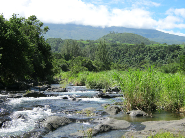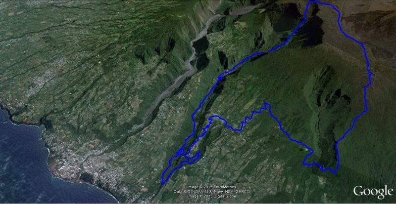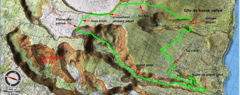 Il faudra 7 km de route pour cette très longue étape d'une traversée de l'île du Sud au Nord mais les paysages de la rive de la Rivière Langevin sont très beaux et font oublier le goudron ou le béton. C'est la crainte de ce trajet qui conduit de nombreux randonneurs à se faire déposer à Grand Galet alors qu'ils manquent de belles portions de rivière. Plusieurs raccourcis évitent cette route mais il faut savoir les dénicher sur la carte ou sur le terrain. (On peut citer le Pont Babet, Trou Noir, l'ilet Sylver et celui de Fond de Galet qui raccourcit à peine pour rejoindre Grand Galet sans passer par les lacets de la Cascade Langevin). Plus loin, ce seront les rives de la Grande Ravine avec son arche naturelle ou ses cascades, les filaos et les beaux paysages sur Grand Pays, l'interminable montée à la Plaine des Sables puis la Plaine elle même qui signera la fin des souffrances et l'arrivée proche au gîte. Cette très longue première partie d'une traversée de l'île à partir du Sud Sauvage dépasse largement les 2500 m de montée presque en discontinu et s'adresse à des randonneurs entraînés et motivés, surtout quand on sait que beaucoup débutent à la réserve d'eau de Grand Galet.