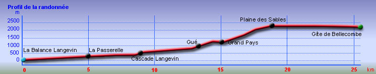 Se rendre à la balance de Langevin, à quelques mètres de la rivière - Se faire déposer ou garer le véhicule sur le parking - Débuter la randonnée en suivant la route qui longe la Rivière Langevin - Quelques raccourcis, bien indiqués sur la carte au 25000ème, permettent d'éviter des lacets - A la Passerelle, prendre à droite, franchir la rivière et poursuivre rive gauche jusqu'à la fin de la route - Franchir le nouveau pont métallique pour revenir à la rive droite - Rejoindre ainsi Grand Galet avec une halte à la Cascade Langevin qui est une des plus belles de l'île - Traverser le village et poursuivre sur la piste qui se dirige vers Cap Blanc - Passer les cascades Lafouillée, le gué, l'abri et la Chapelle de Cap Blanc avant d'arriver à Grand Pays - Franchir l'impressionnante muraille qui sépare Grand Pays de la Plaine des Sables - Traverser la Plaine des Sables jusqu'à la route forestière du Volcan - Filer tout droit jusqu'au sentier Josémont Lauret - Prendre à droite et rejoindre le Gîte de Bellecombe.
